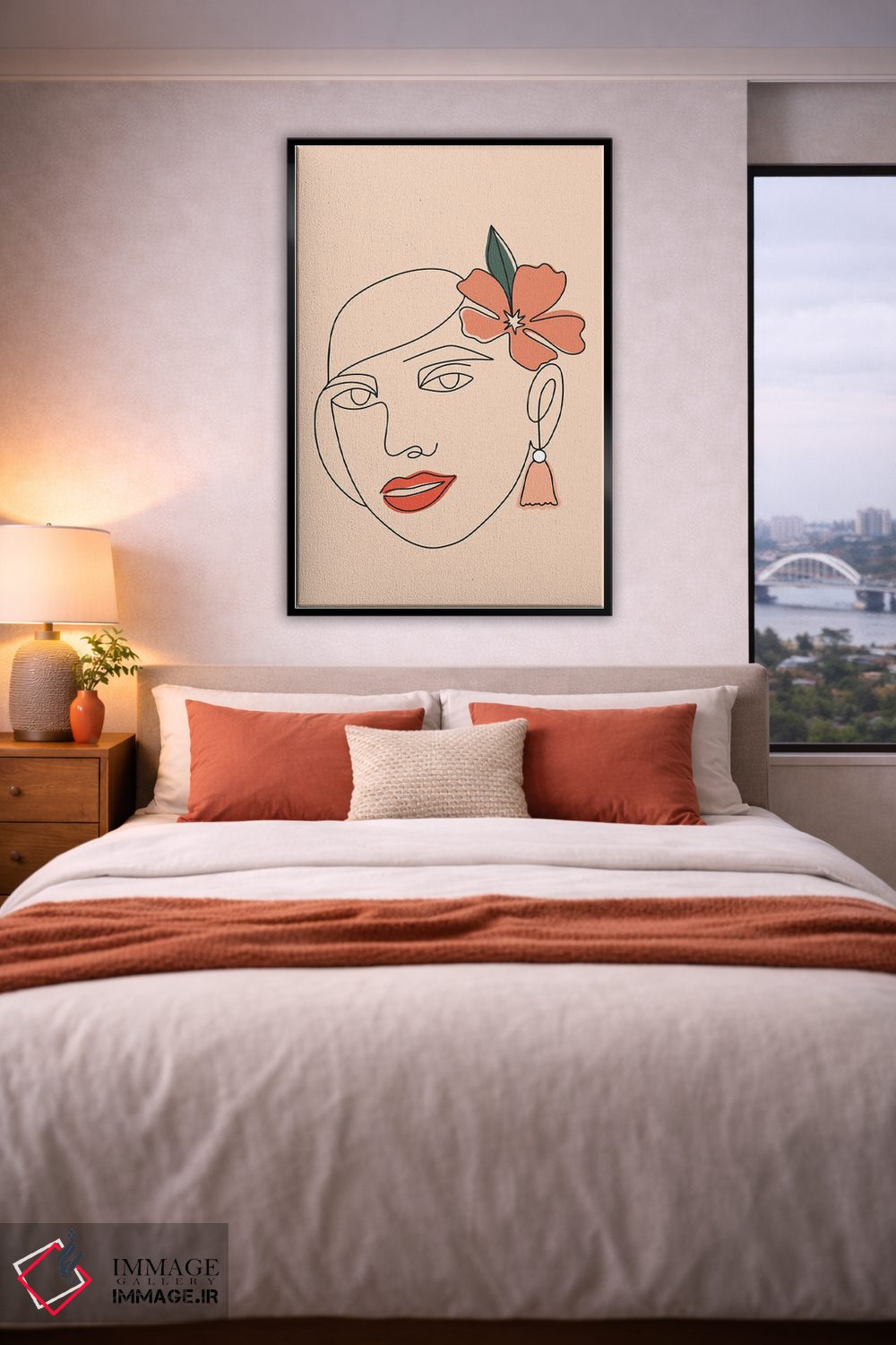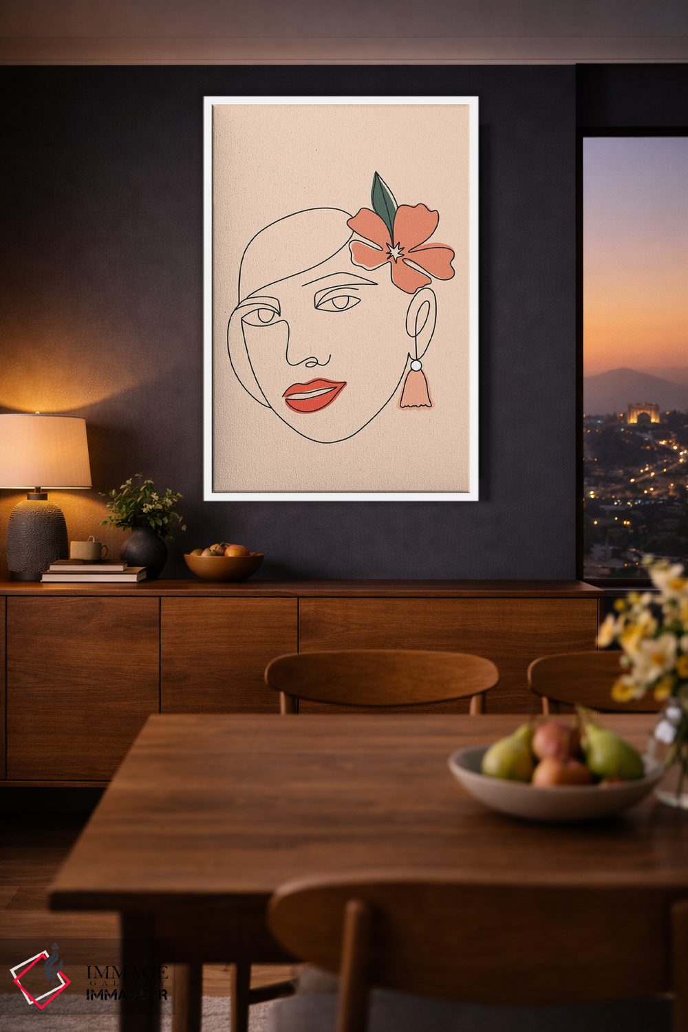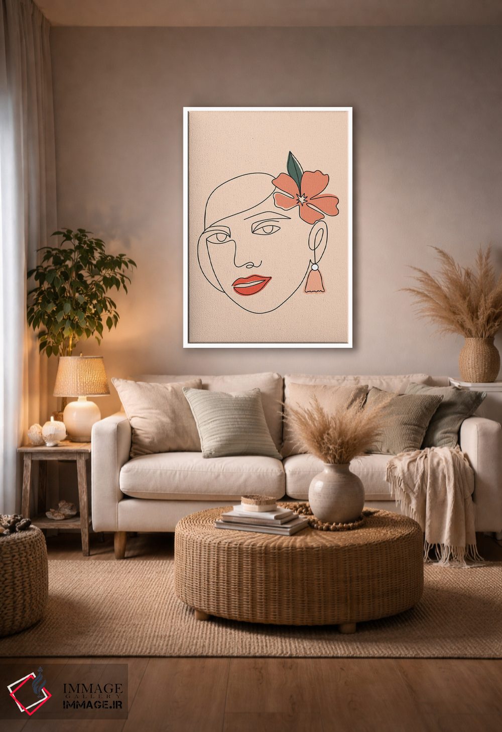 براساس پالت گرم اثر، قاب بلوط روشن (چوبی) پیشنهاد اول است و استخوانی ملایم مکمل. برای سفارشهای پروژهای با ابعاد و قابهای اختصاصی با ایماژ در تماس باشید.