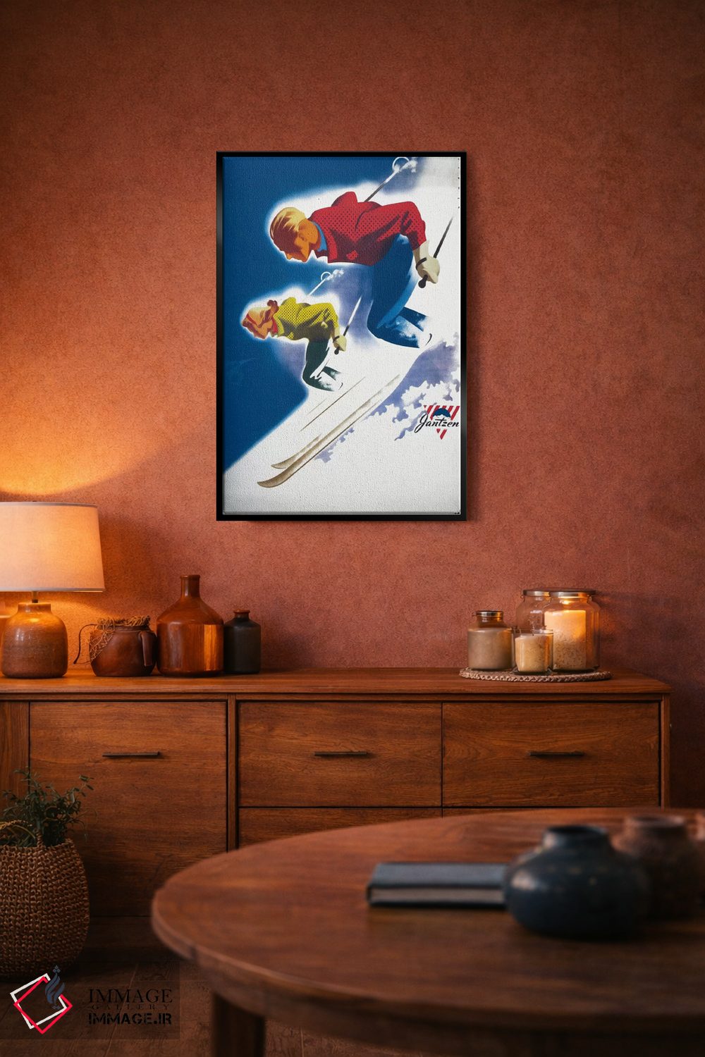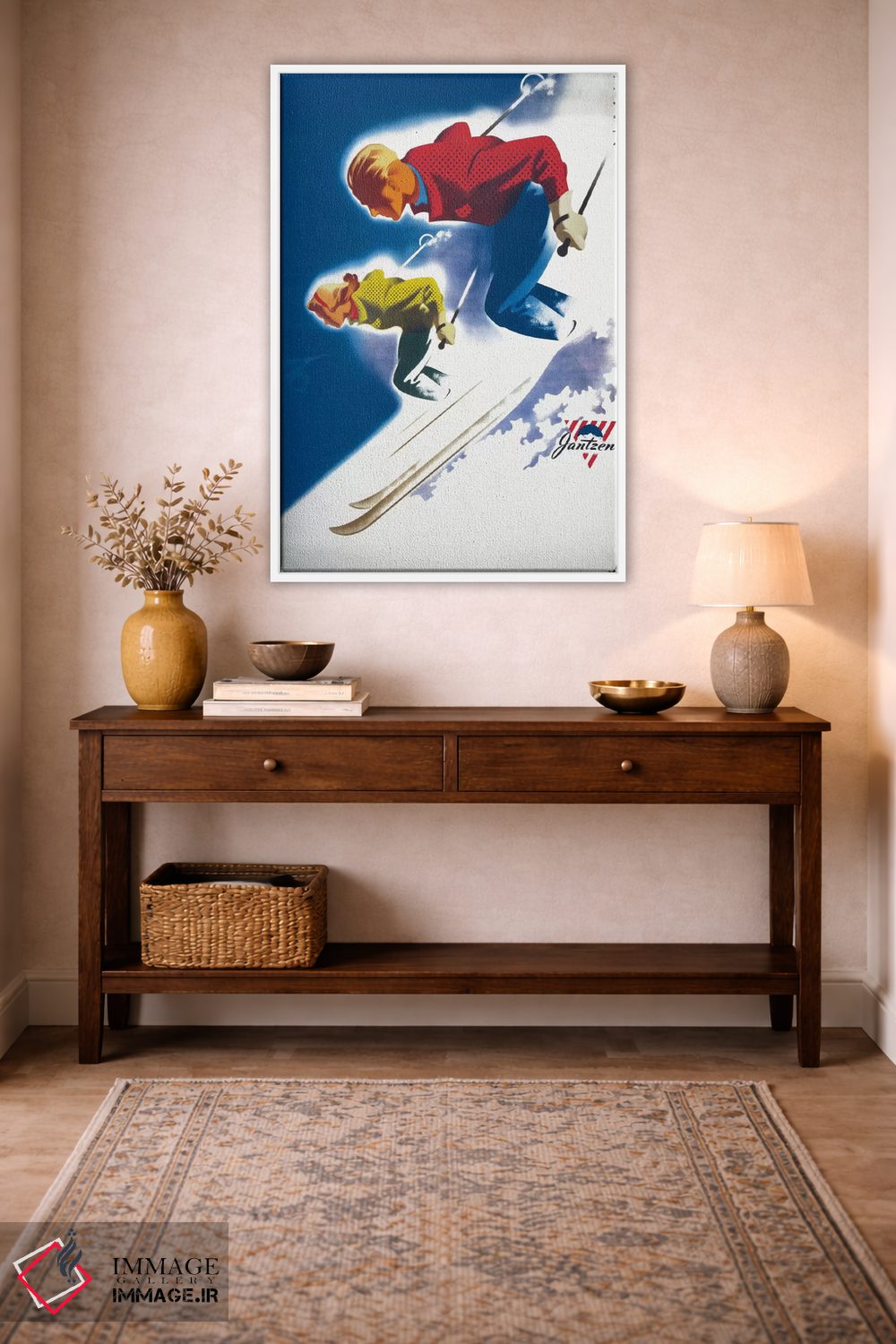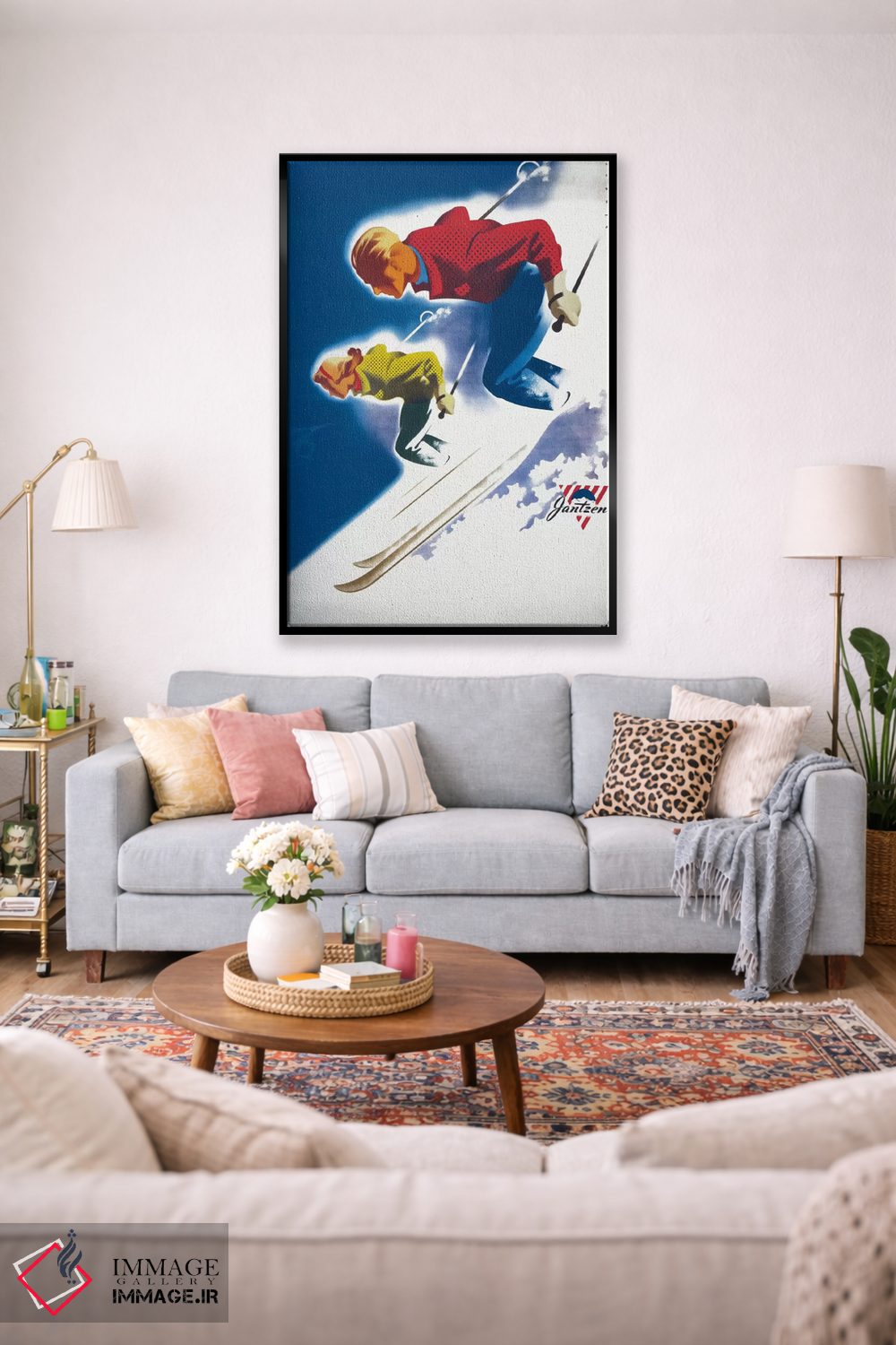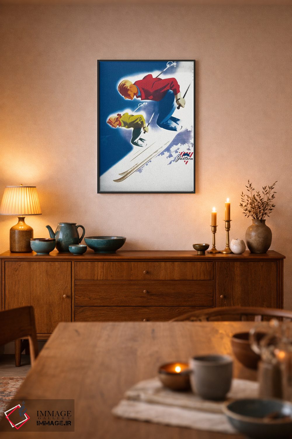 «جانتزن اثر بایندر مرد و زن، اسکی ۱۹۴۷» اثرِ «پرینت کالکشن (مجموعه چاپ هنری)» کنار پوسترها و قابهای ساده، یک ترکیب دلنشین و متعادل میسازد.