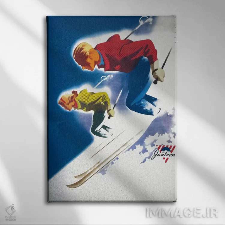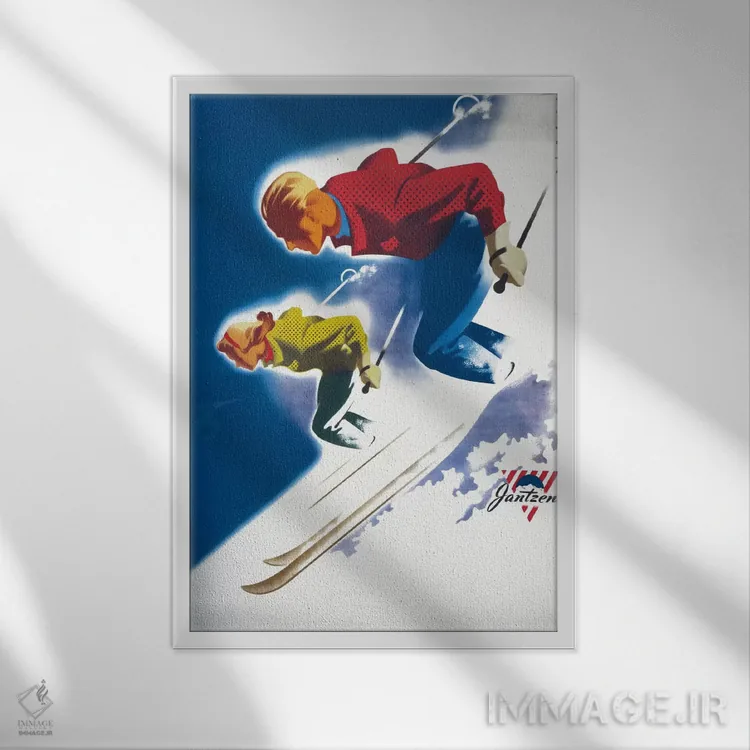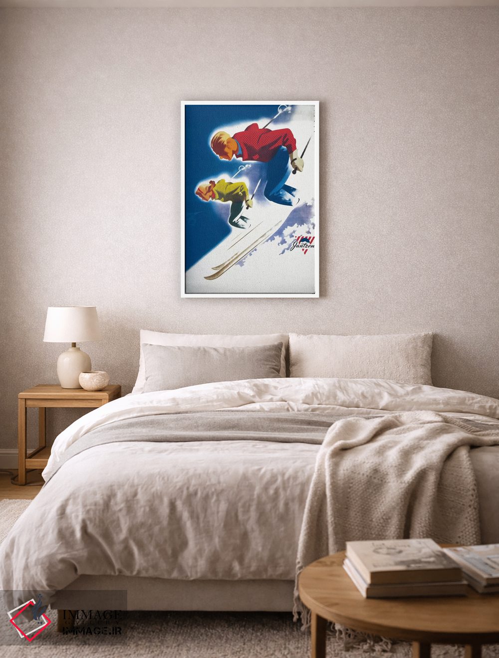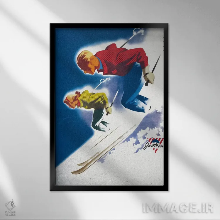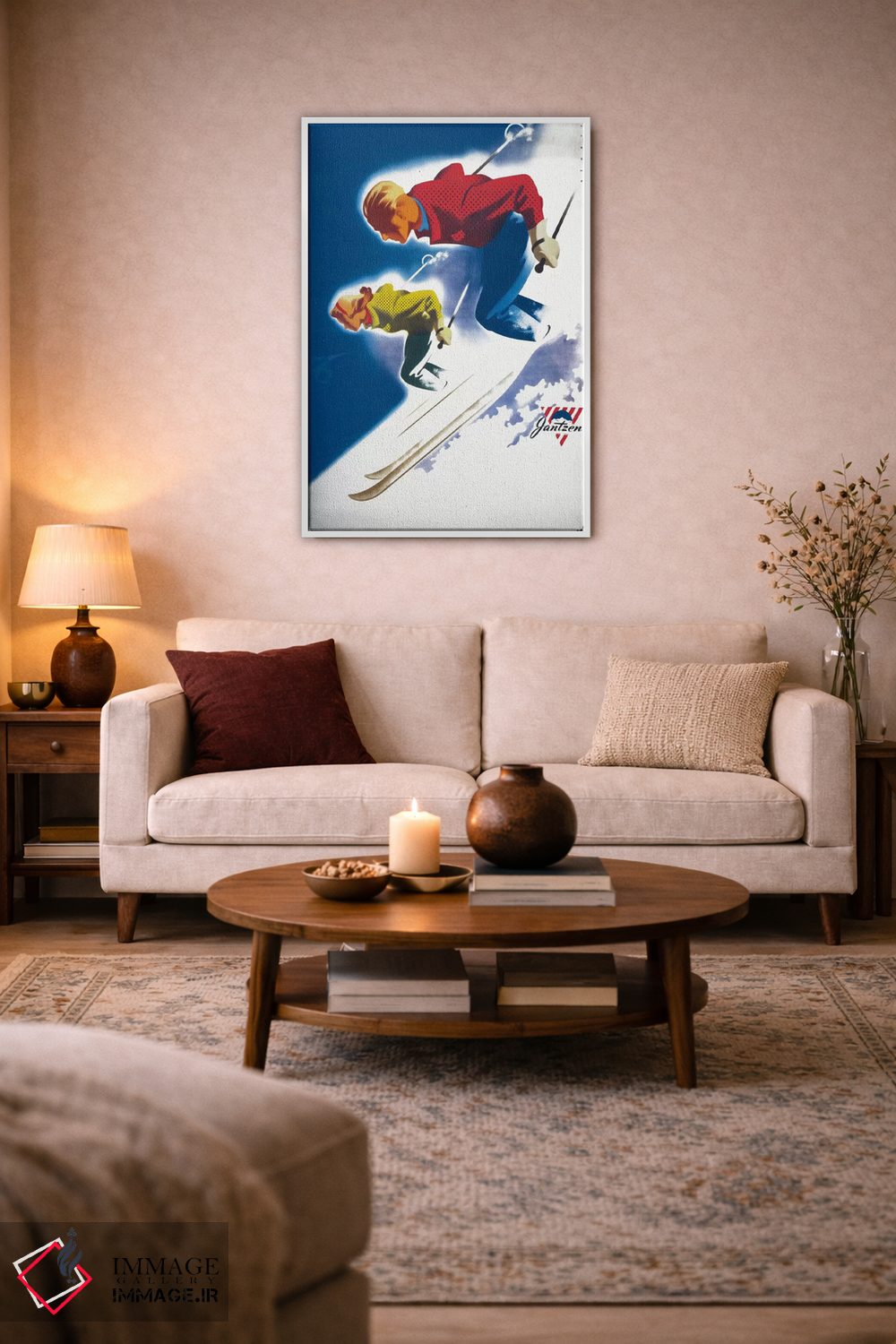 «جانتزن اثر بایندر مرد و زن، اسکی ۱۹۴۷» اثرِ «پرینت کالکشن (مجموعه چاپ هنری)» کنار پوسترها و قابهای ساده، یک ترکیب دلنشین و متعادل میسازد.