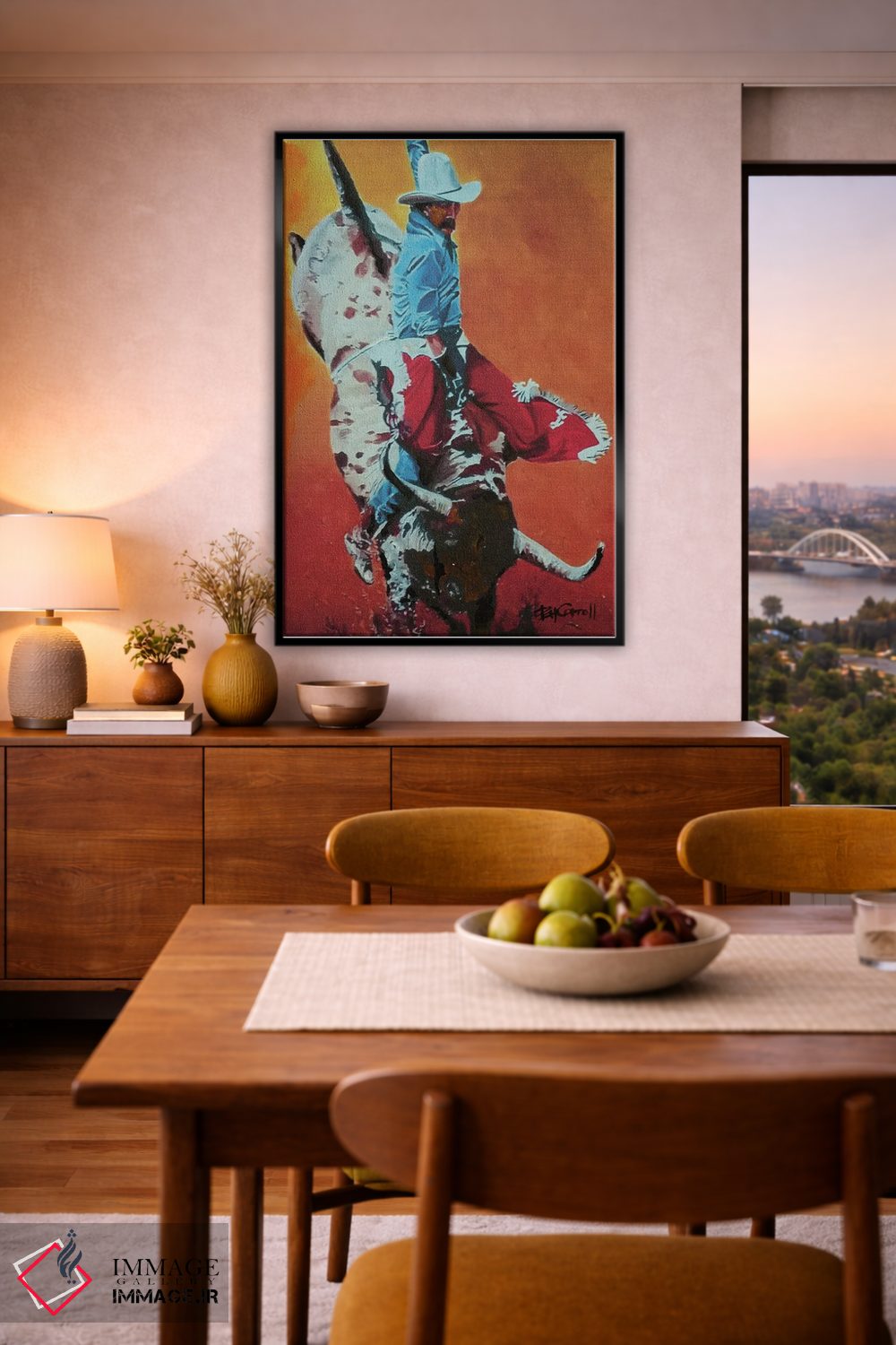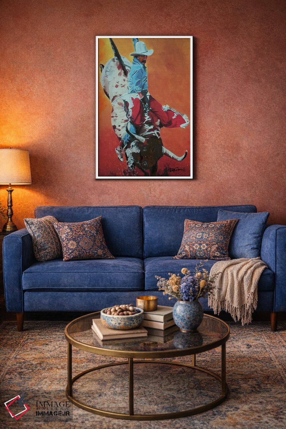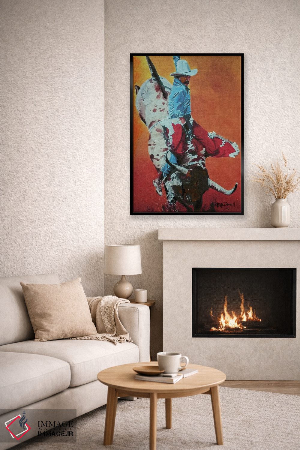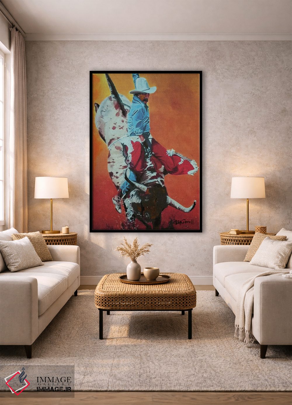 برای ترکیب با گلدانهای سبز، پارچههای ساده و نور گرم، «سوار گاو» اثرِ «پاتریشیا کارول» با موضوعِ این اثر انتخابی هماهنگ است.