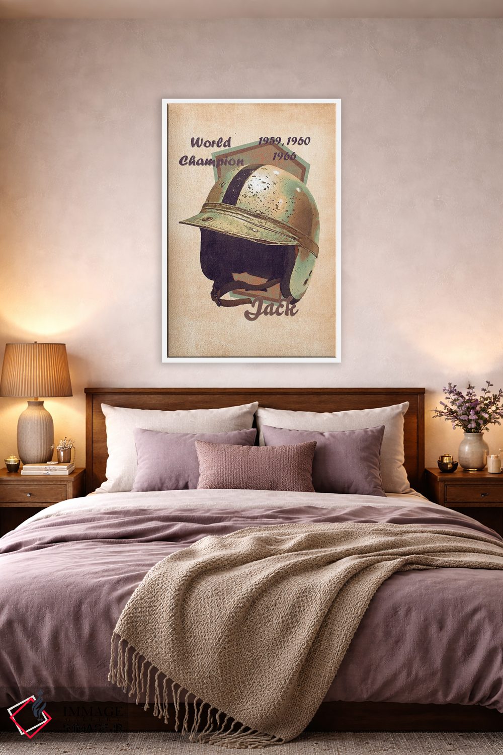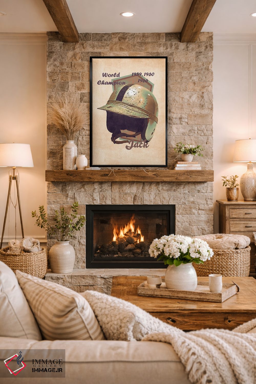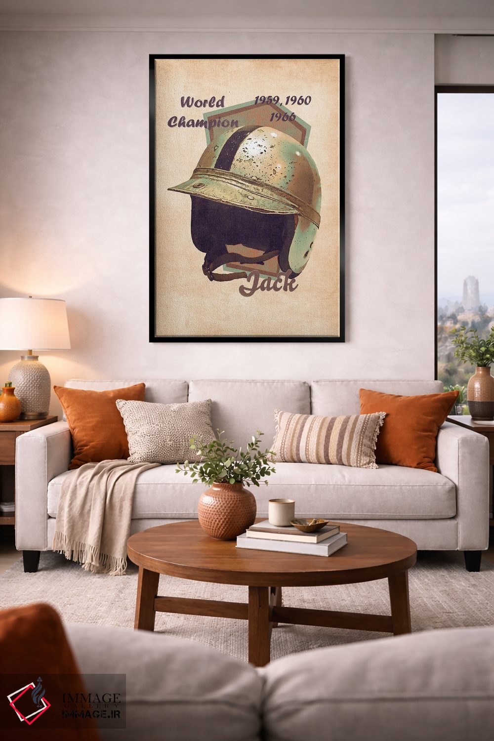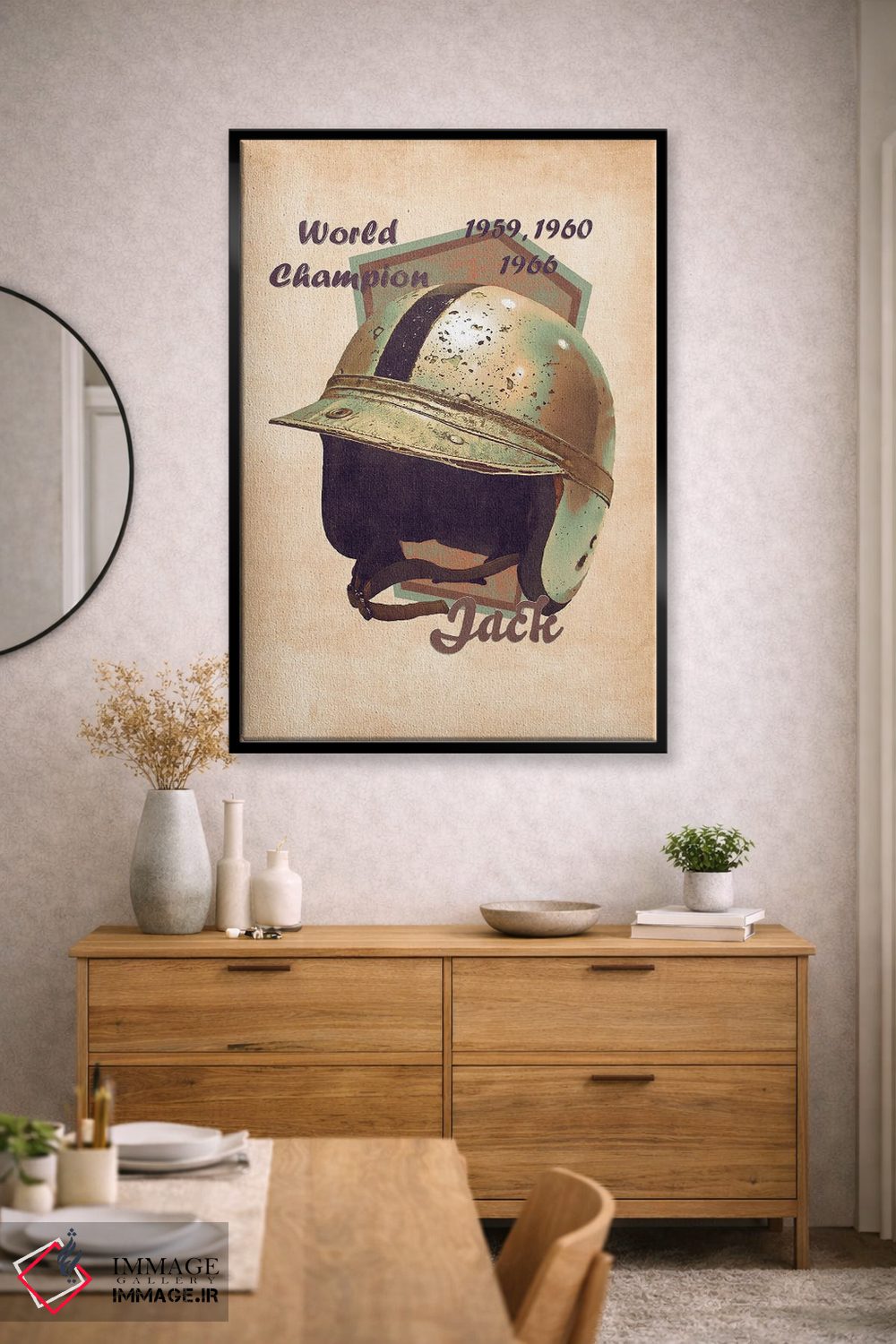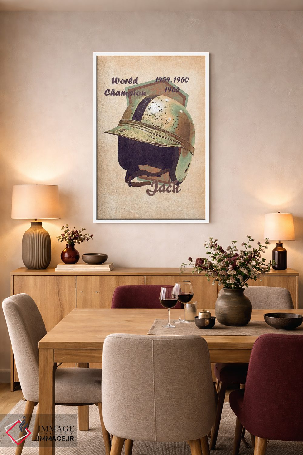 براساس پالت گرم اثر، قاب بلوط روشن (چوبی) پیشنهاد اول است و استخوانی ملایم مکمل. برای سفارشهای پروژهای با ابعاد و قابهای اختصاصی با ایماژ در تماس باشید.