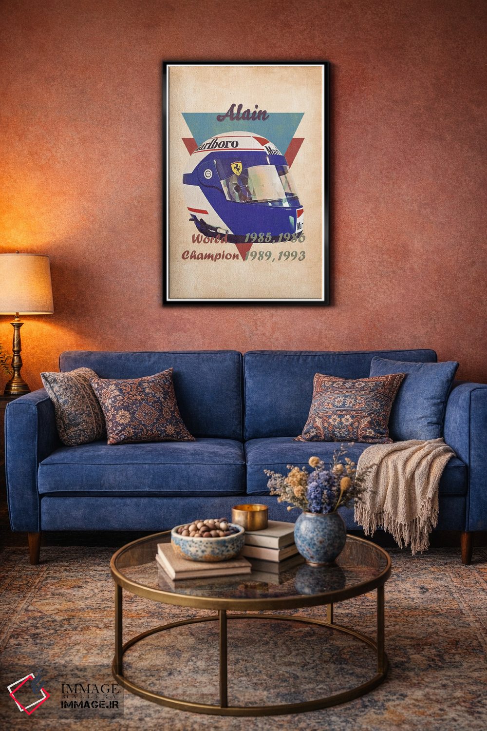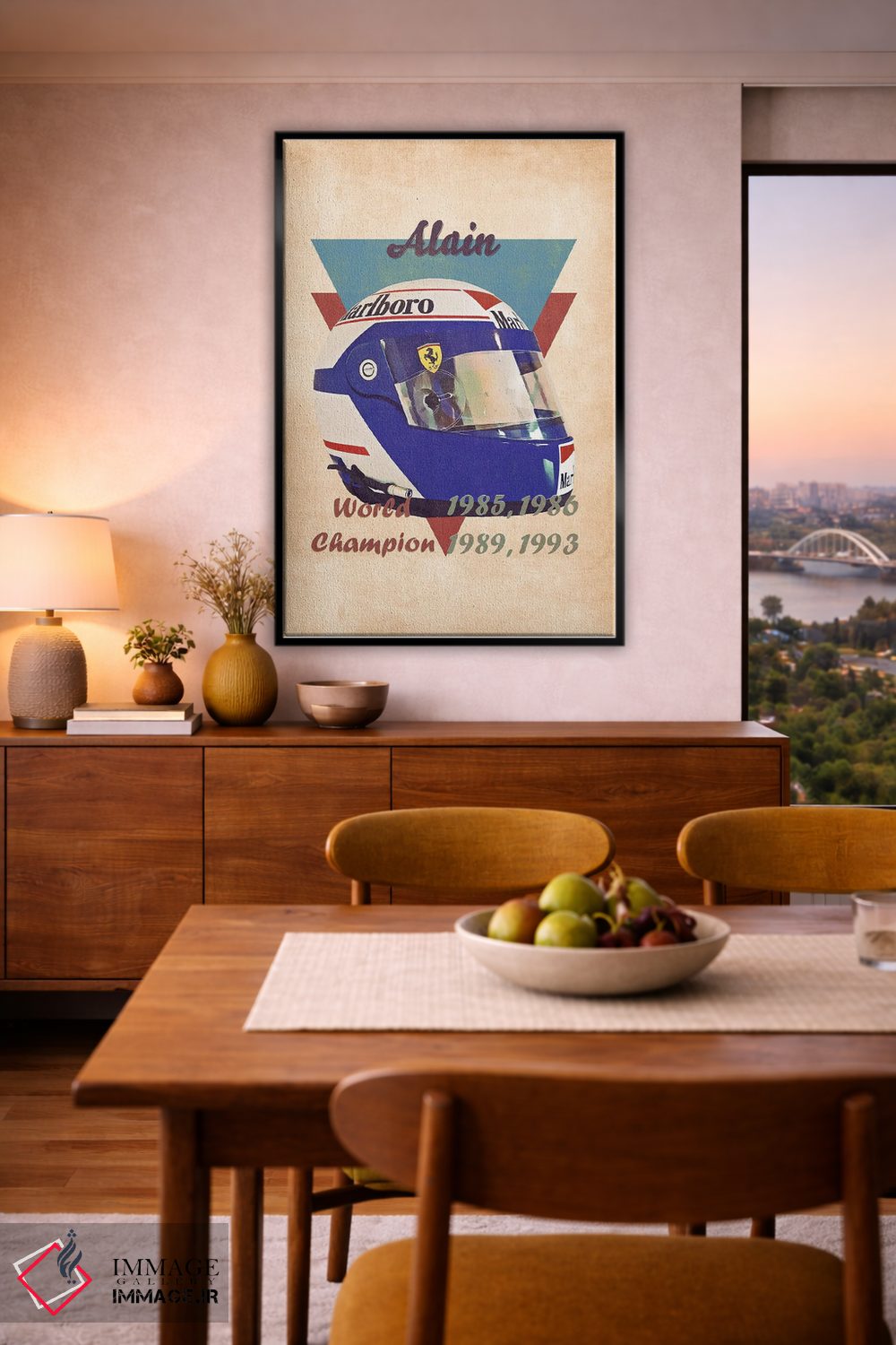 «کلاه ایمنی رتو آلن پروست» اثرِ «پاپ کالت پوسترز (پوسترهای فرهنگ پاپ؛ برند هنری)» یک قاب دکوراتیوِ خوشخوان است؛ این اثر در آن بهجای اغراق، با ظرافت و تناسب دیده میشود.