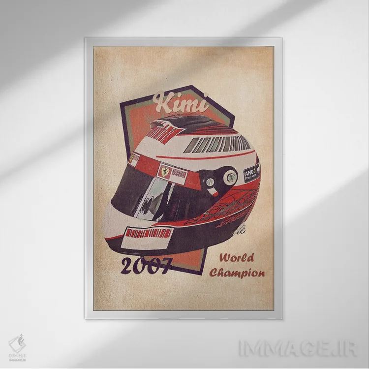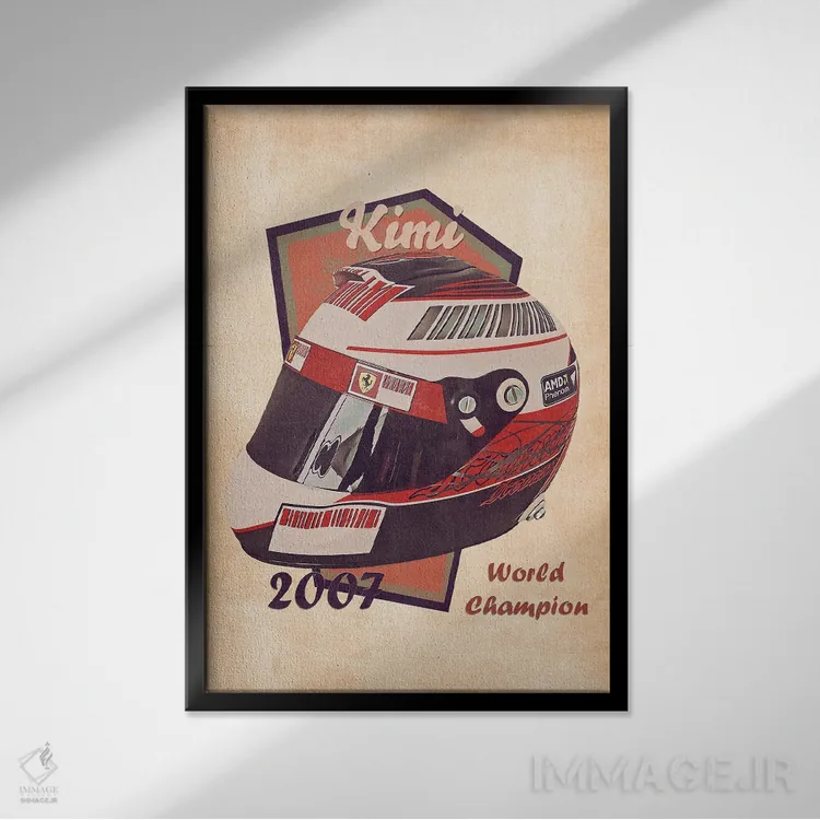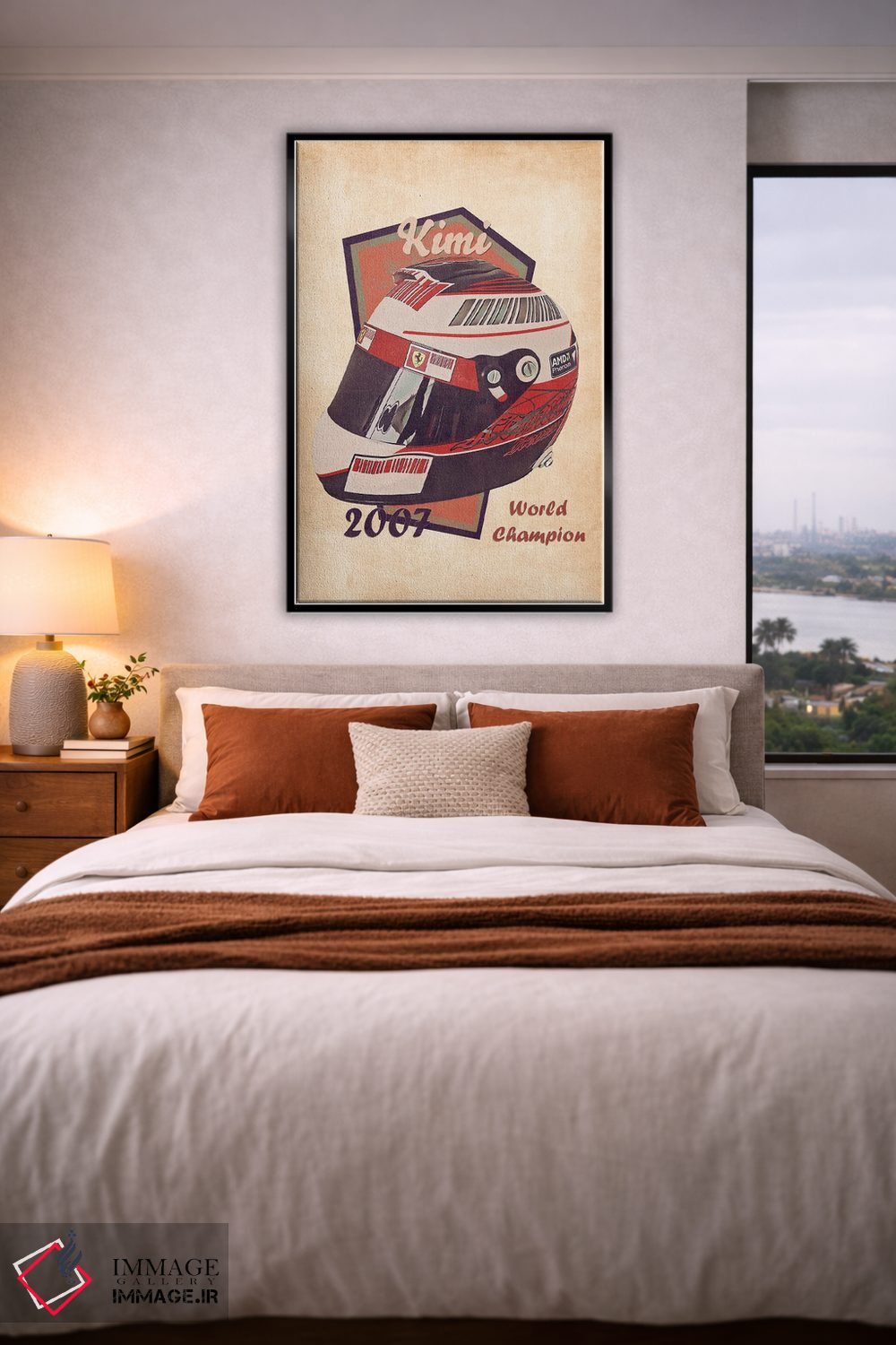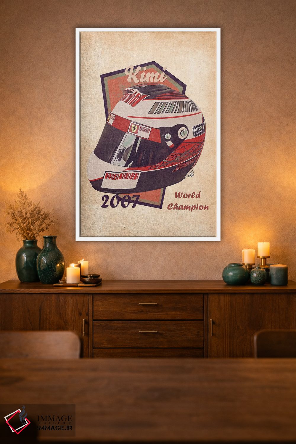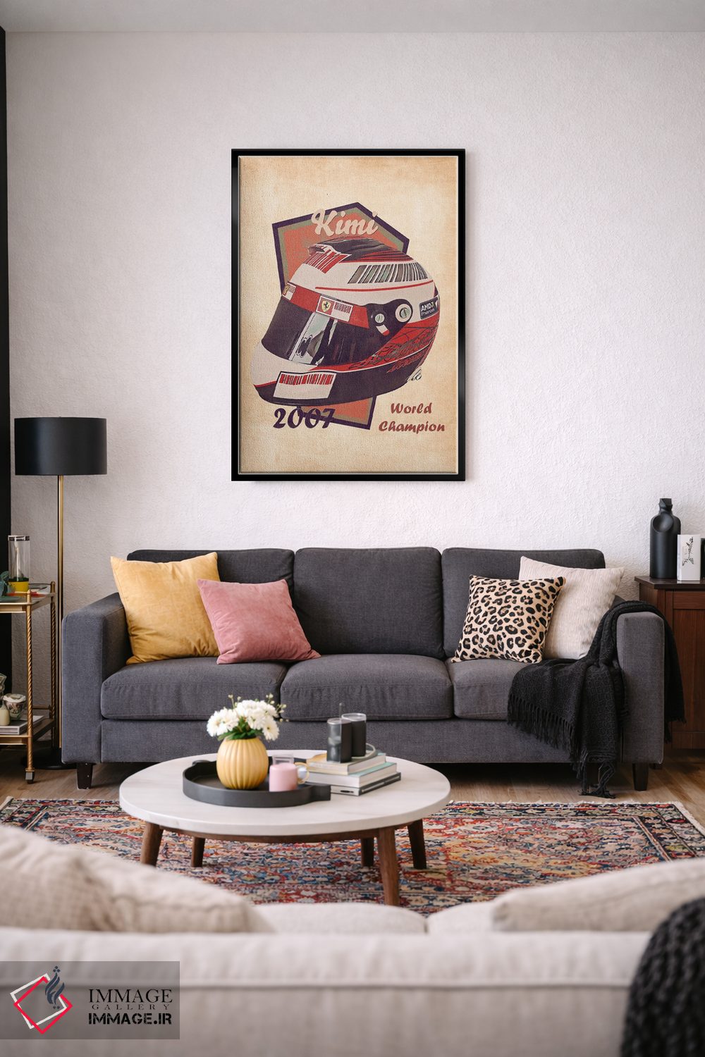 «کلاه ایمنی قدیمی کیمی رایکونن» اثرِ «پاپ کالت پوسترز (پوسترهای فرهنگ پاپ؛ برند هنری)» با حالوهوای این اثر و اجرای هنری، به فضا لطافت میدهد و برای کنار چوب روشن یا دیوارهای خنثی عالی مینشیند.