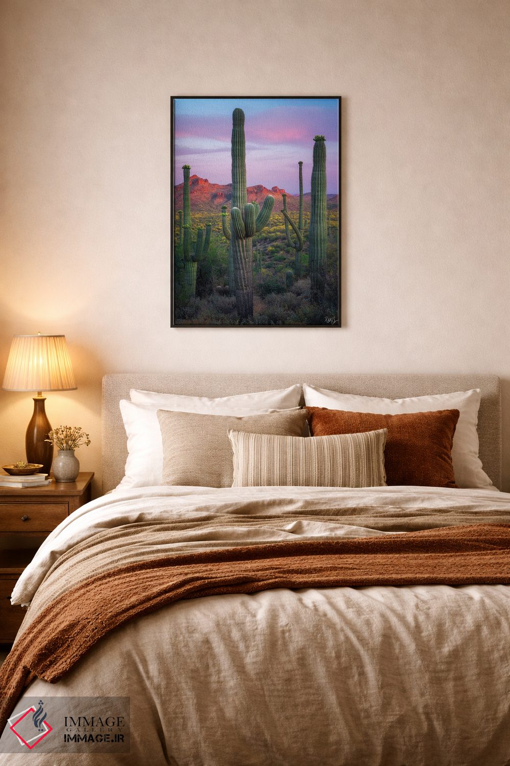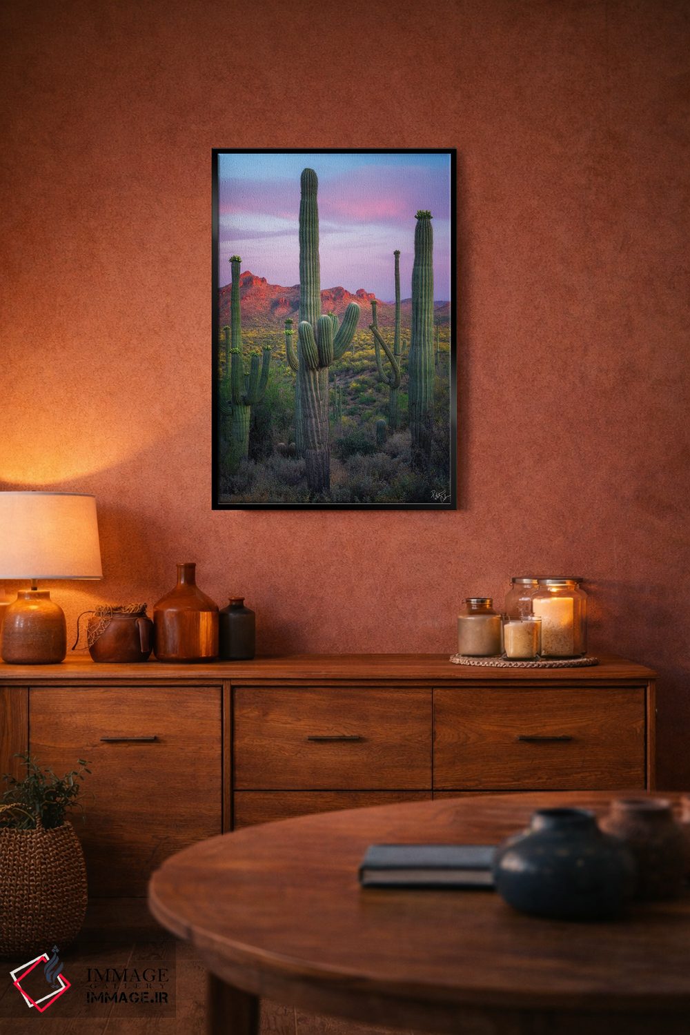 براساس پالت ترکیبی اثر، قاب تیک گرم (چوبی) پیشنهاد اول است و مشکی مات (فریم متوسط) مکمل. برای سفارشهای پروژهای با ابعاد و قابهای اختصاصی با ایماژ در تماس باشید.