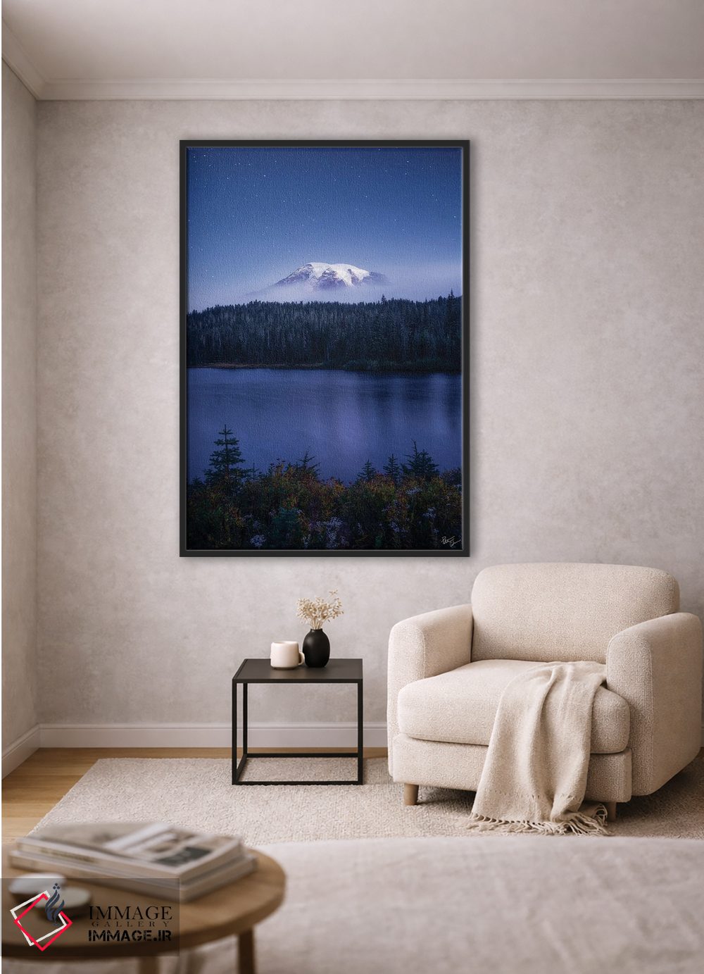 براساس پالت سرد اثر، قاب سفید مات (فریم باریک) پیشنهاد اول است و نقرهای برسخورده (متالیک) مکمل. برای سفارشهای پروژهای با ابعاد و قابهای اختصاصی با ایماژ در تماس باشید.