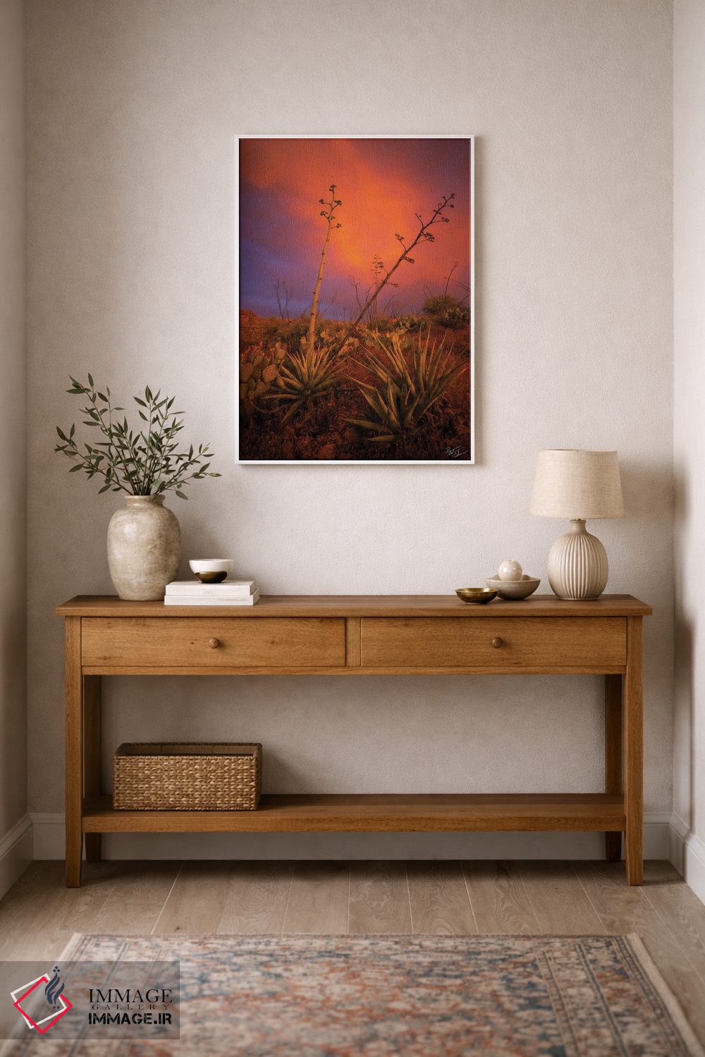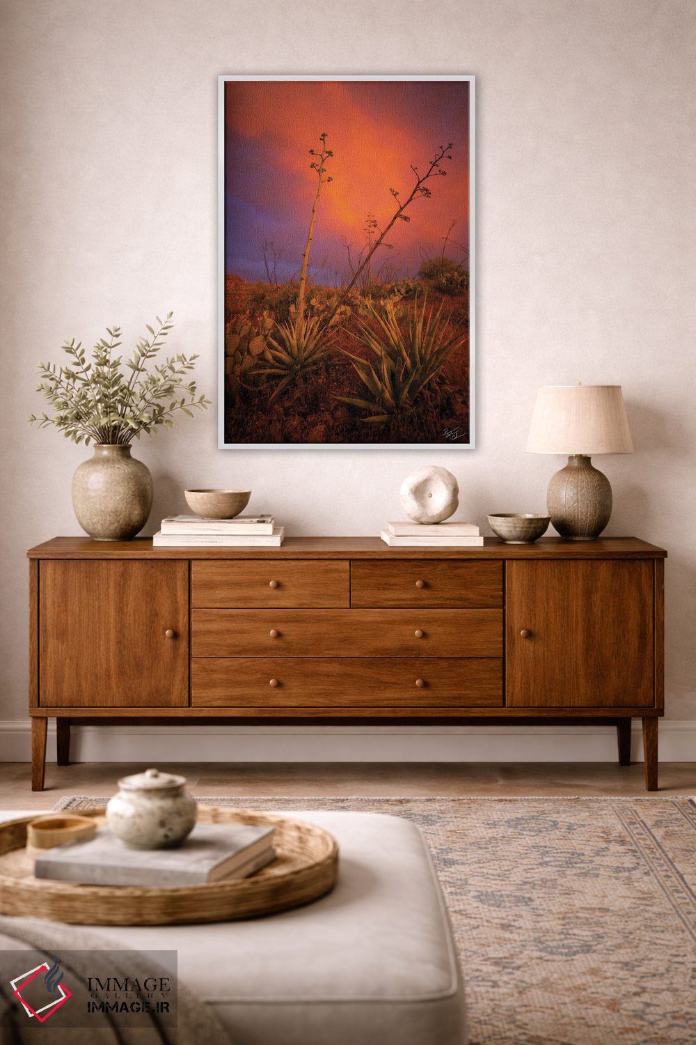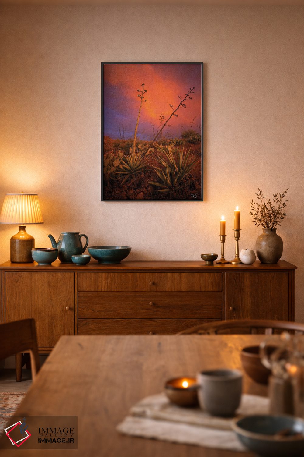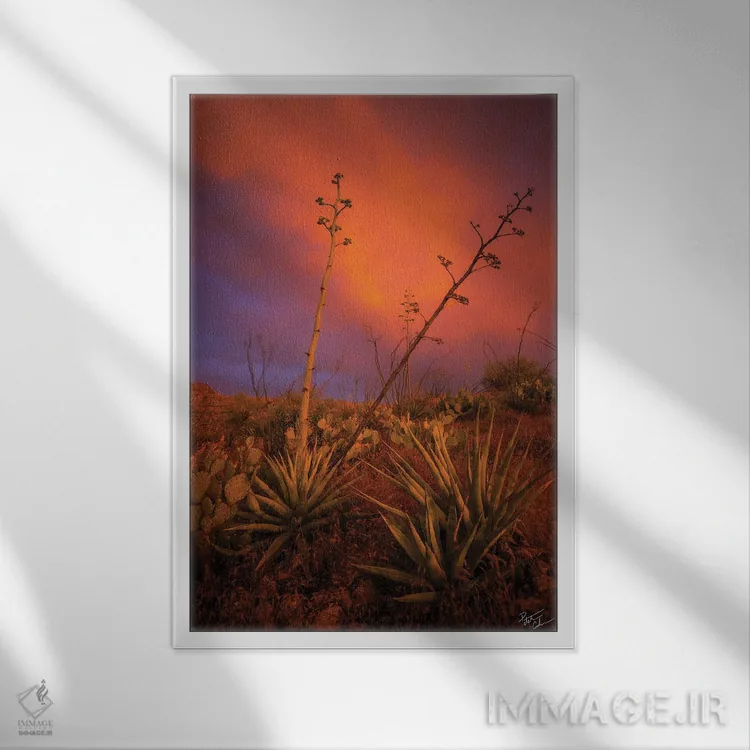 براساس پالت ترکیبی اثر، قاب تیک گرم (چوبی) پیشنهاد اول است و مشکی مات (فریم متوسط) مکمل. برای سفارشهای پروژهای با ابعاد و قابهای اختصاصی با ایماژ در تماس باشید.