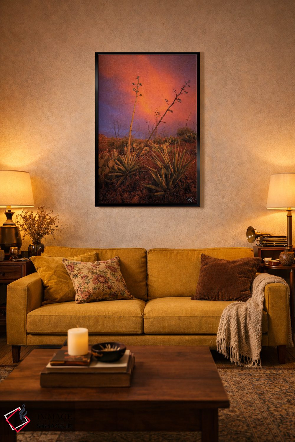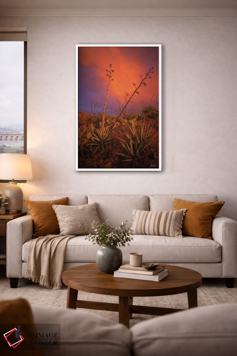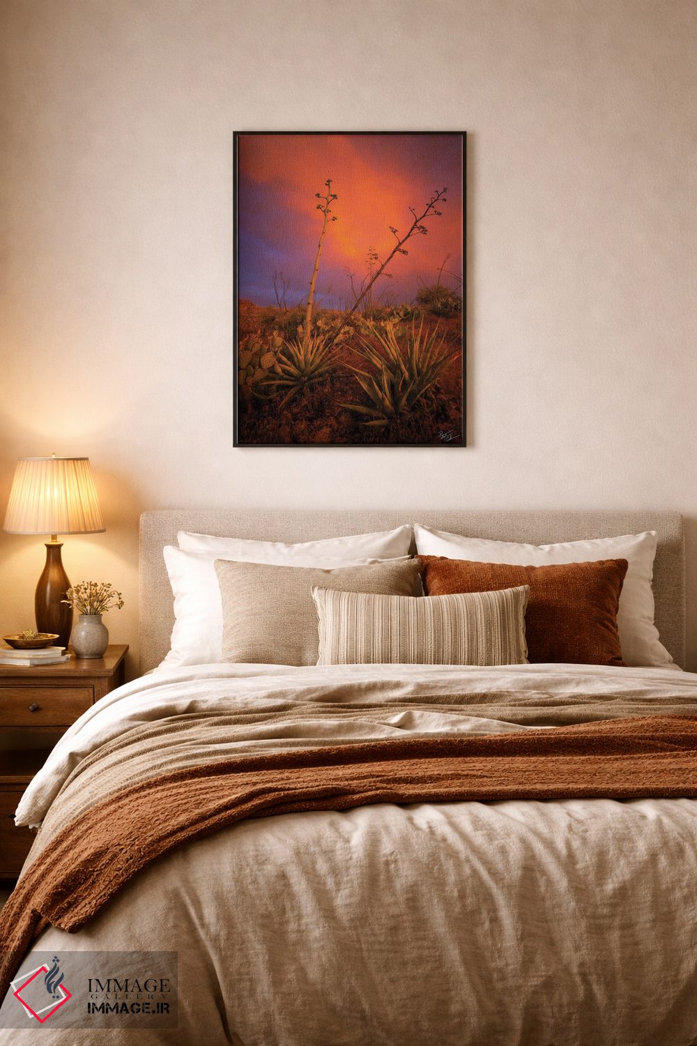 براساس پالت ترکیبی اثر، قاب تیک گرم (چوبی) پیشنهاد اول است و مشکی مات (فریم متوسط) مکمل. برای سفارشهای پروژهای با ابعاد و قابهای اختصاصی با ایماژ در تماس باشید.