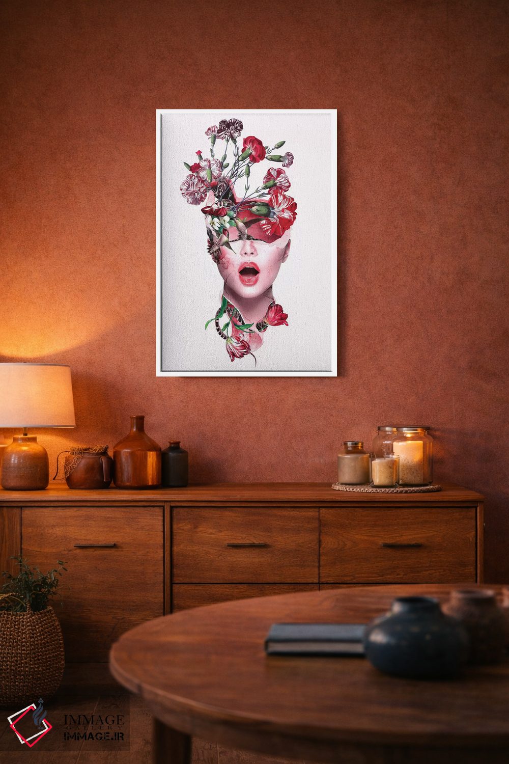 براساس پالت ترکیبی اثر، قاب تیک گرم (چوبی) پیشنهاد اول است و مشکی مات (فریم متوسط) مکمل. برای سفارشهای پروژهای با ابعاد و قابهای اختصاصی با ایماژ در تماس باشید.