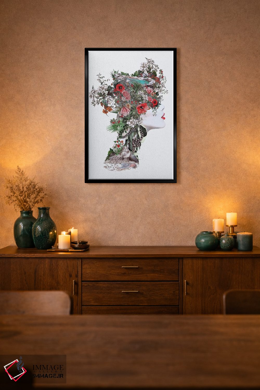 براساس پالت گرم اثر، قاب تیک گرم (چوبی) پیشنهاد اول است و مشکی مات (فریم متوسط) مکمل. برای سفارشهای پروژهای با ابعاد و قابهای اختصاصی با ایماژ در تماس باشید.