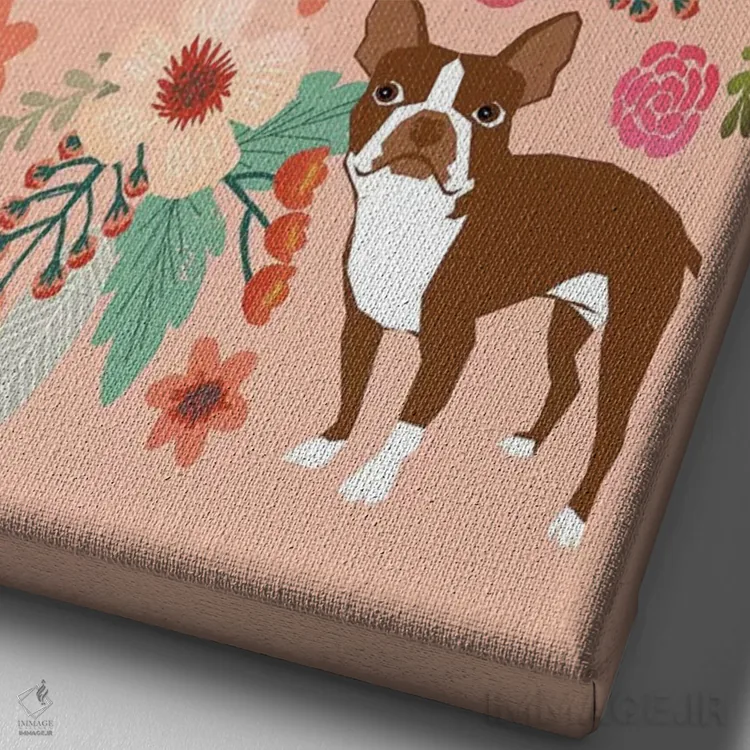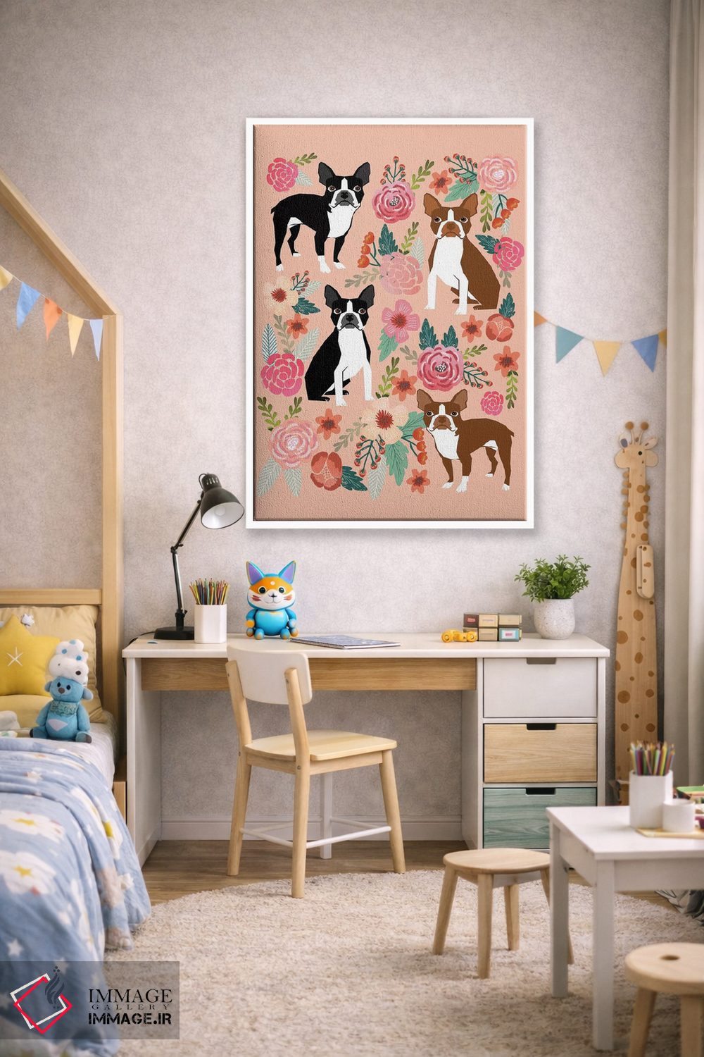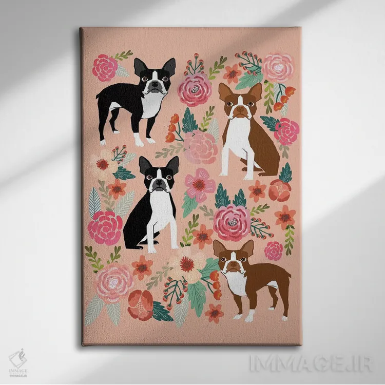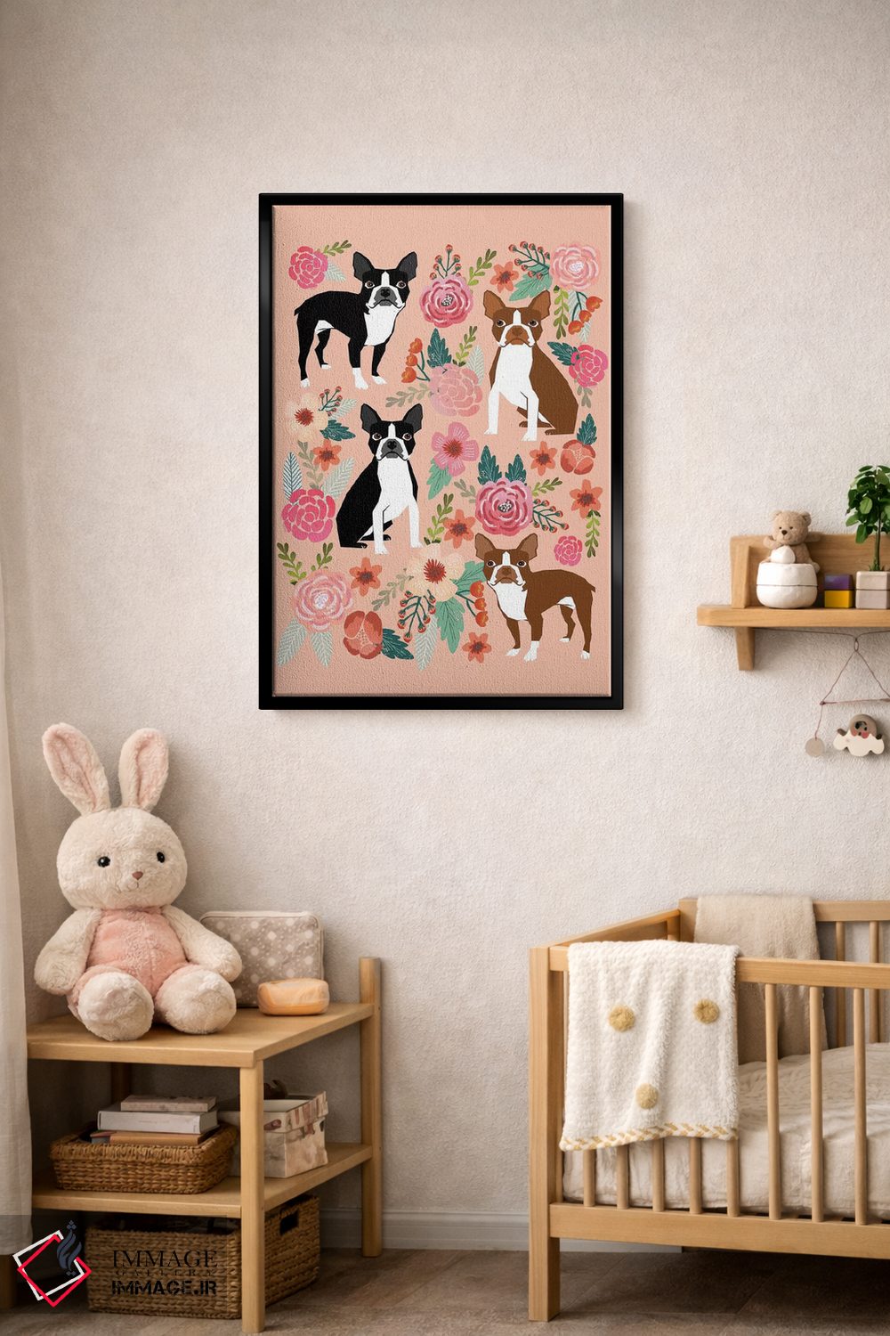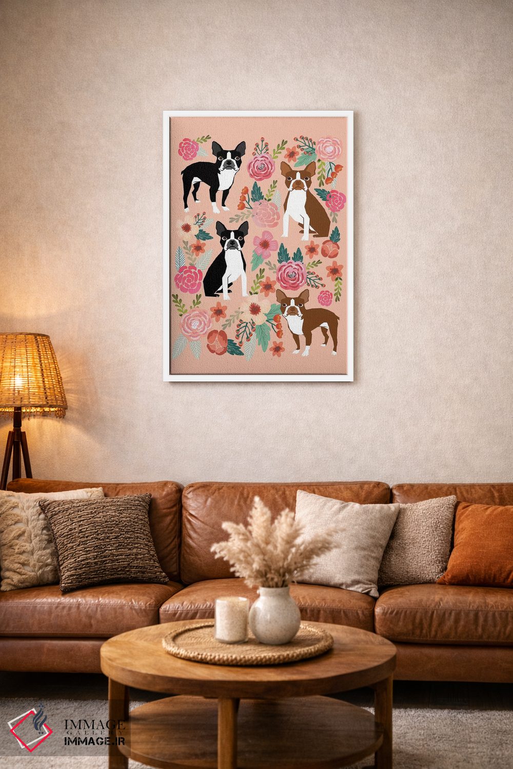 در «کولاژ گلهای بوستون ترر دوم» اثرِ «پت فرندلی (برند هنری مرتبط با حیوانات خانگی)»، حضور حیوانات بدون کودکانه شدن، بازیگوش و خوشپرداخت میماند؛ برای اتاق بازی یا گوشهٔ مطالعه انتخابی خوشسلیقه است. با قاب چوبی یا مشکی، حس مرتبتری پیدا میکند.