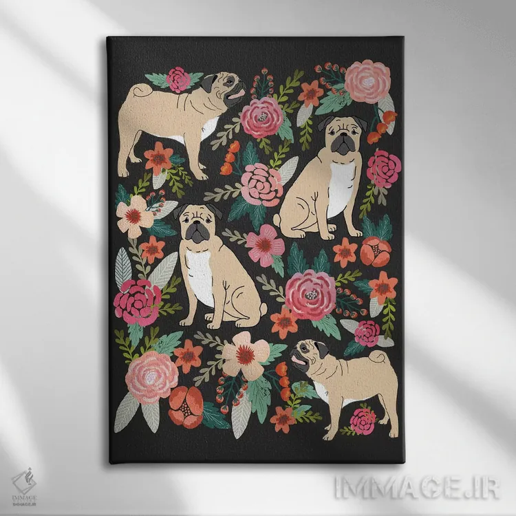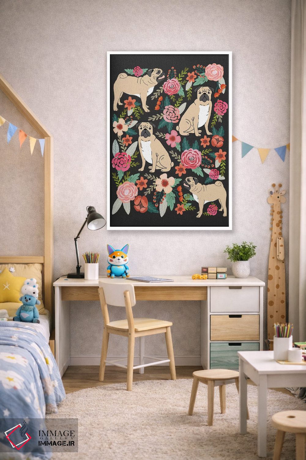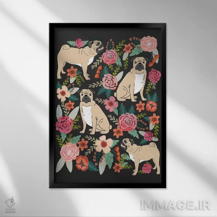 اگر میخواهید دیوار کمی سرزندگیِ محترمانه داشته باشد، «کولاژ گلهای پاگ» اثرِ «پت فرندلی (برند هنری مرتبط با حیوانات خانگی)» حس طبیعت را بیدغدغه وارد خانه میکند، برای خانههایی با چوب و پارچههای گرم گزینهٔ مناسبیست. حسش صمیمی است، اما کیفیتش جدی و خوشپرداخت.