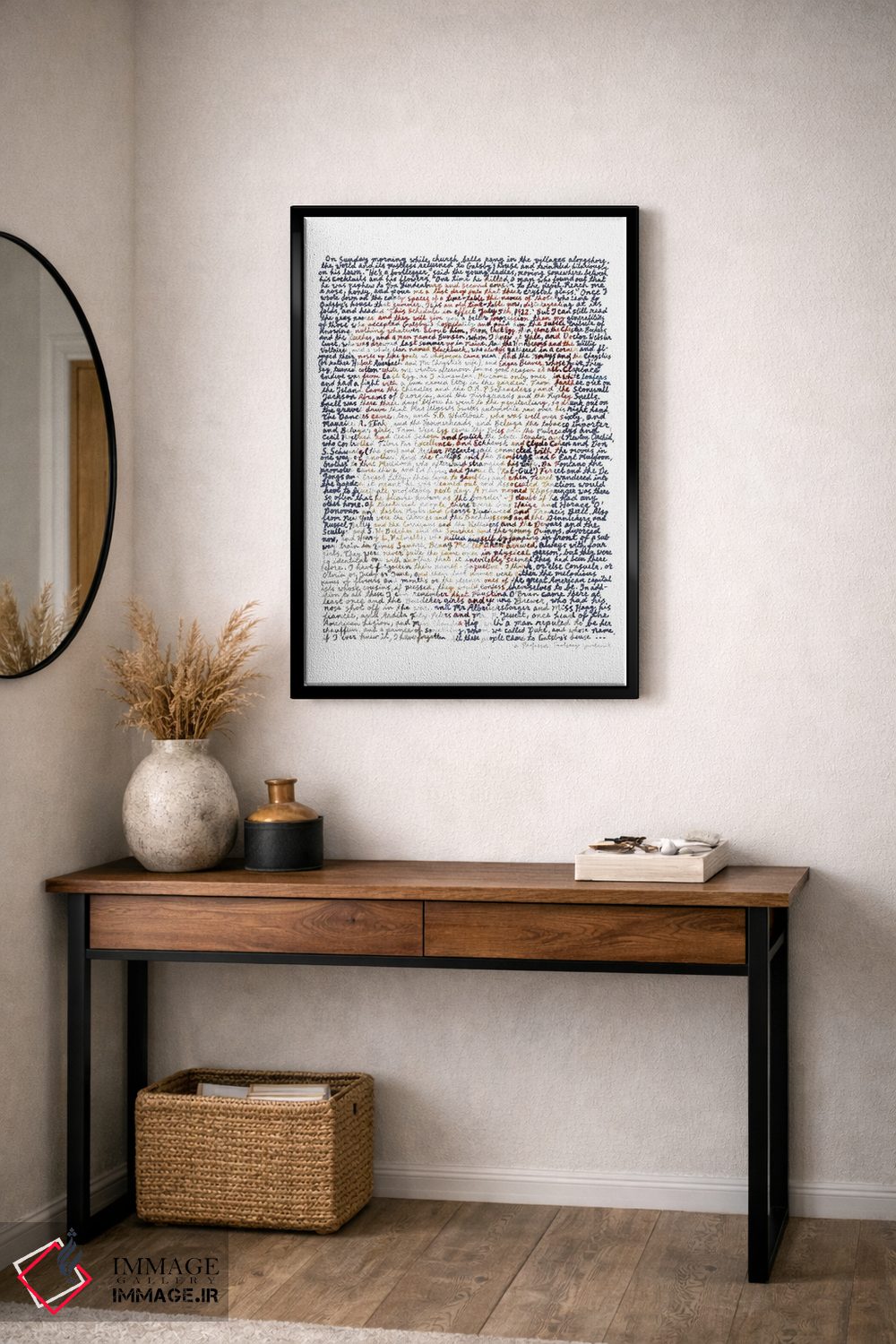 براساس پالت گرم اثر، قاب تیک گرم (چوبی) پیشنهاد اول است و مشکی مات (فریم متوسط) مکمل. برای سفارشهای پروژهای با ابعاد و قابهای اختصاصی با ایماژ در تماس باشید.