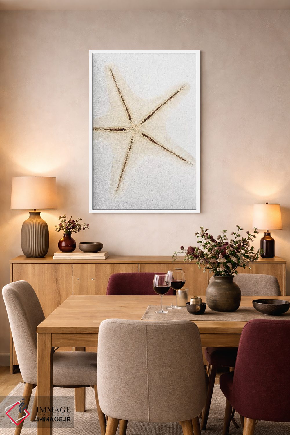 براساس پالت گرم اثر، قاب بلوط روشن (چوبی) پیشنهاد اول است و استخوانی ملایم مکمل. برای سفارشهای پروژهای با ابعاد و قابهای اختصاصی با ایماژ در تماس باشید.