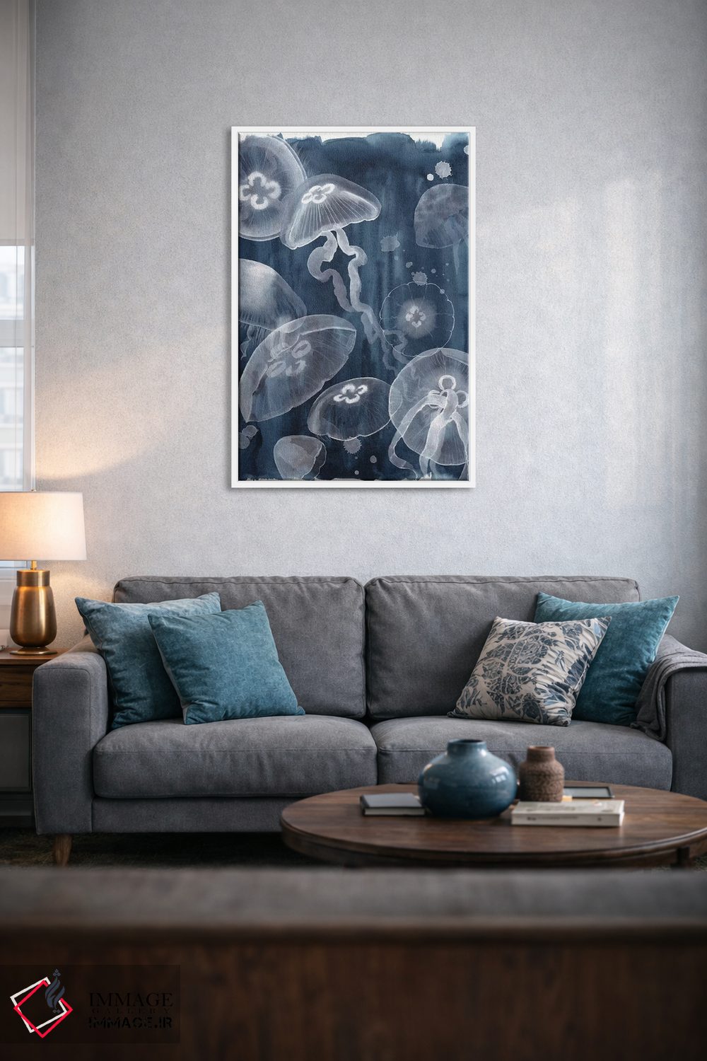 براساس پالت سرد اثر، قاب سفید مات (فریم باریک) پیشنهاد اول است و نقرهای برسخورده (متالیک) مکمل. برای سفارشهای پروژهای با ابعاد و قابهای اختصاصی با ایماژ در تماس باشید.