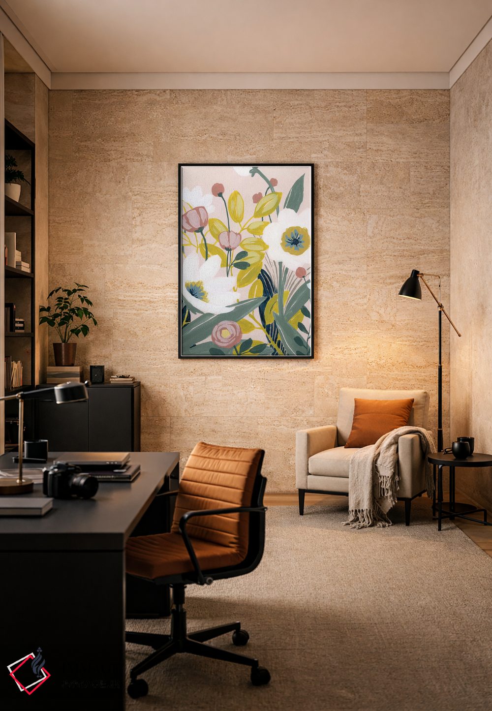 این اثر با عنوان «طرح باغ ۱» اثرِ «گریس پاپ» به دیوار، روشناییِ ملایم و دلنشین میدهد؛ برای فضاهای بوهمی انتخابی خوشسلیقه است. فضا را شلوغ نمیکند؛ فقط لطیفترش میکند.