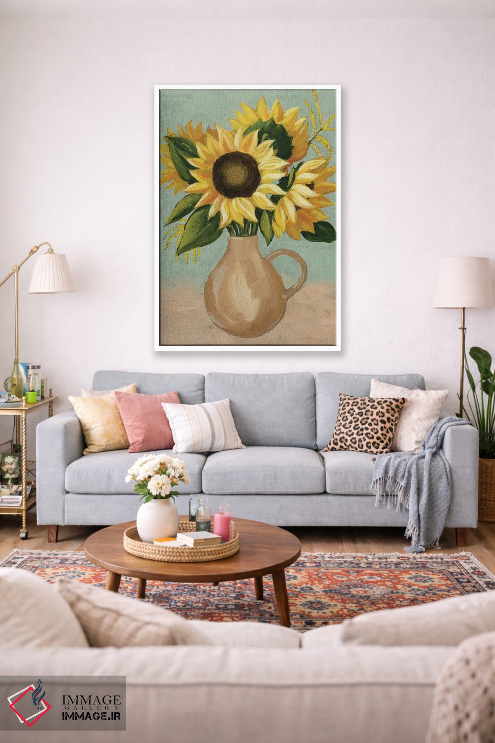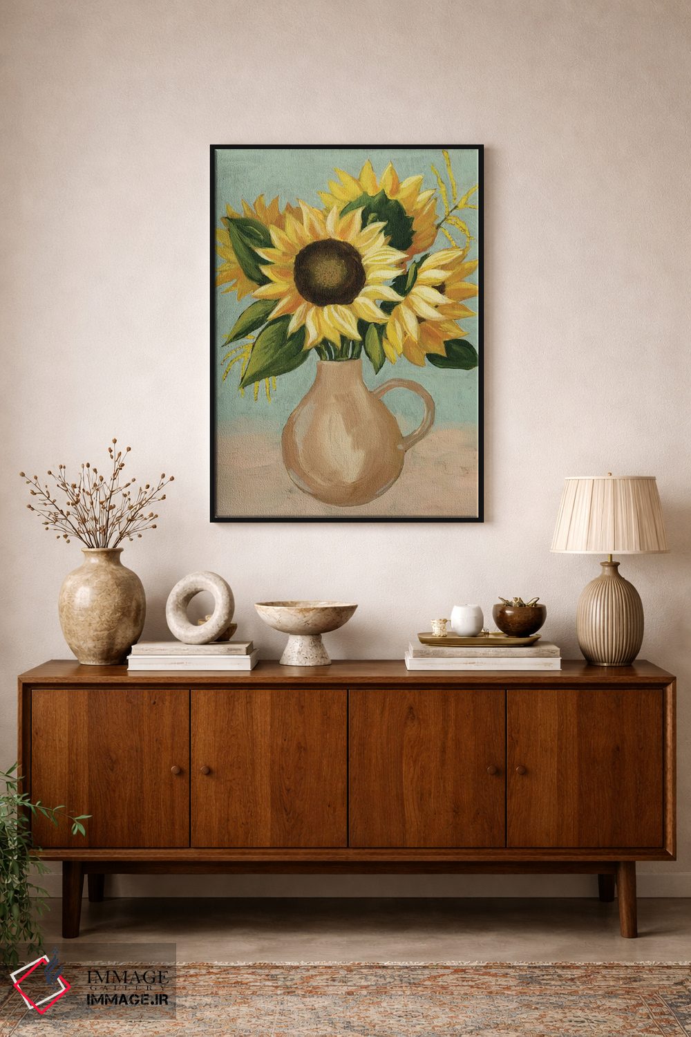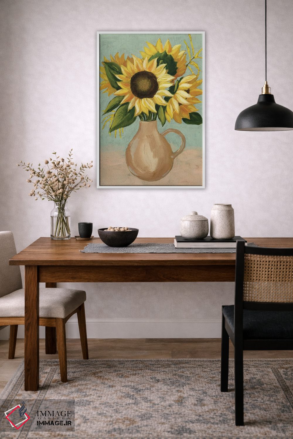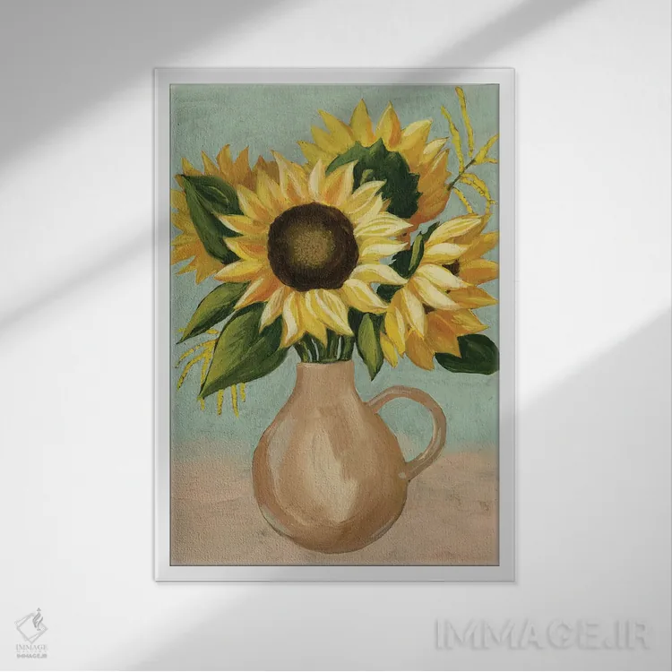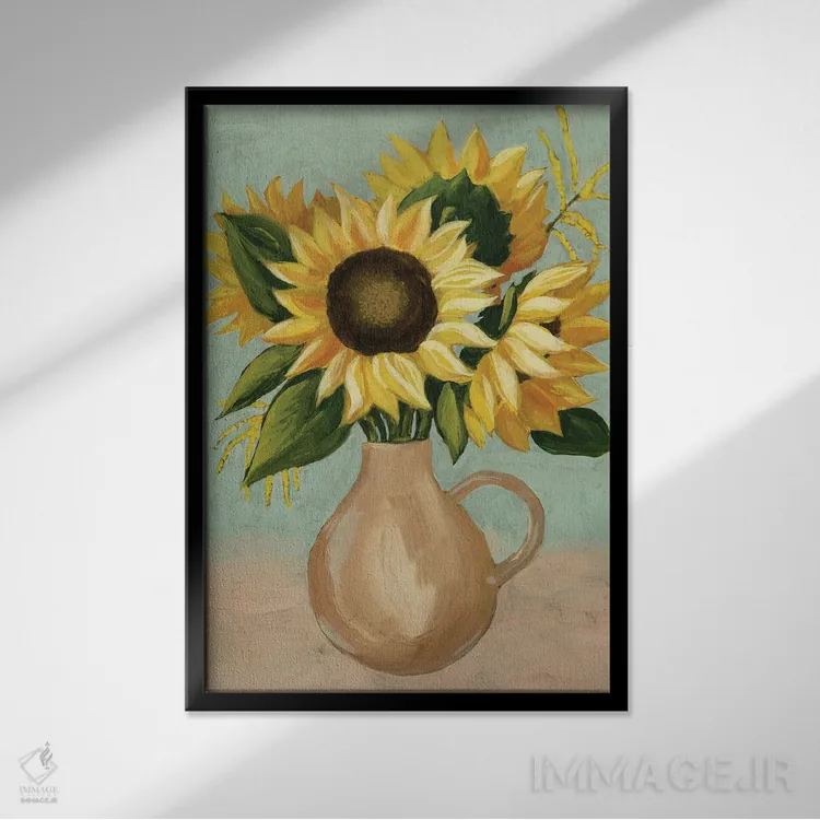 «عصرانهٔ آفتابگردان I» اثرِ «گریس پاپ» میتواند تعادل رنگیِ لطیفی به چیدمان بدهد؛ برای فضاهای بوهمی پیشنهاد میشود. جزئیاتش از نزدیک هم ارزش تماشا دارد.