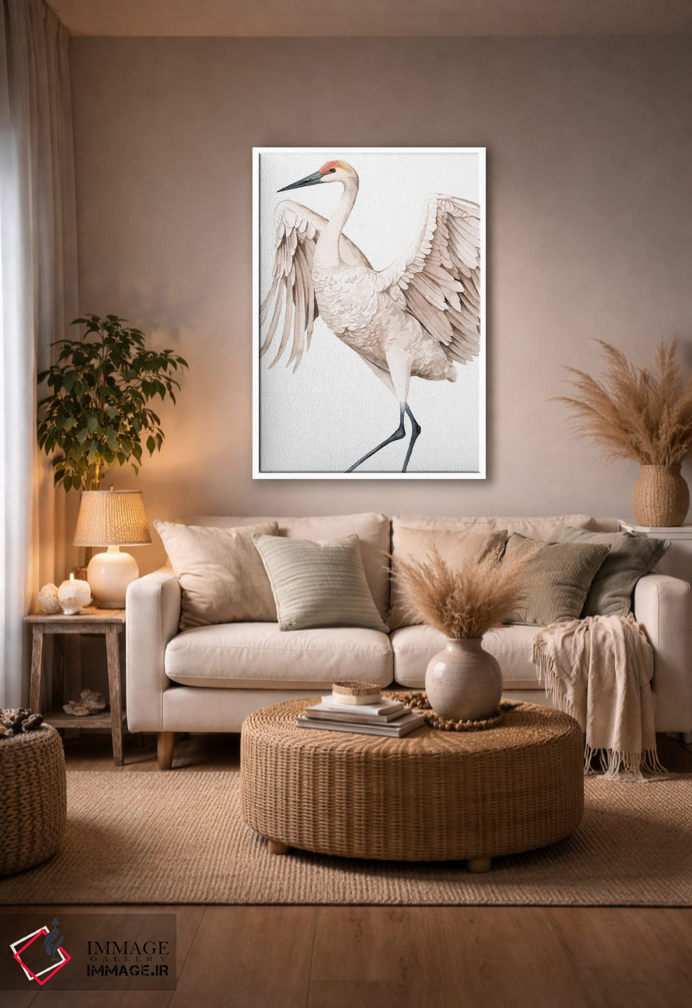 براساس پالت گرم اثر، قاب بلوط روشن (چوبی) پیشنهاد اول است و استخوانی ملایم مکمل. برای سفارشهای پروژهای با ابعاد و قابهای اختصاصی با ایماژ در تماس باشید.