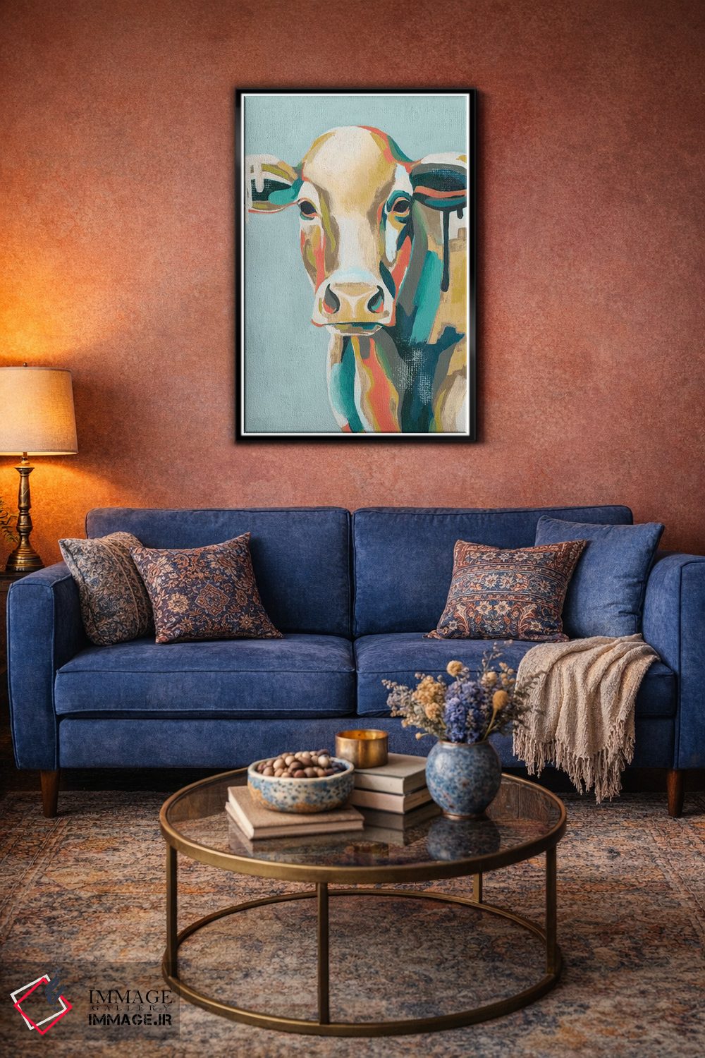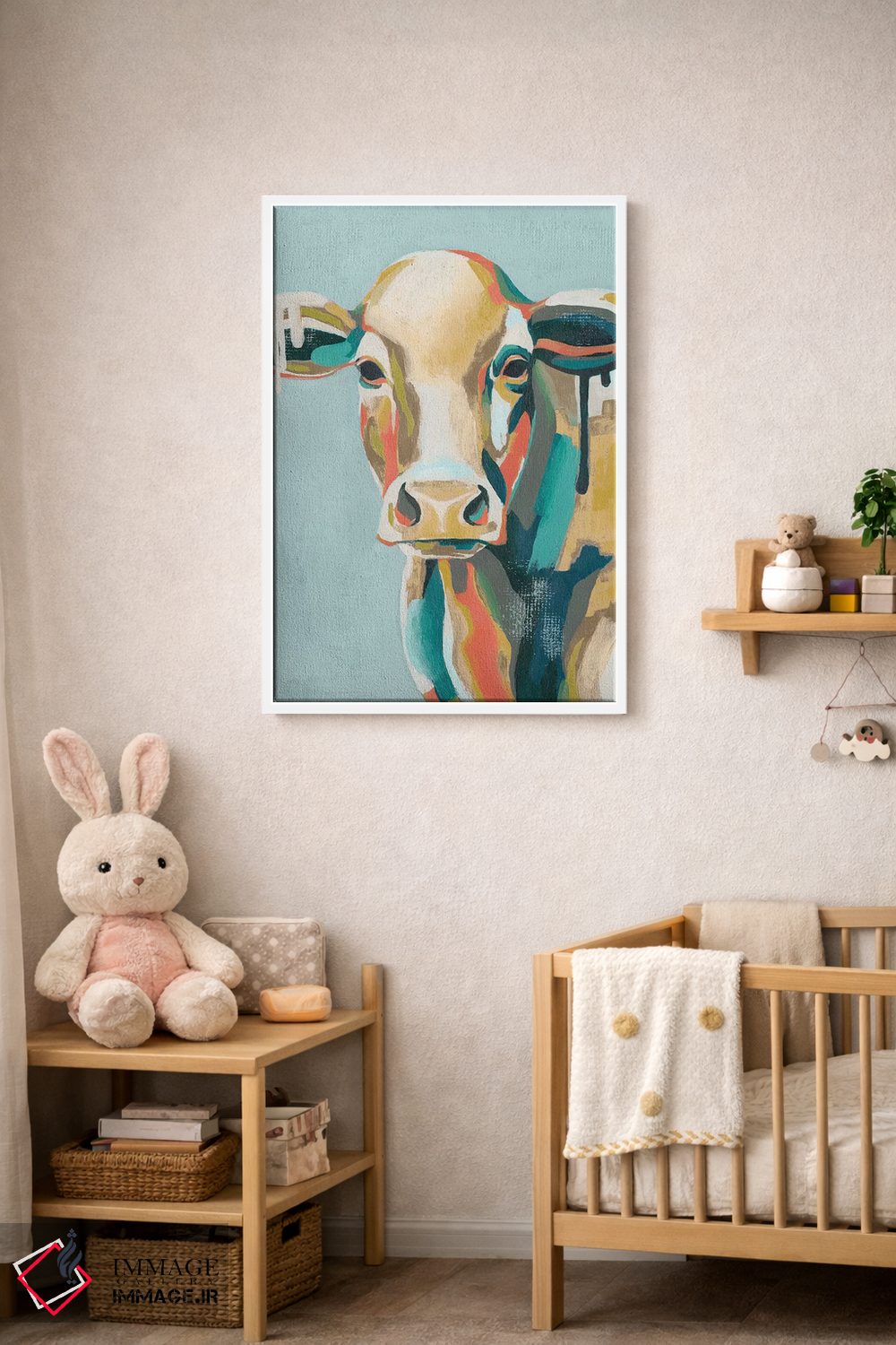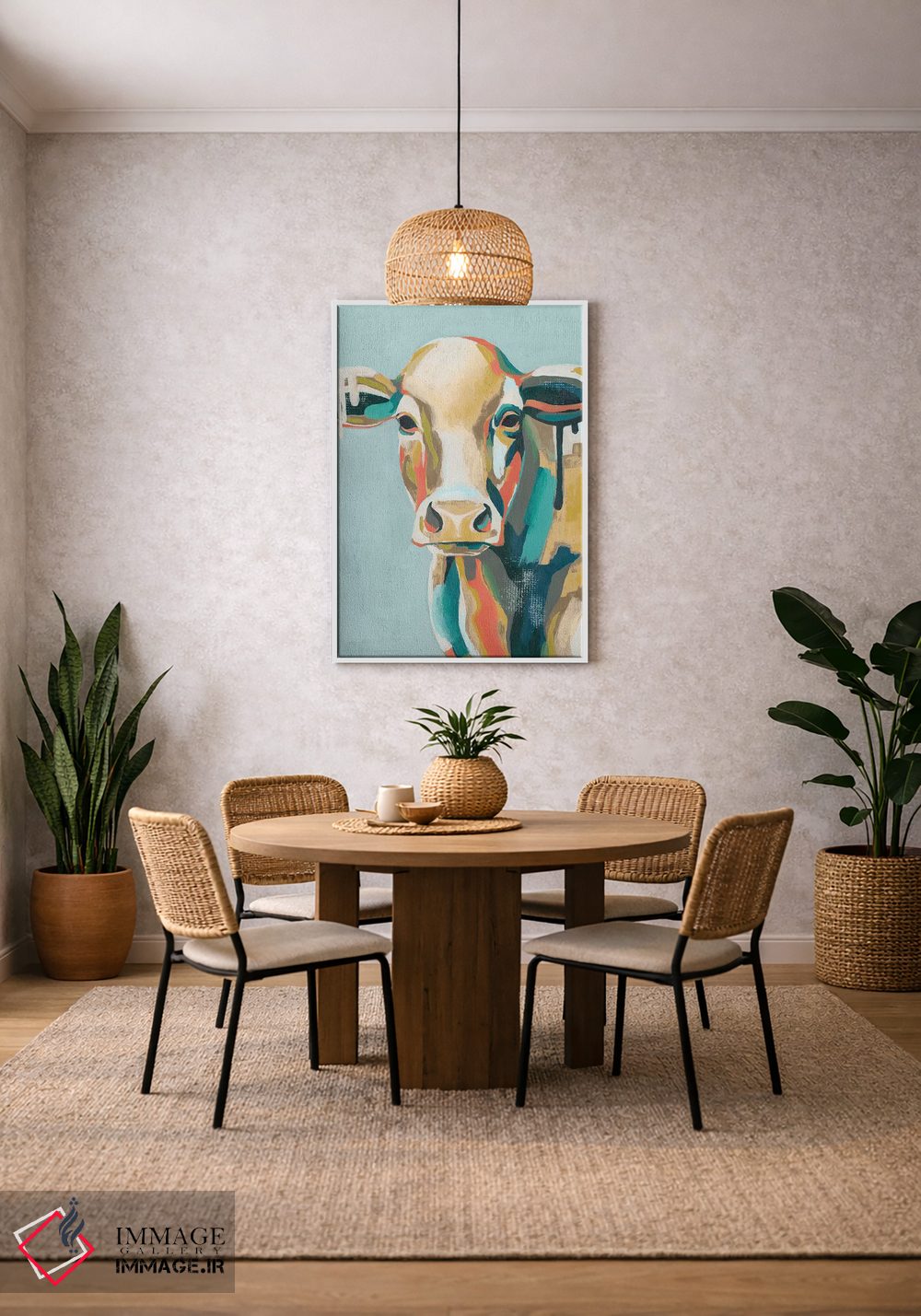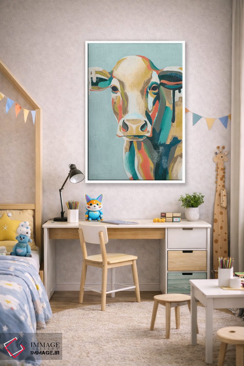 «گاوهای رنگارنگ یکم» اثرِ «گریس پاپ» از آن کارهاییست که مثل یک امضای بامزه اما متین عمل میکند؛ برای اتاق کودک (بدون لحن کودکانه) انتخاب خوبیست. با نورپردازی نقطهای، جذابتر هم میشود.