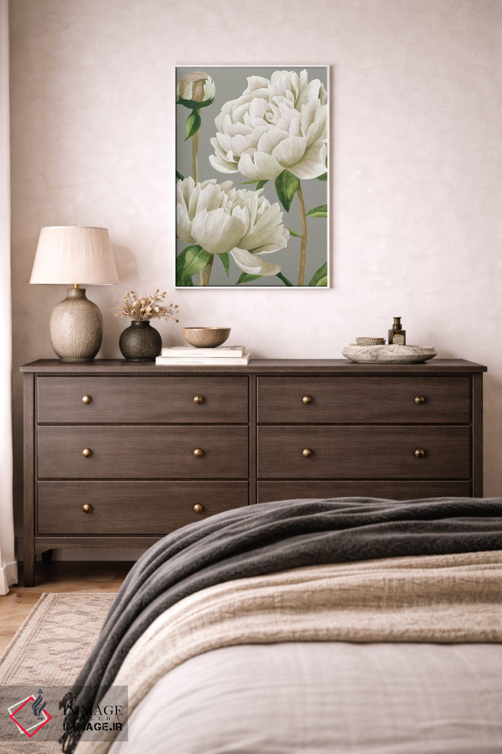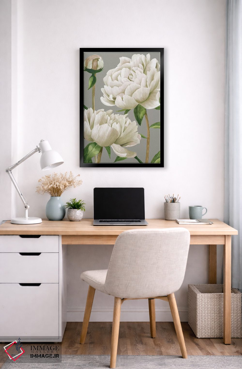 «صدف سفید یکم (اشاره به گل صد تومانی)» اثرِ «گریس پاپ» مثل یک نفس تازه است؛ چیدمان را از خشکی بیرون میآورد؛ برای کنار میز آرایش یا کنسول انتخابی خوشسلیقه است. جزئیاتش از نزدیک هم ارزش تماشا دارد.