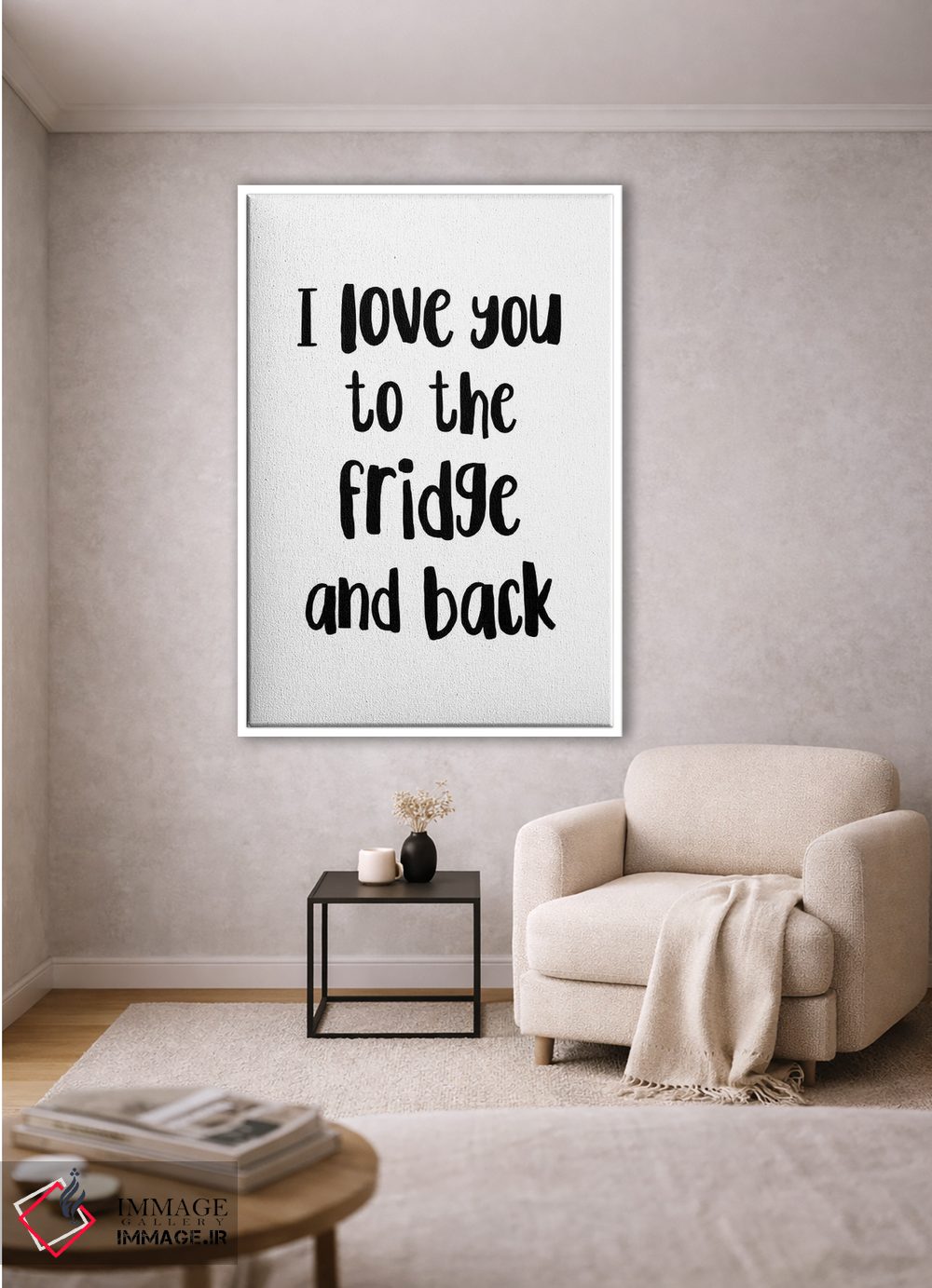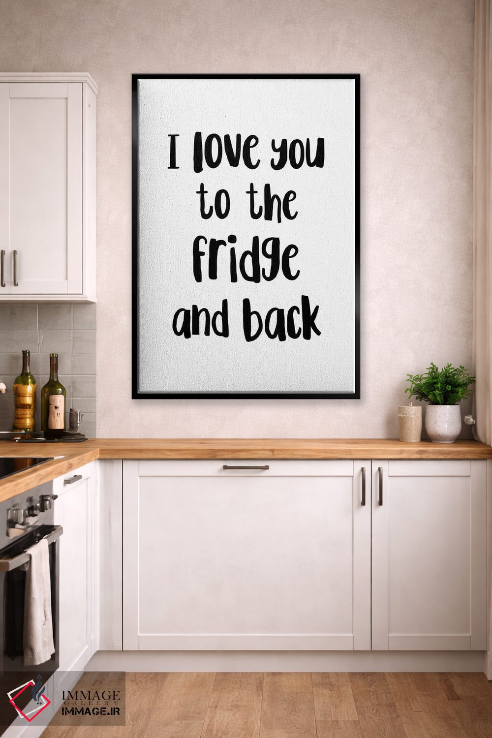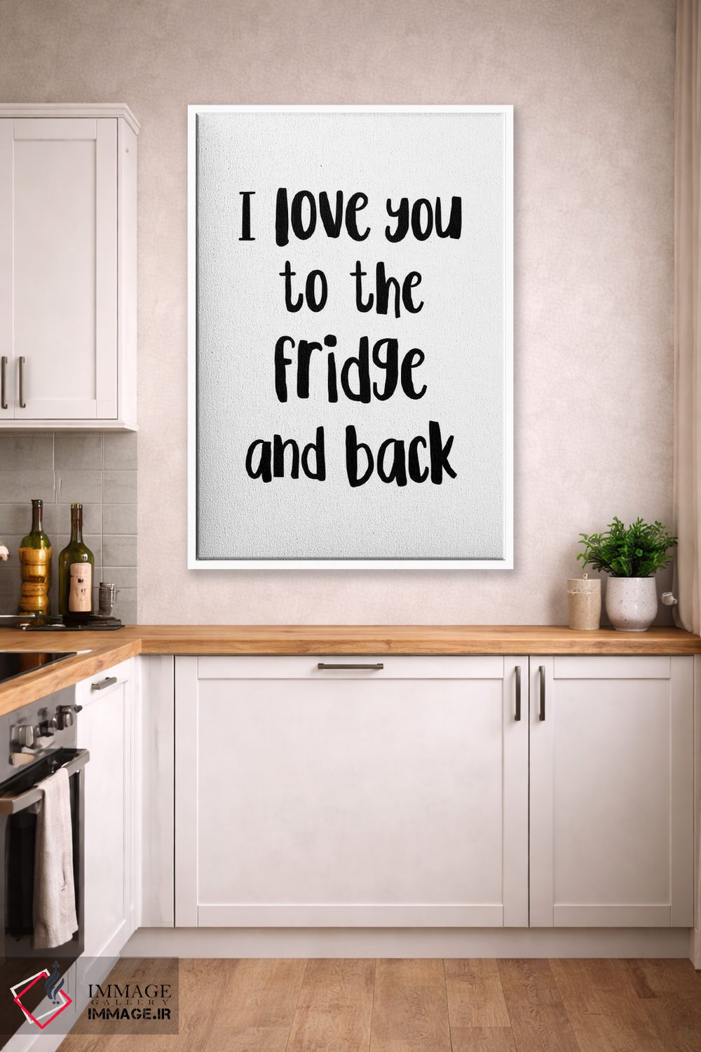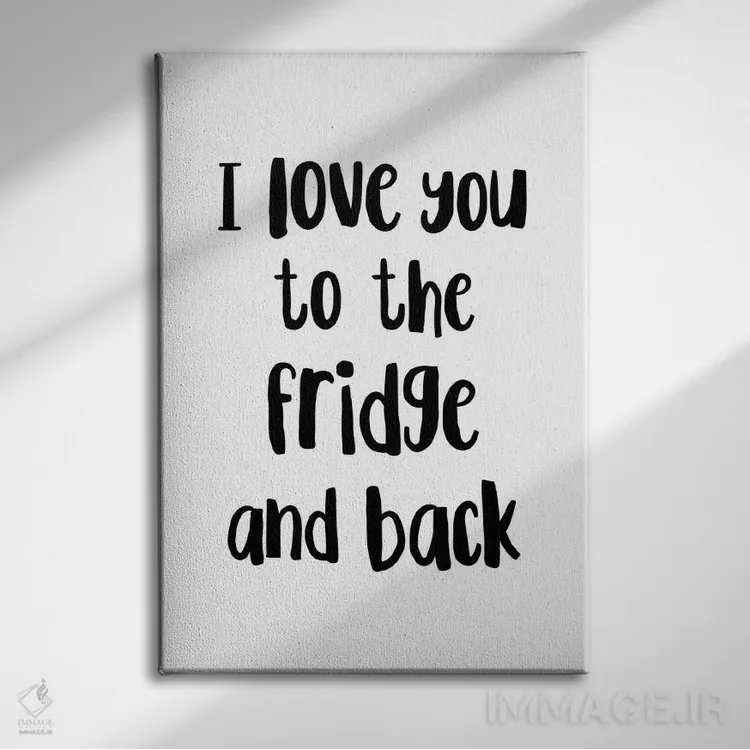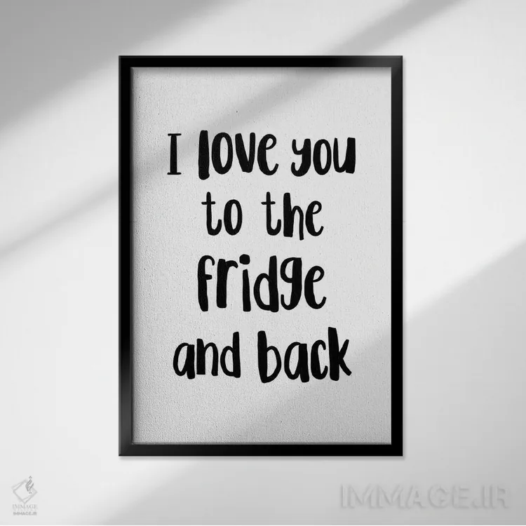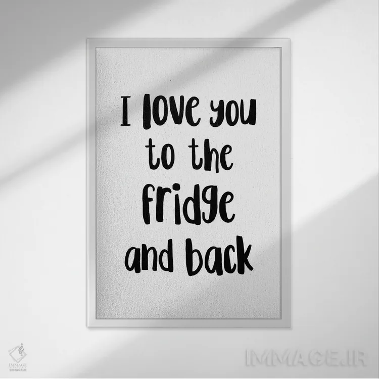 اگر دکور شما بر پایهی متن و تایپ است، «دوستت دارم تا یخچال و دوباره برگشت!» اثرِ «پیکسی پیپر (برند و استودیو چاپ)» با سبک پرداختِ هنری انتخابی تمیز و کاربردی است.