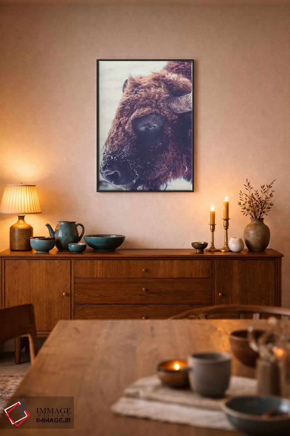 براساس پالت ترکیبی اثر، قاب تیک گرم (چوبی) پیشنهاد اول است و مشکی مات (فریم متوسط) مکمل. برای سفارشهای پروژهای با ابعاد و قابهای اختصاصی با ایماژ در تماس باشید.