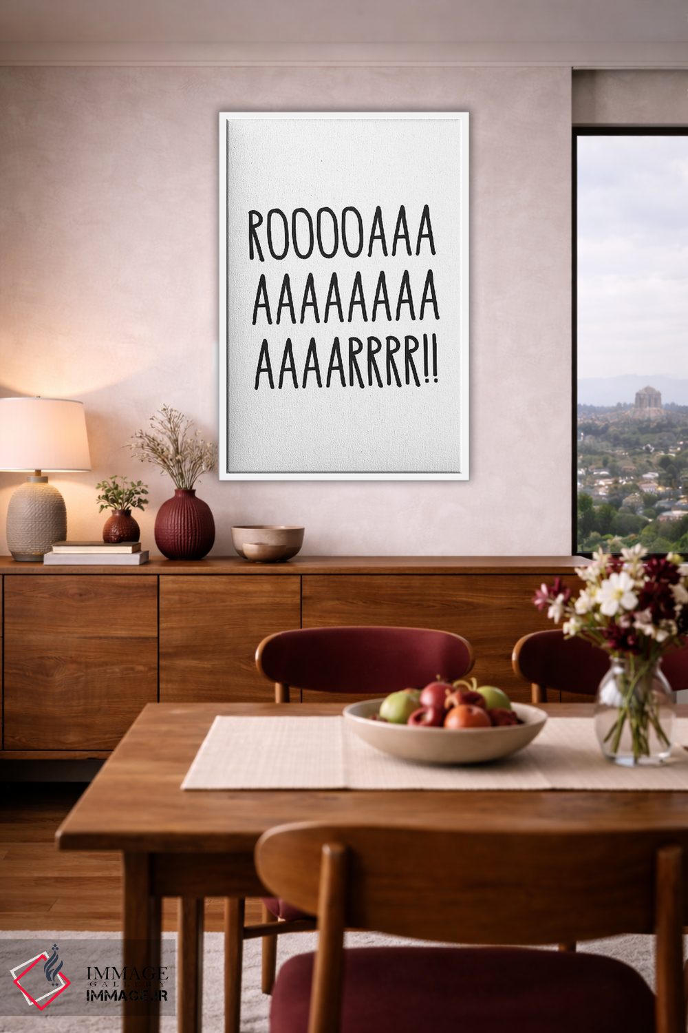 بوم گالری ایماژ طوری طراحی شده که اثر روی دیوار «پرداختشده» و حرفهای دیده شود—نه پرزرقوبرقِ بیپایه؛ بلکه دقیق و خوشپرداخت. بافت ظریف کنواس کمک میکند حس اثر هنری را در نگاه نزدیک نگه میدارد. کنترل تونها کمک میکند از تند شدن ناخواستهی رنگها جلوگیری میکند. حاصل کار، یک تابلو خوشنشین است که هم از دور اثرگذار است و هم از نزدیک خوشخوان؛ همراهِ نورپردازی درست، جلوهی گالریوار بیشتری حس میشود. در کنار چوب و متریالهای طبیعی، بافت کنواس دلنشینتر دیده میشود.