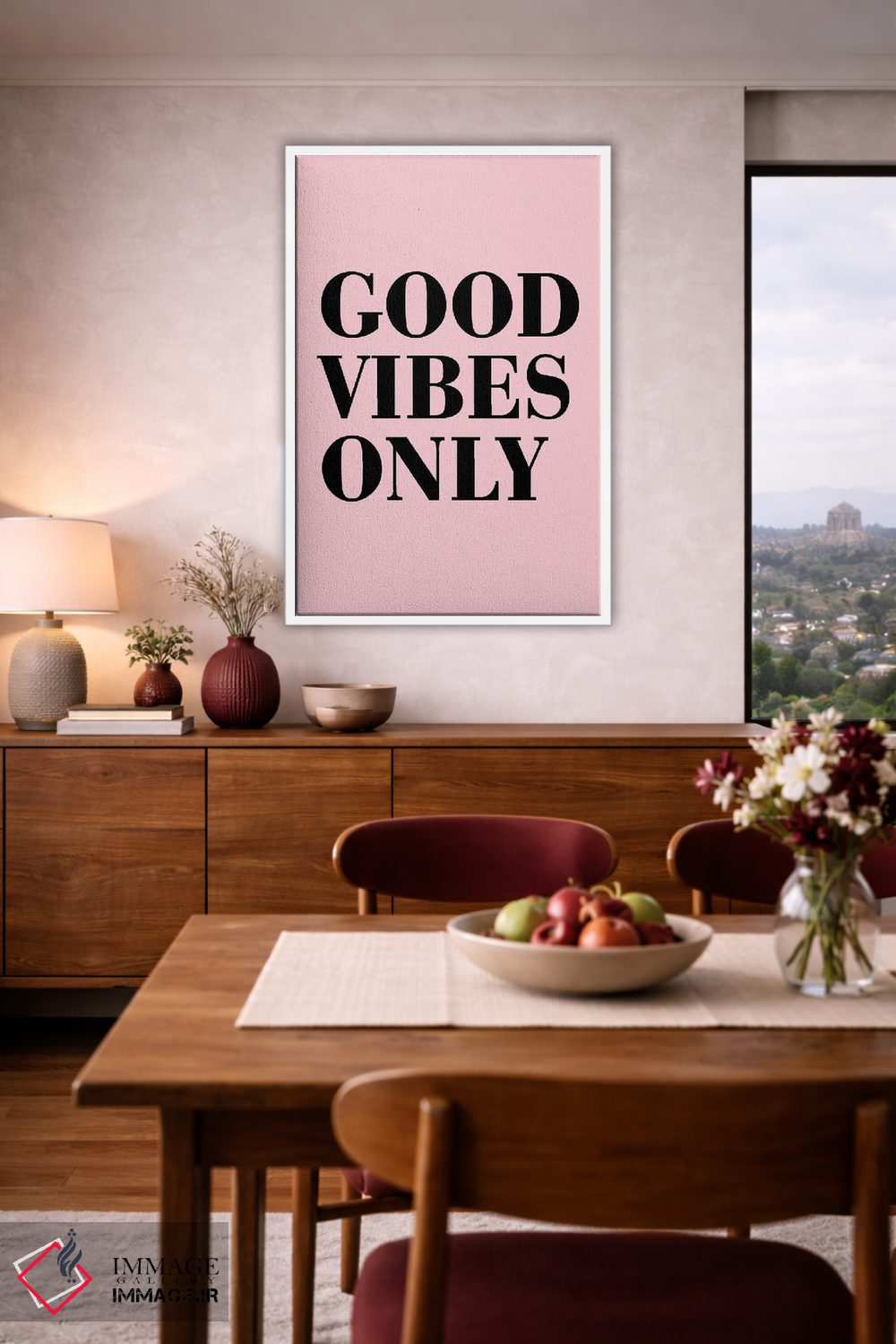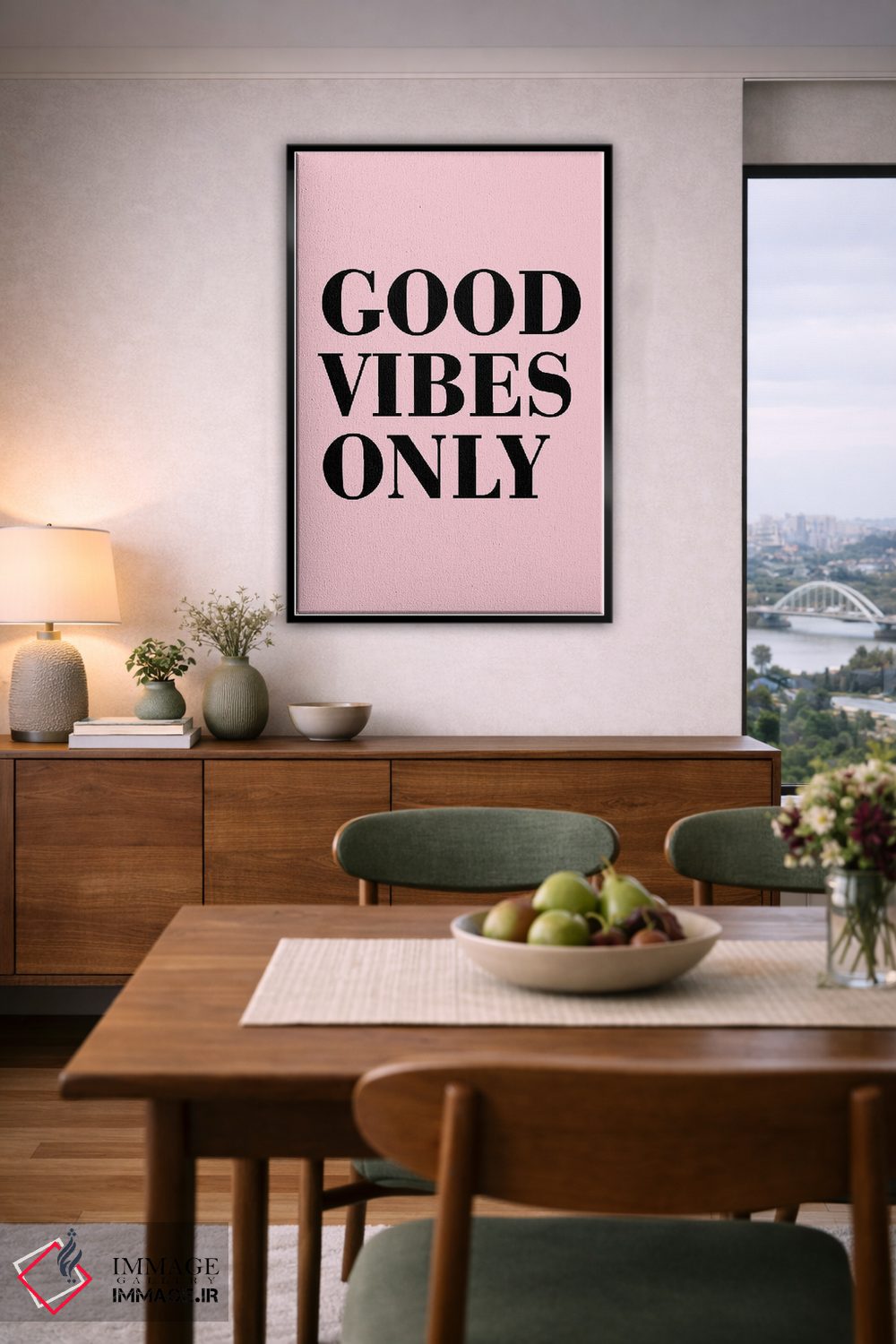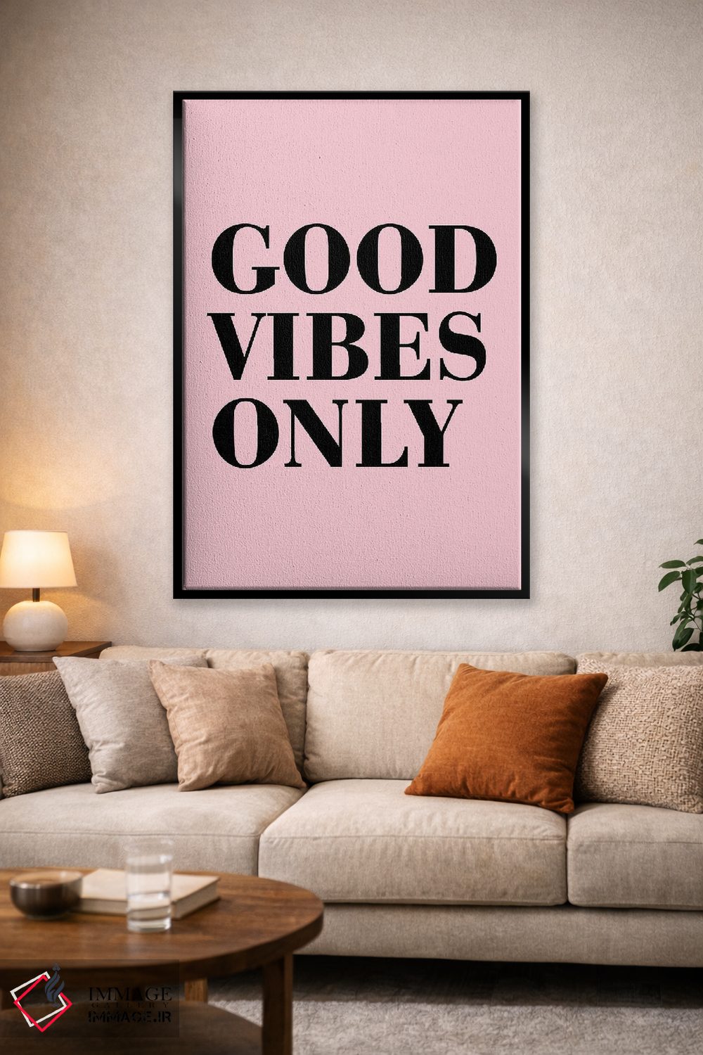 اگر دوست دارید هماهنگی کاملتر شود، رنگِ صورتی را در قابهای کوچک کناری جا بدهید تا چیدمان شیکتر و دقیقتر دیده شود. اگر فضا شلوغ است، فقط یک نقطهٔ رنگی بس است.