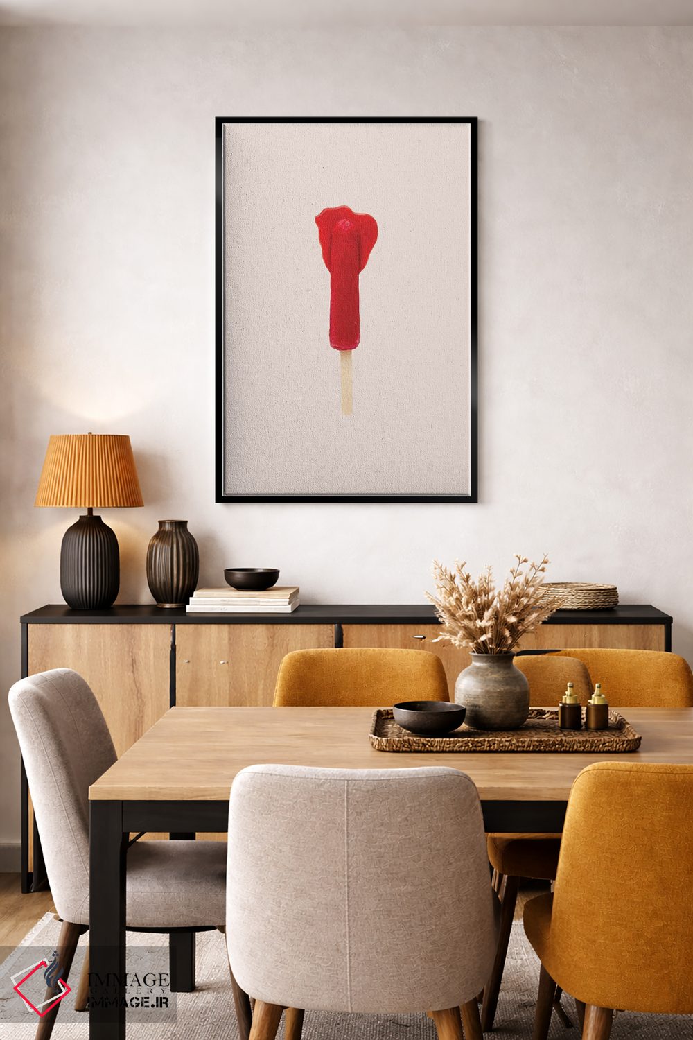 براساس پالت گرم اثر، قاب تیک گرم (چوبی) پیشنهاد اول است و مشکی مات (فریم متوسط) مکمل. برای سفارشهای پروژهای با ابعاد و قابهای اختصاصی با ایماژ در تماس باشید.