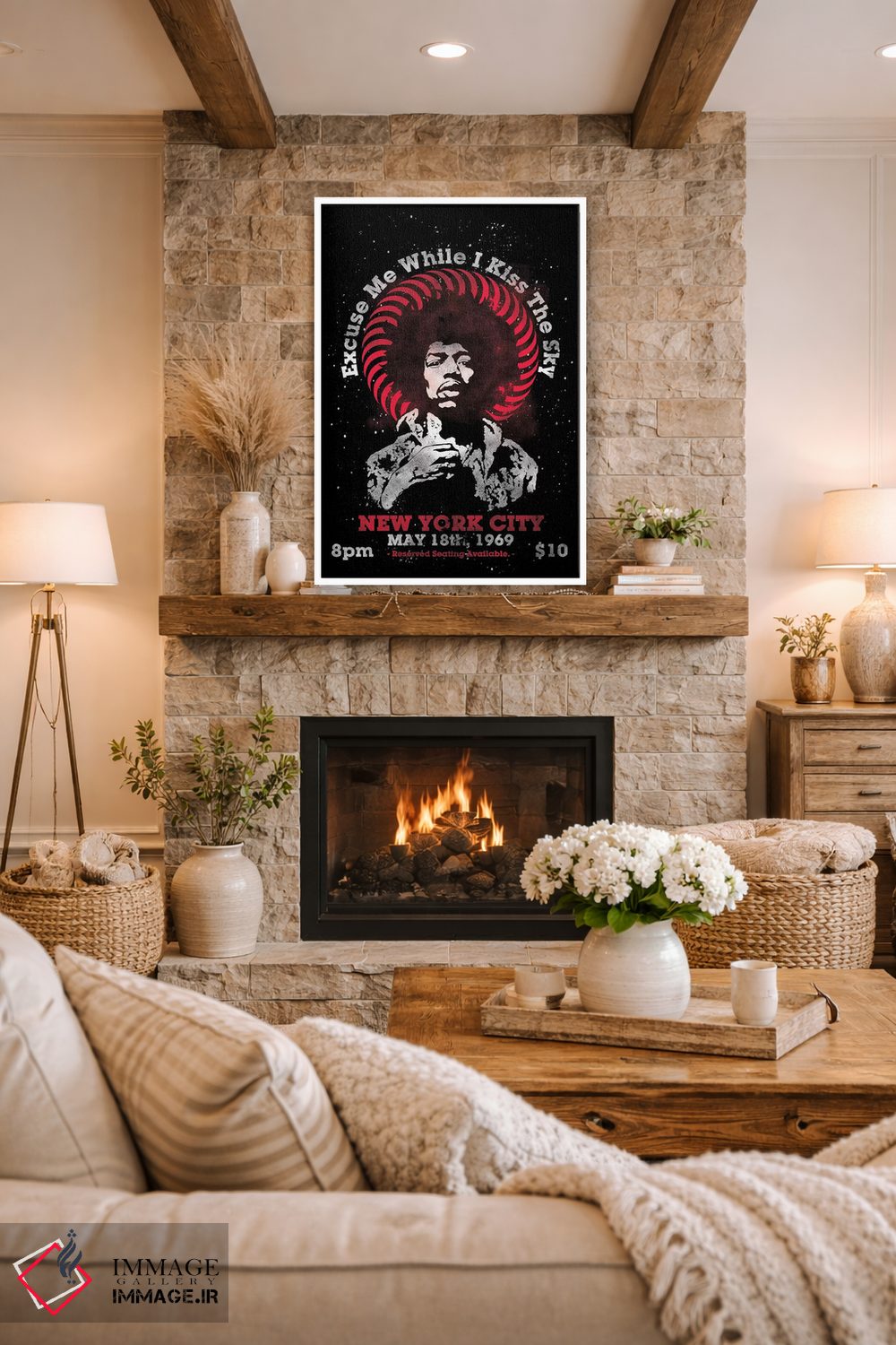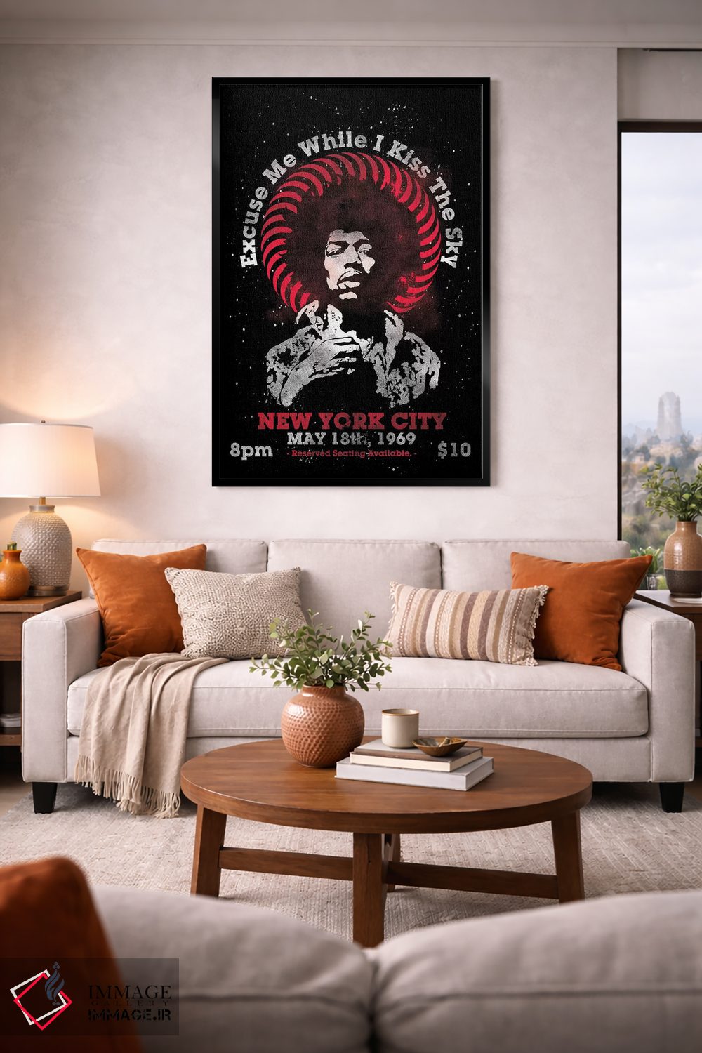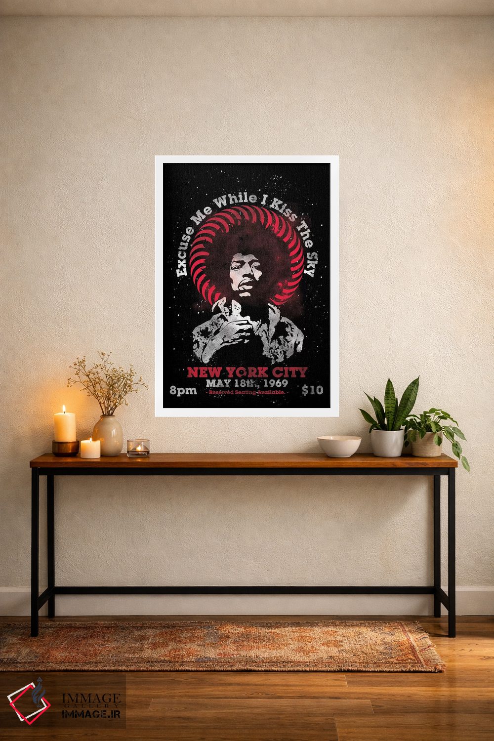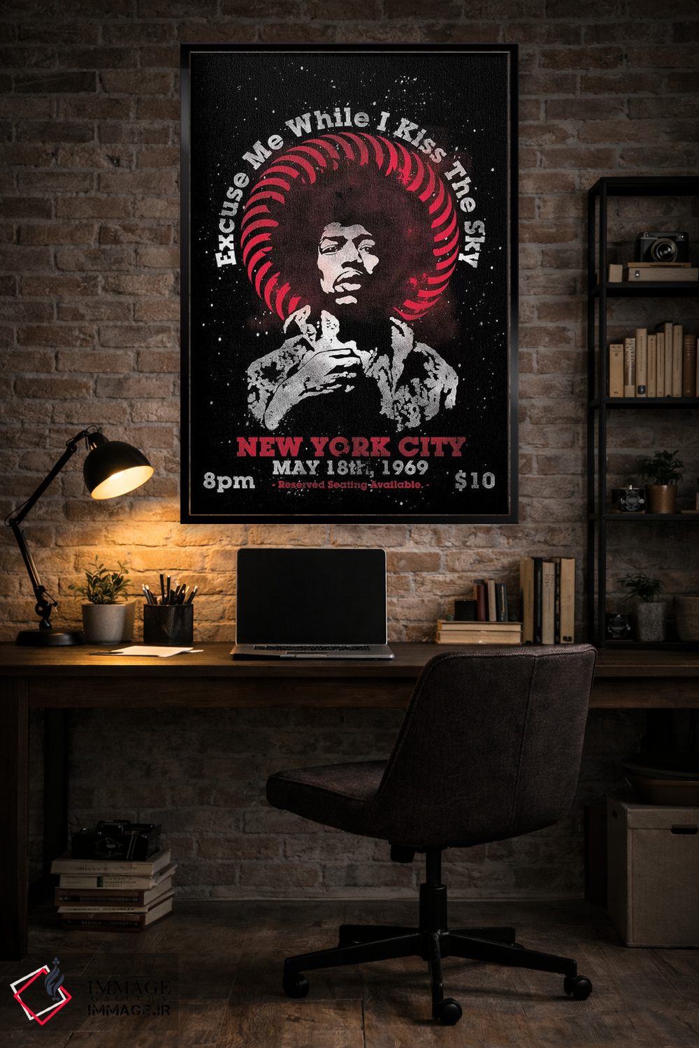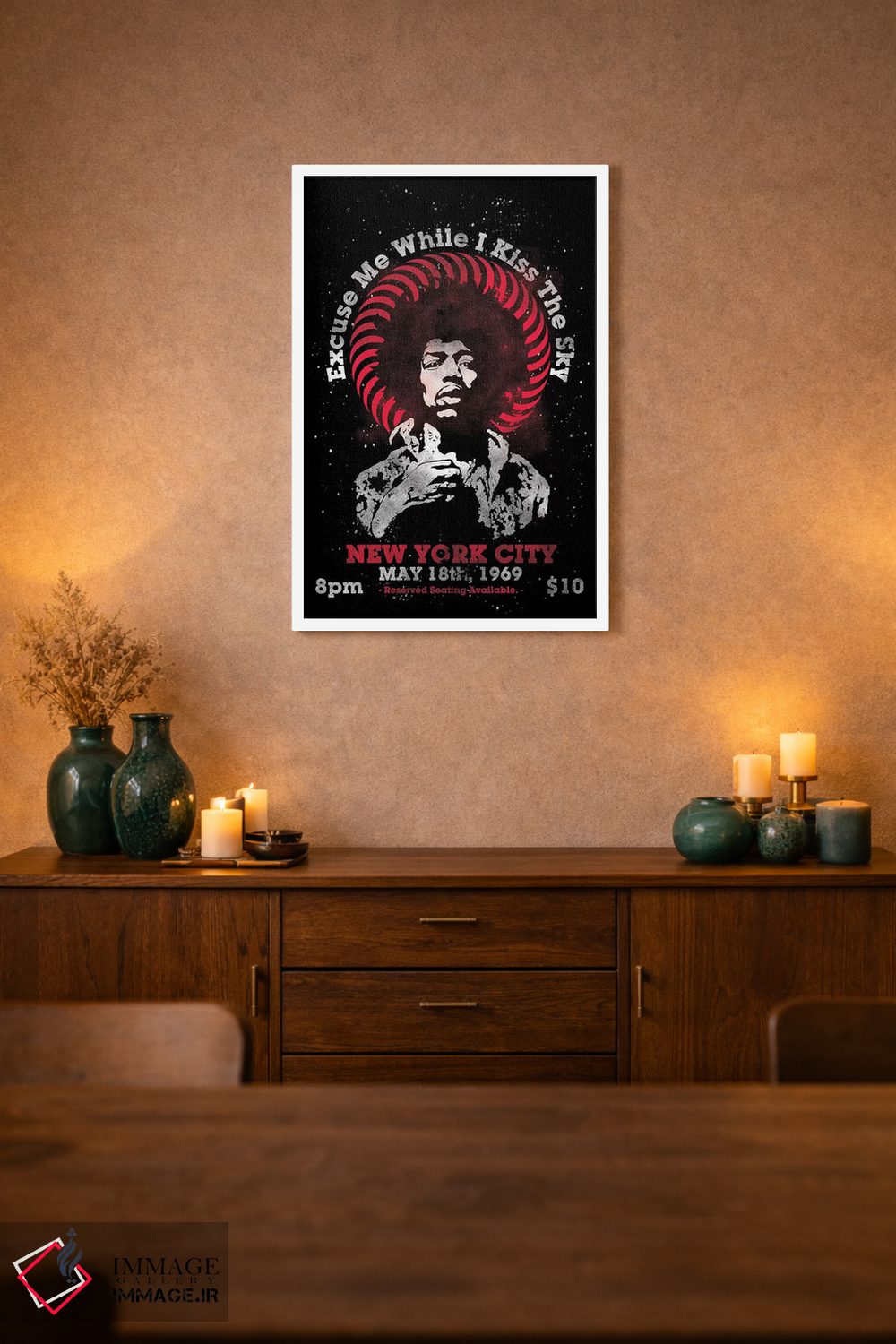 «پوستر یادبود تور آمریکا جیمی هندریکس ۱۹۶۹ در مدیسن اسکوئر گاردن» اثرِ «رادیو دیز (نام هنری/پروژه هنری نوستالژیک)» با حالوهوای هنری، از آن انتخابهایی است که به دیوار شخصیت میدهد و گفتگو راه میاندازد.