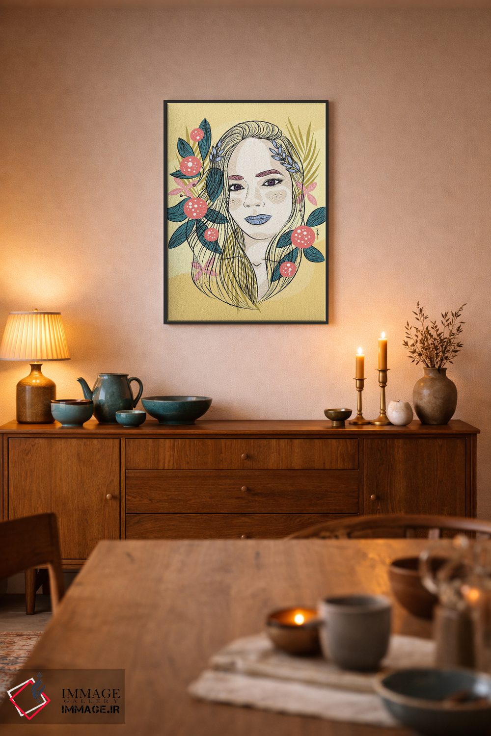 براساس پالت ترکیبی اثر، قاب تیک گرم (چوبی) پیشنهاد اول است و مشکی مات (فریم متوسط) مکمل. برای سفارشهای پروژهای با ابعاد و قابهای اختصاصی با ایماژ در تماس باشید.
