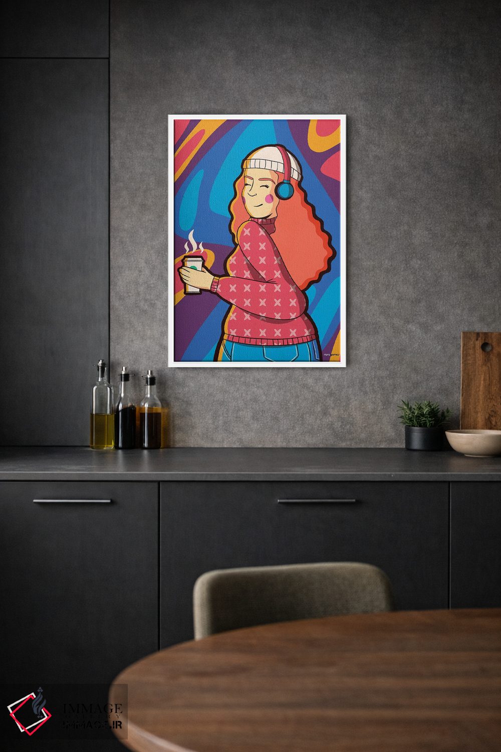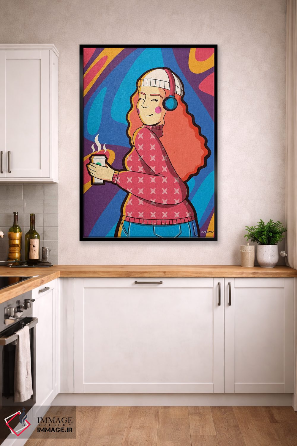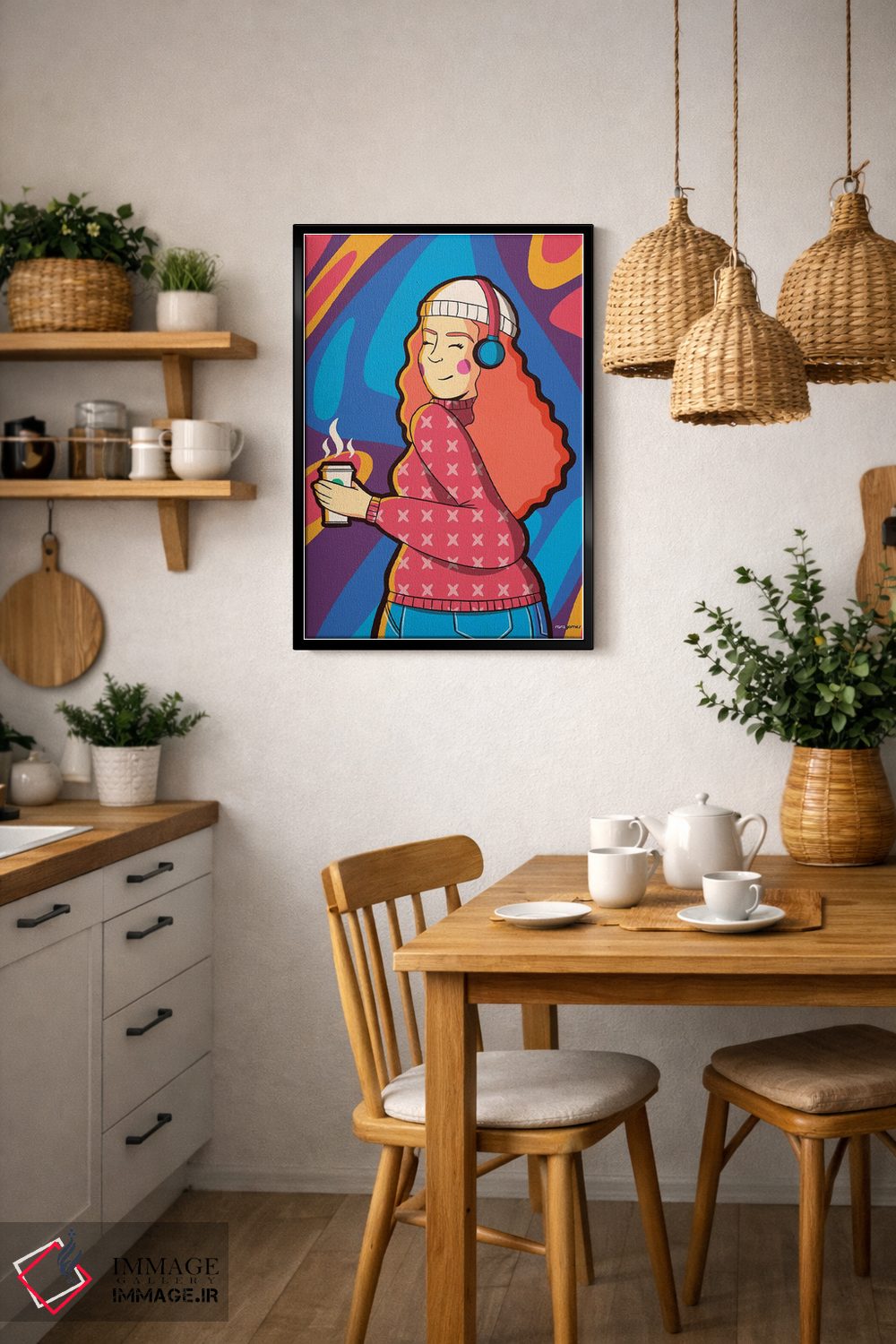 براساس پالت ترکیبی اثر، قاب تیک گرم (چوبی) پیشنهاد اول است و مشکی مات (فریم متوسط) مکمل. برای سفارشهای پروژهای با ابعاد و قابهای اختصاصی با ایماژ در تماس باشید.