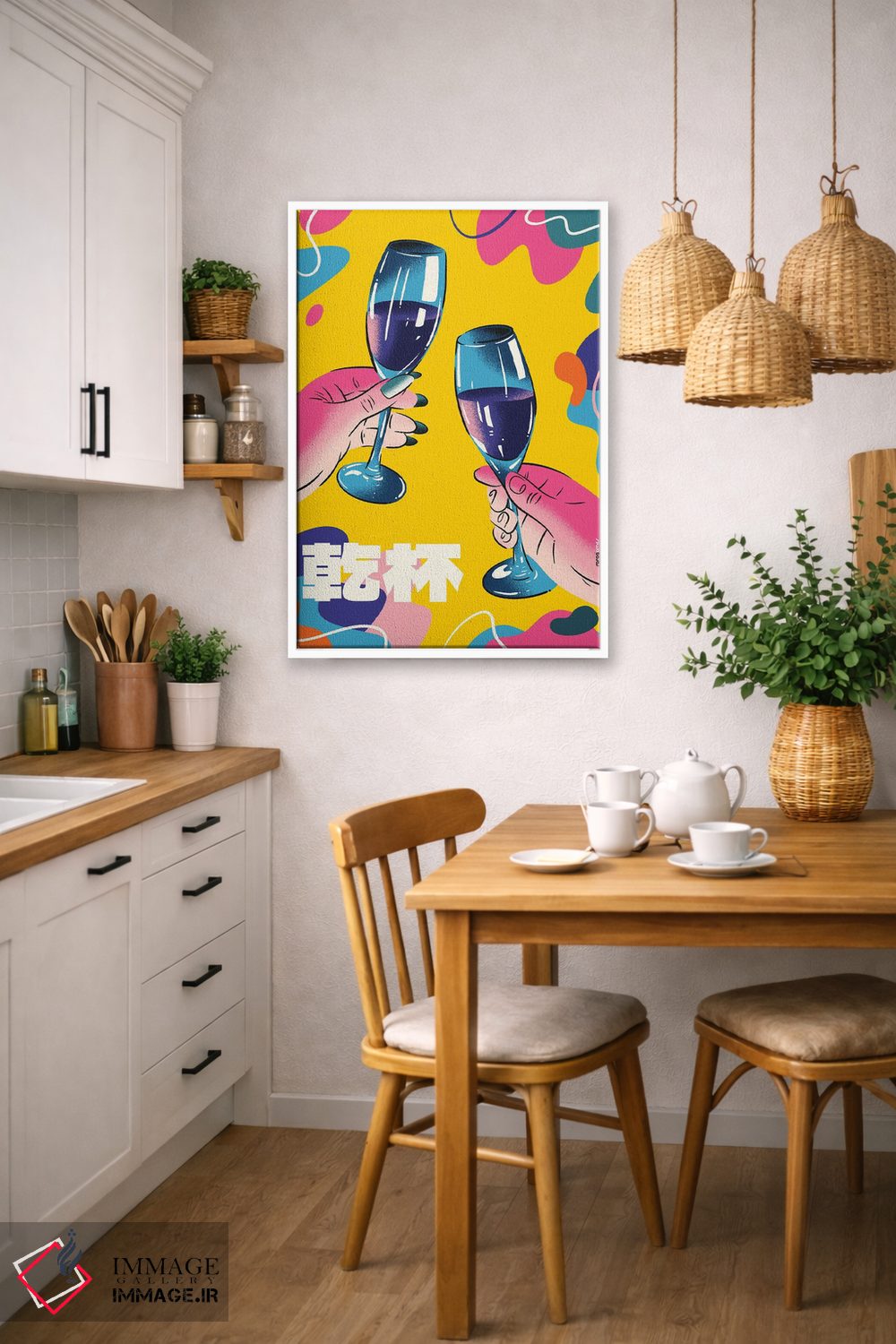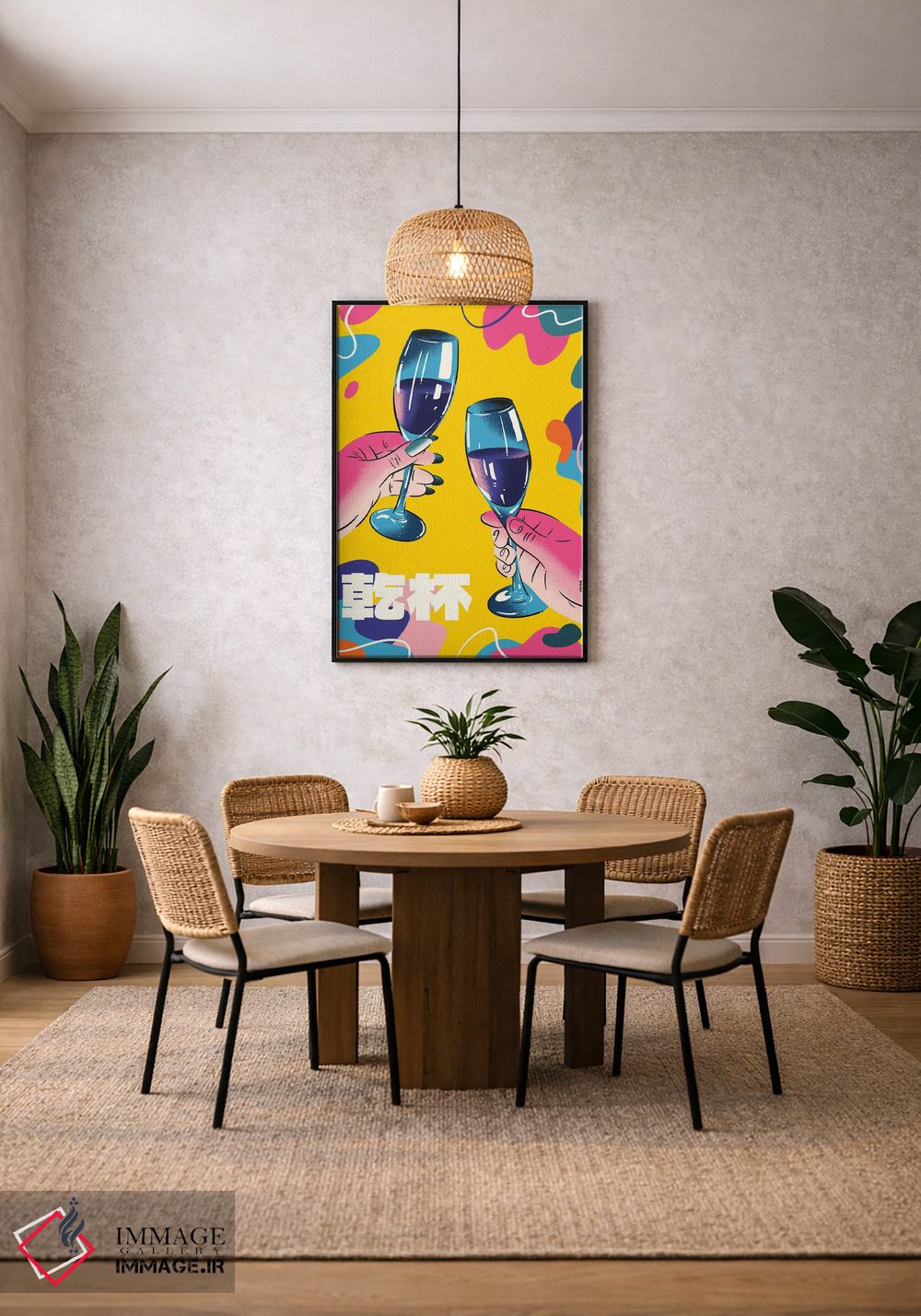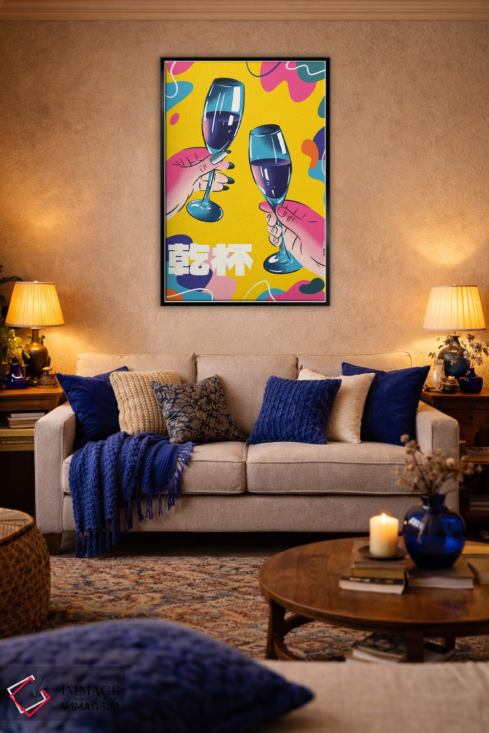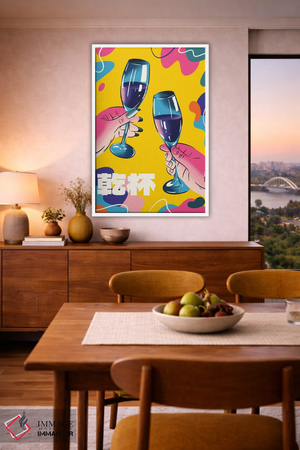 این تابلو با عنوان «شامپاین رنگارنگ» اثرِ «رافائل گومز»، حسِ گرم و صمیمی به فضا میدهد.