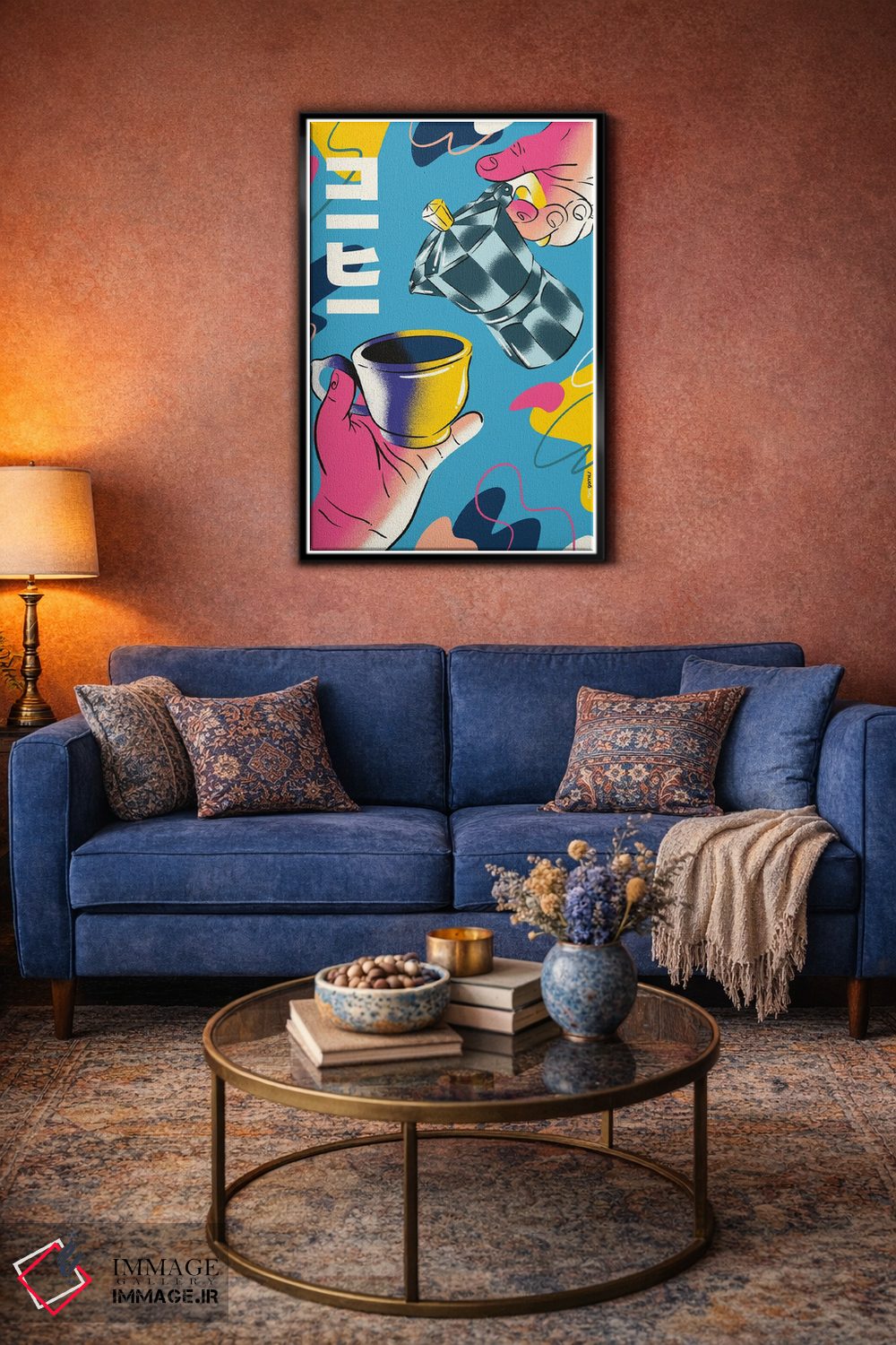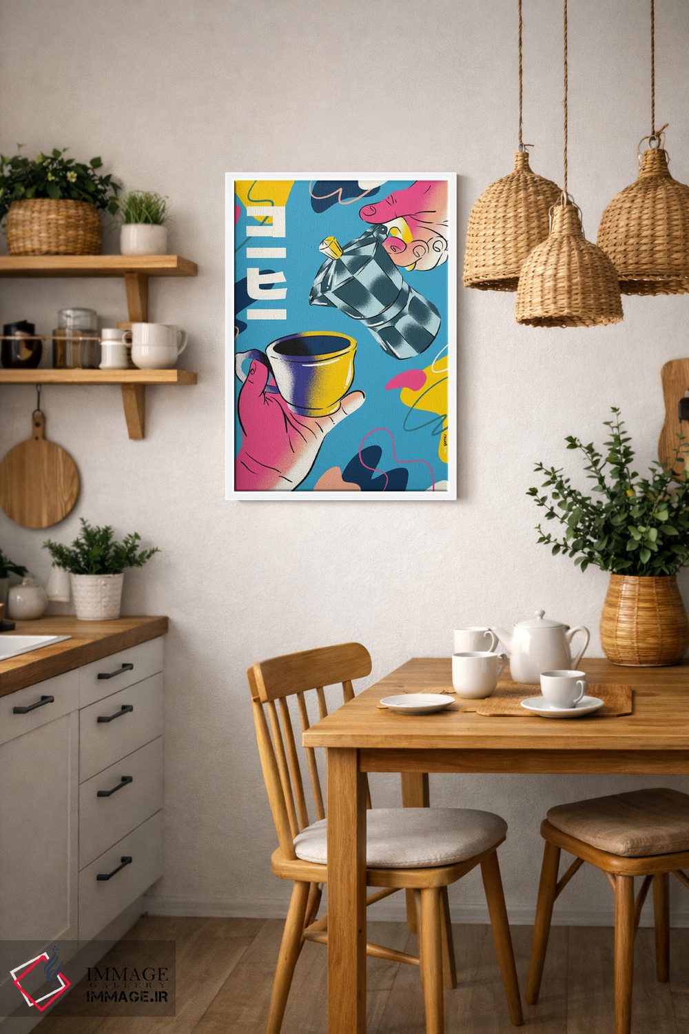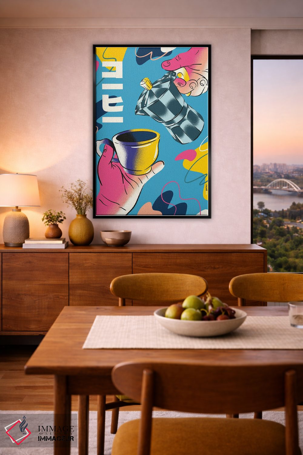 براساس پالت ترکیبی اثر، قاب تیک گرم (چوبی) پیشنهاد اول است و مشکی مات (فریم متوسط) مکمل. برای سفارشهای پروژهای با ابعاد و قابهای اختصاصی با ایماژ در تماس باشید.