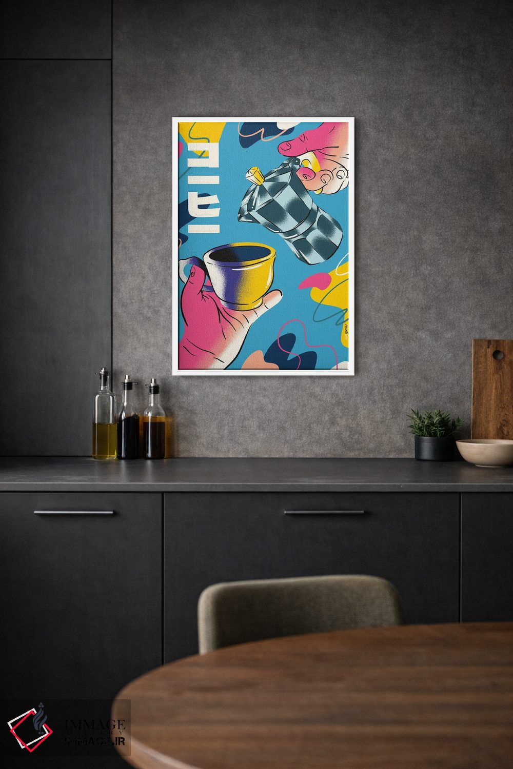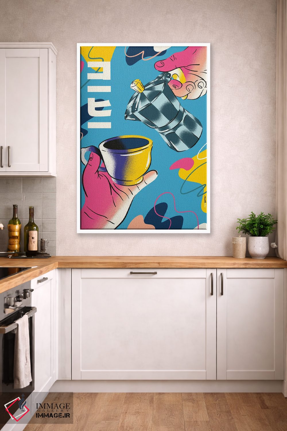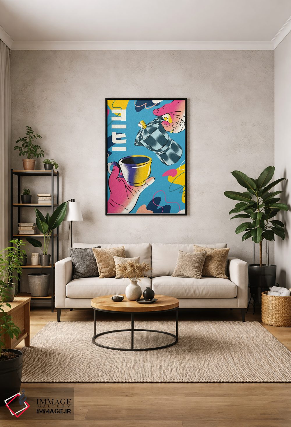 براساس پالت ترکیبی اثر، قاب تیک گرم (چوبی) پیشنهاد اول است و مشکی مات (فریم متوسط) مکمل. برای سفارشهای پروژهای با ابعاد و قابهای اختصاصی با ایماژ در تماس باشید.