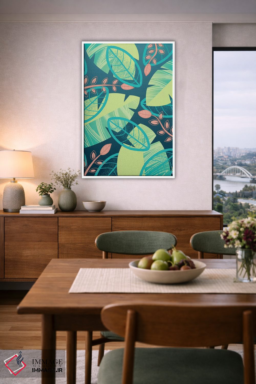 برای فضاهایی که به لطافت نیاز دارند، «برزیل گلها شماره ۱» اثرِ «رافائل گومز» تعادل رنگیِ لطیفی به چیدمان میدهد؛ برای فضای غذاخوری انتخابی خوشسلیقه است. با قاب روشن یا چوبی، حس طبیعیتری پیدا میکند.