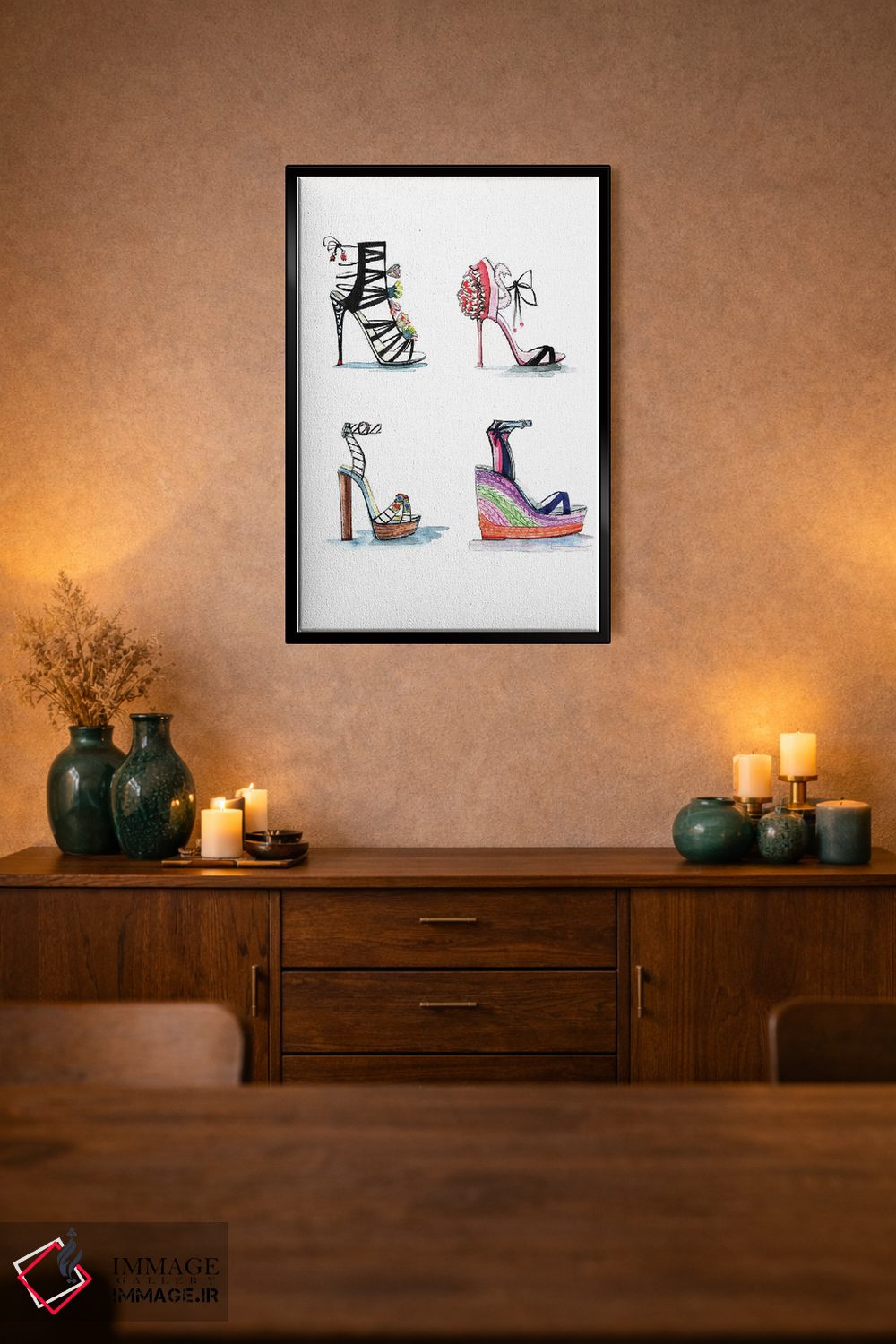 براساس پالت گرم اثر، قاب تیک گرم (چوبی) پیشنهاد اول است و مشکی مات (فریم متوسط) مکمل. برای سفارشهای پروژهای با ابعاد و قابهای اختصاصی با ایماژ در تماس باشید.