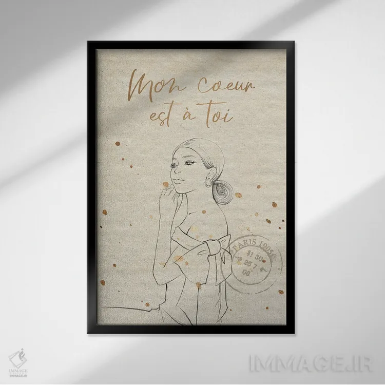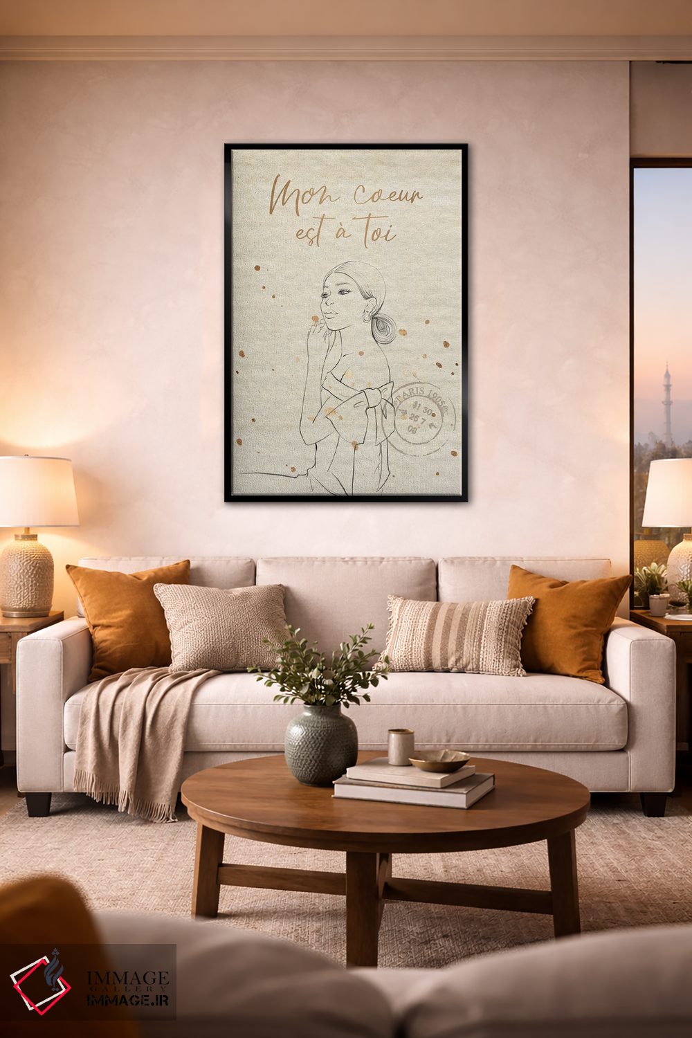 براساس پالت گرم اثر، قاب بلوط روشن (چوبی) پیشنهاد اول است و استخوانی ملایم مکمل. برای سفارشهای پروژهای با ابعاد و قابهای اختصاصی با ایماژ در تماس باشید.