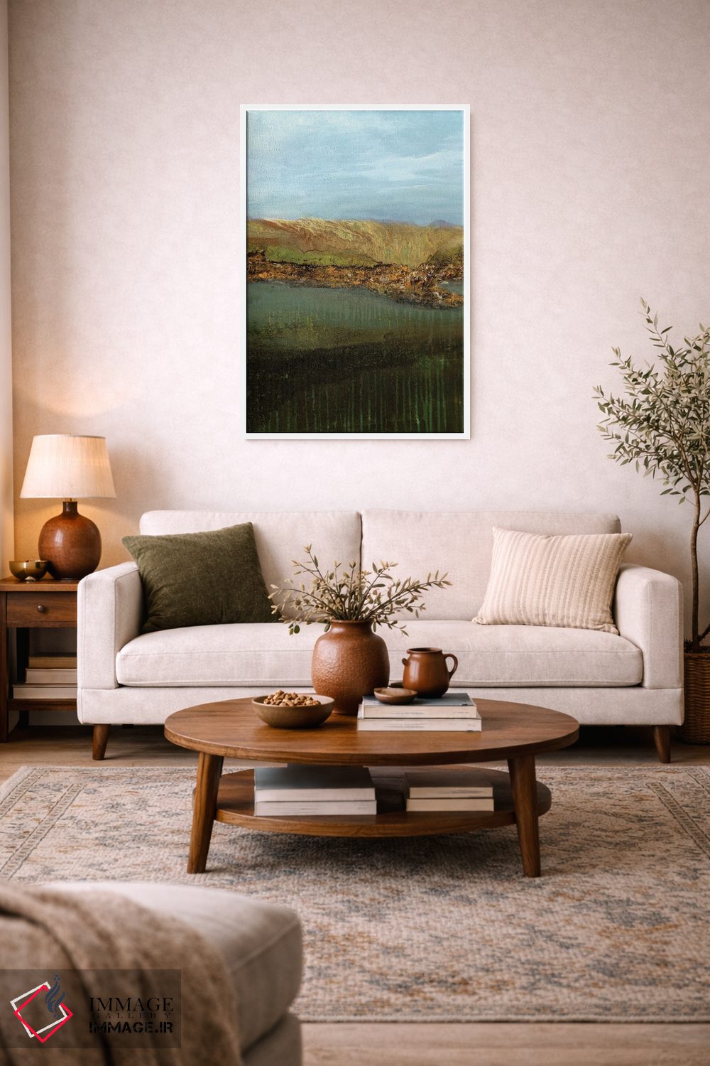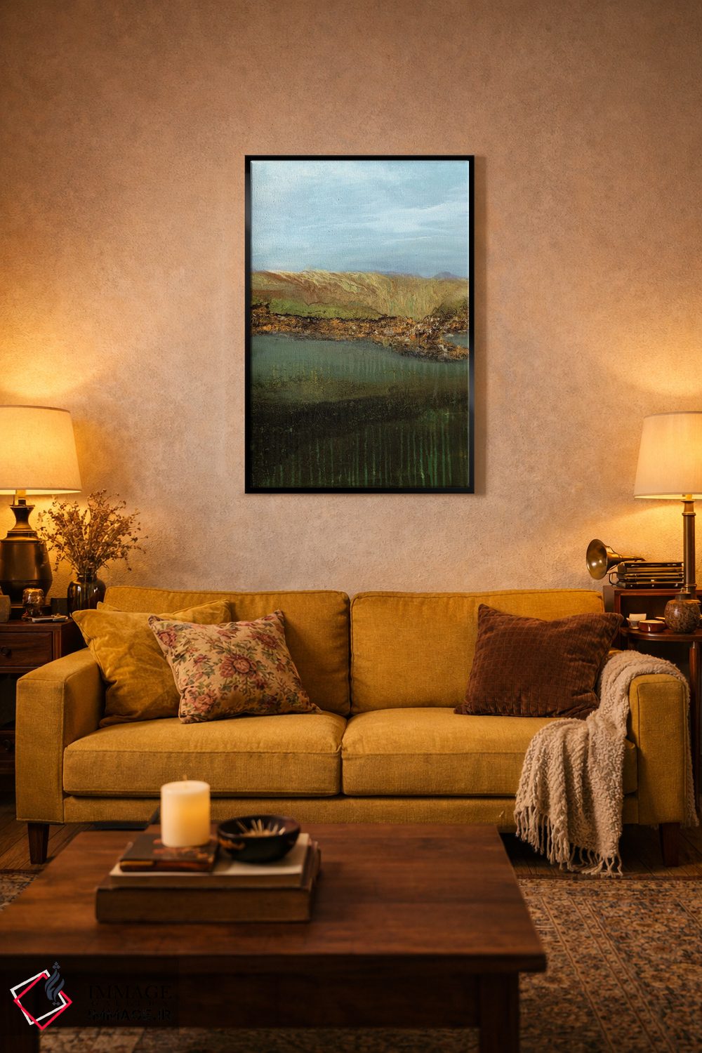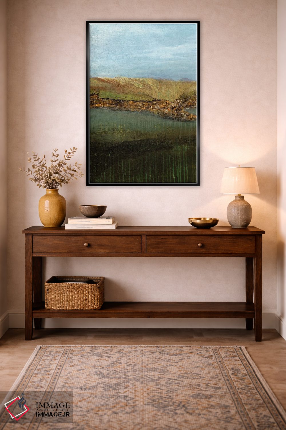 براساس پالت ترکیبی اثر، قاب تیک گرم (چوبی) پیشنهاد اول است و مشکی مات (فریم متوسط) مکمل. برای سفارشهای پروژهای با ابعاد و قابهای اختصاصی با ایماژ در تماس باشید.