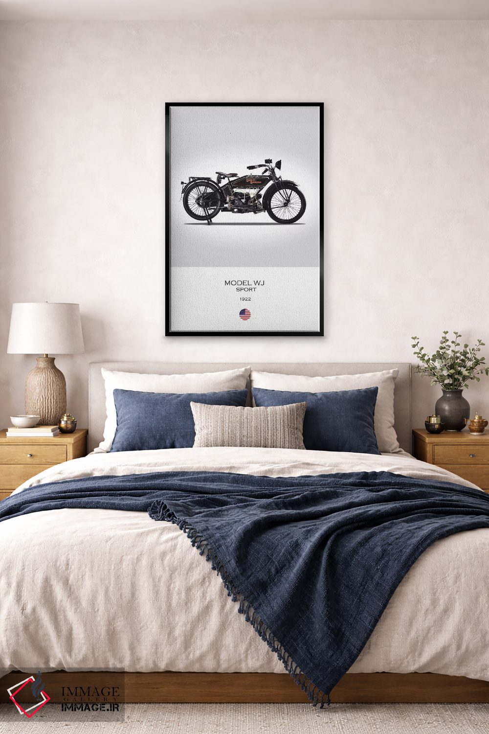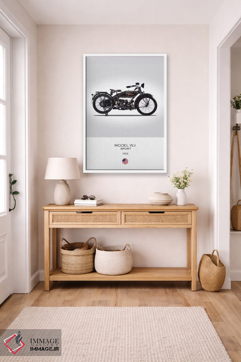 برای دیواری که میخواهید سلیقهتان را آرام و دقیق نشان بدهد، «موتورسیکلت هارلی—دیویدسون مدل WJ سال ۱۹۲۲» اثرِ «مارک روگان» به فضا، روایت ملایم و قابل لمس میدهد؛ برای راهروها و ورودیهای مینیمال پیشنهاد میشود. با مبلمان خنثی، تضاد دلنشینی میسازد.
