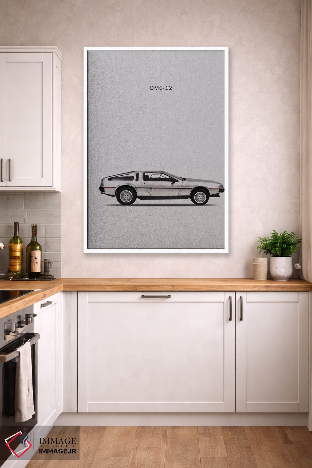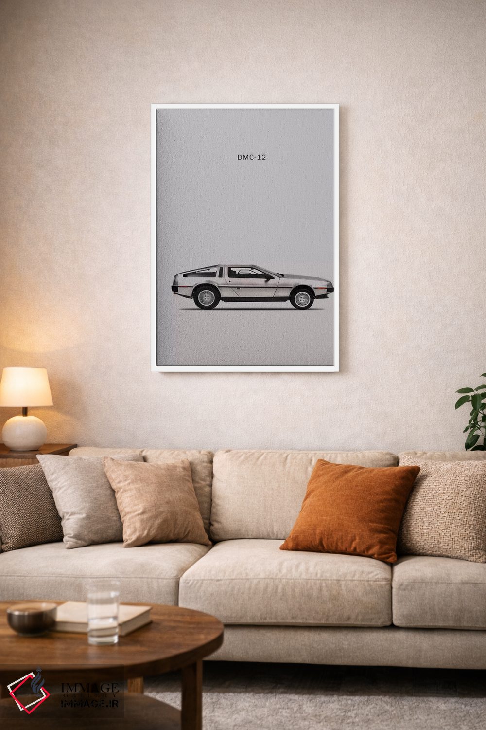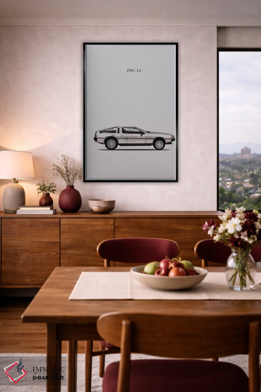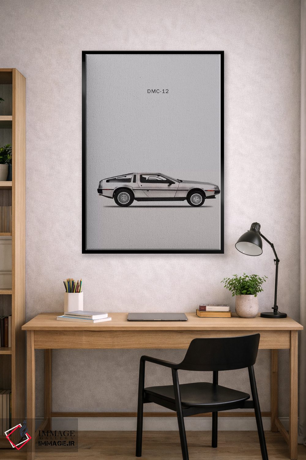 «دلورین DMC—12 مدل ۱۹۸۱» اثرِ «مارک روگان» کنار پوسترها و قابهای ساده، یک ترکیب دلنشین و متعادل میسازد.