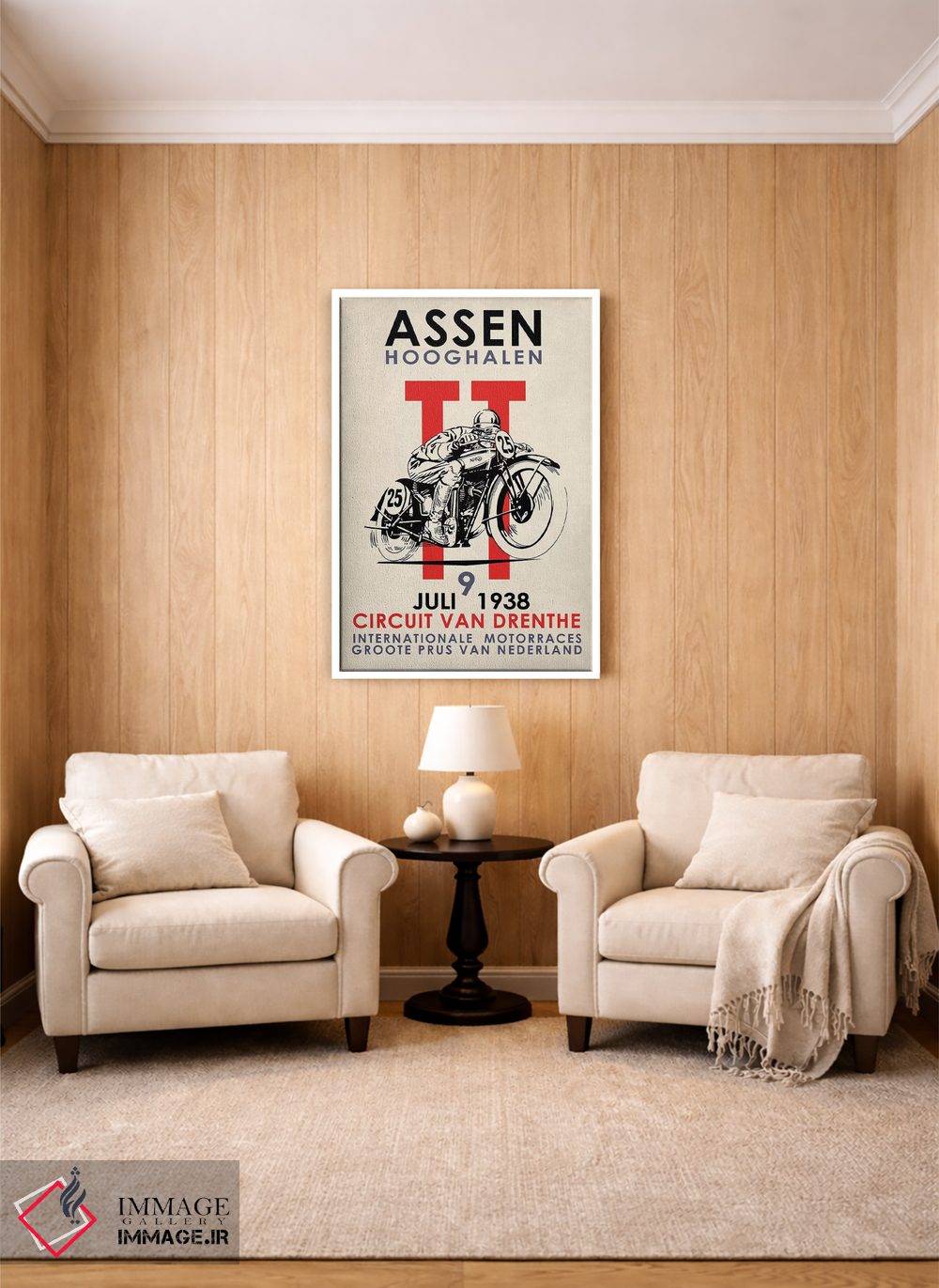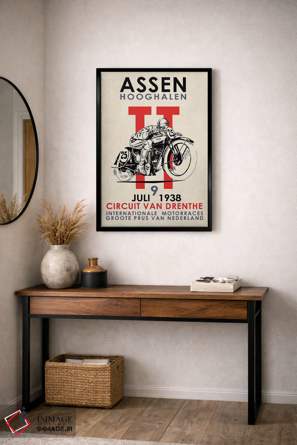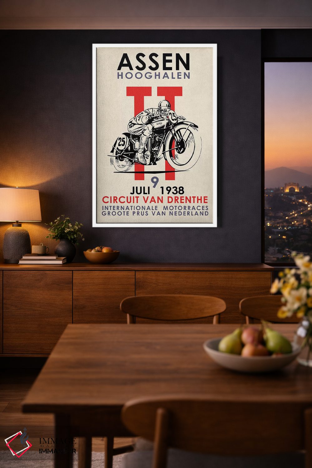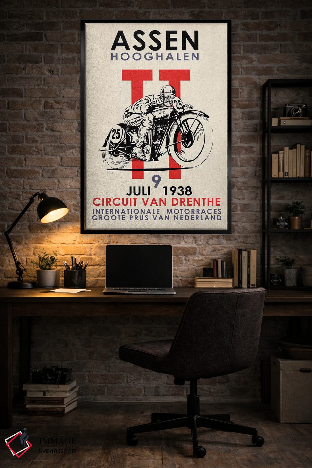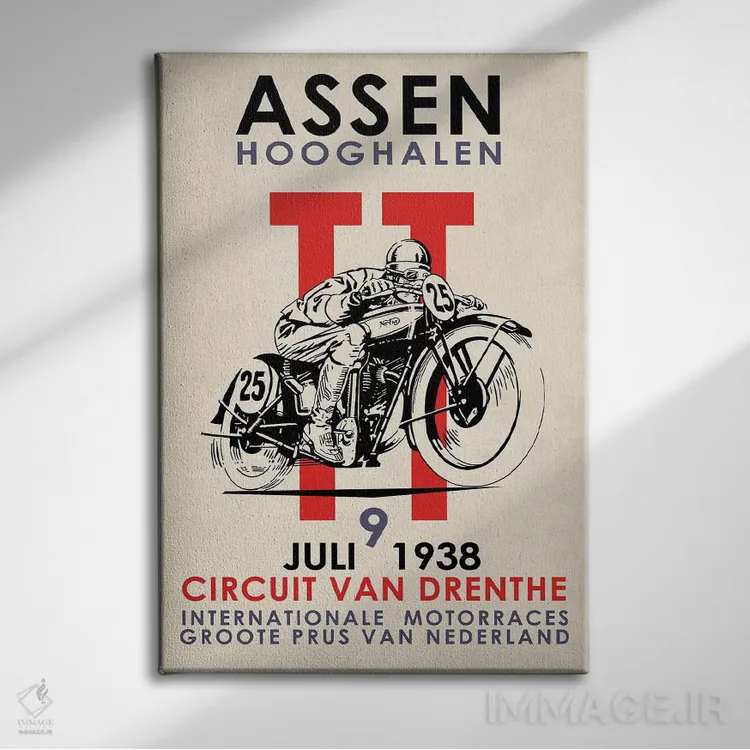 اگر دیوارِ راهرو یا گوشهی مطالعه نیاز به یک قاب خوشانرژی دارد، «مسابقات موتورسواری اسن تیتی ۱۹۳۸» اثرِ «مارک روگان» با تم این اثر گزینهی مناسبی است.