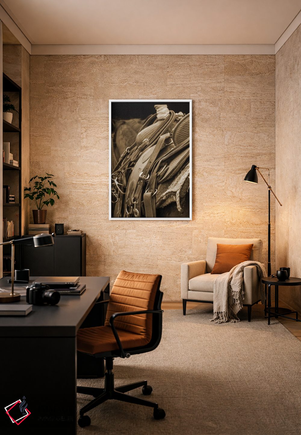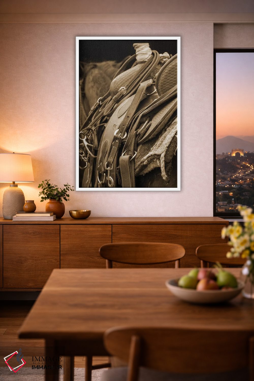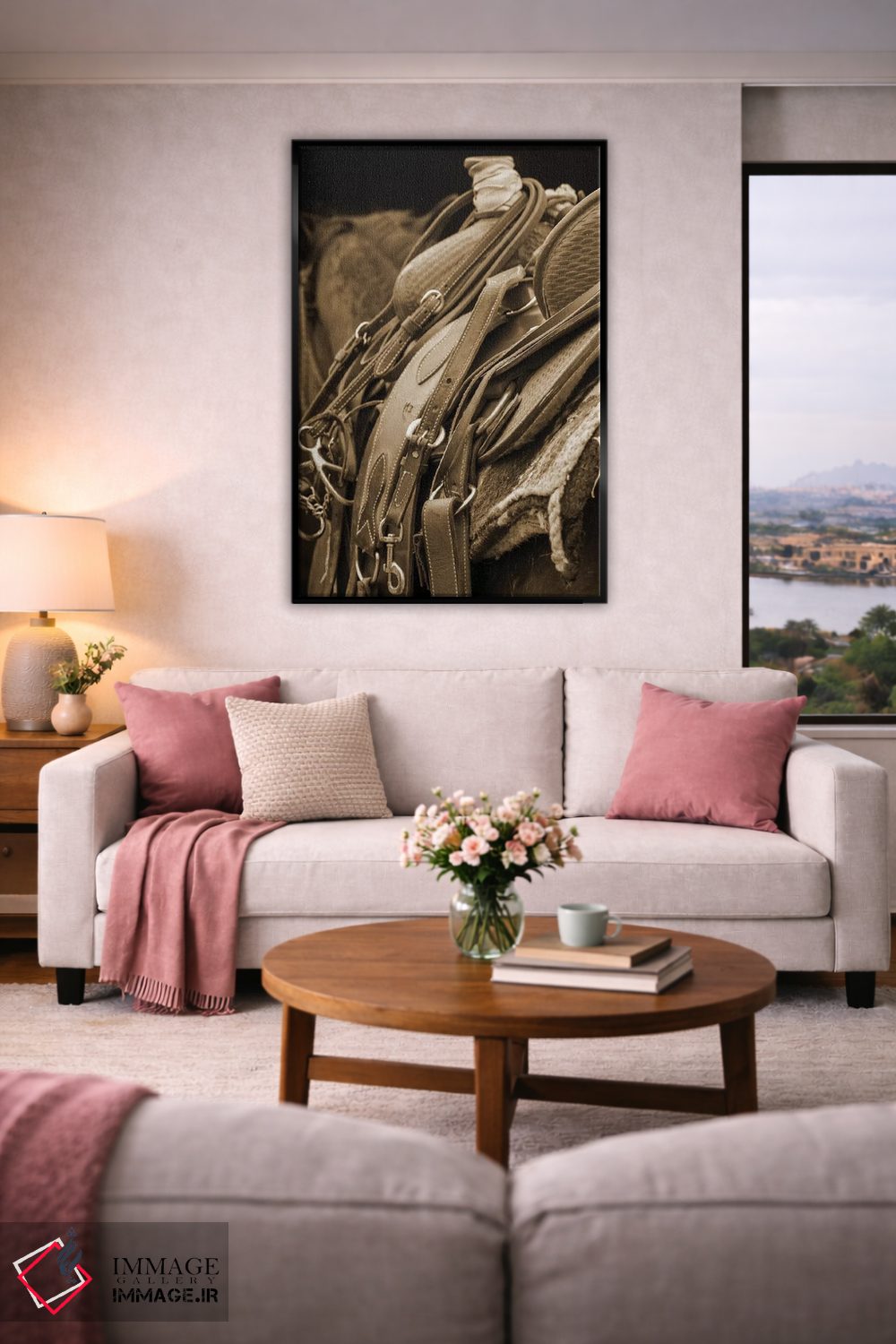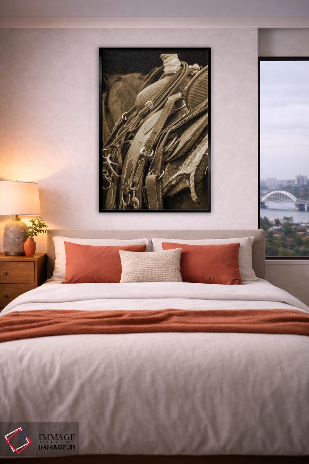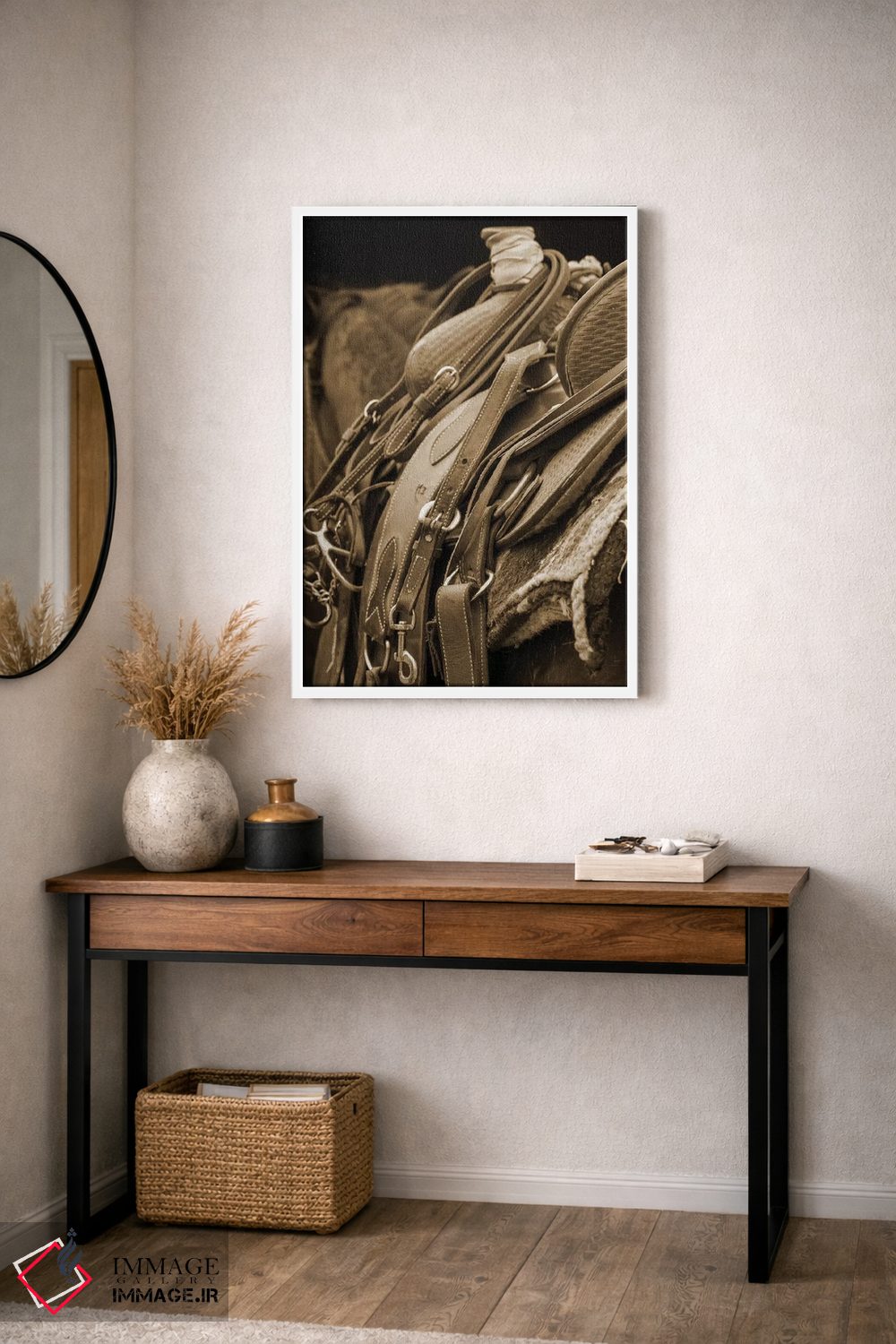براساس پالت گرم اثر، قاب بلوط روشن (چوبی) پیشنهاد اول است و استخوانی ملایم مکمل. برای سفارشهای پروژهای با ابعاد و قابهای اختصاصی با ایماژ در تماس باشید.