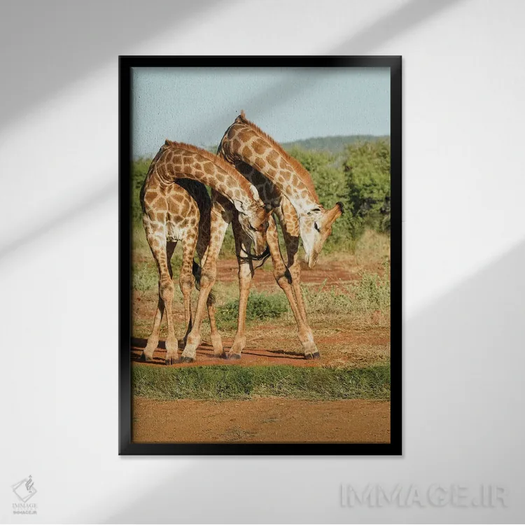 تابلو دکوراتیو زرافه های رقصان آفریقایی اثر رندا تامپسون - نمای قاب‌دار مشکی