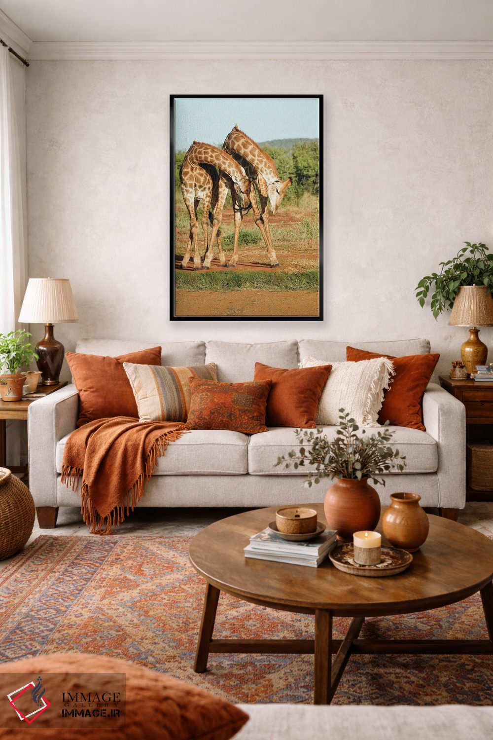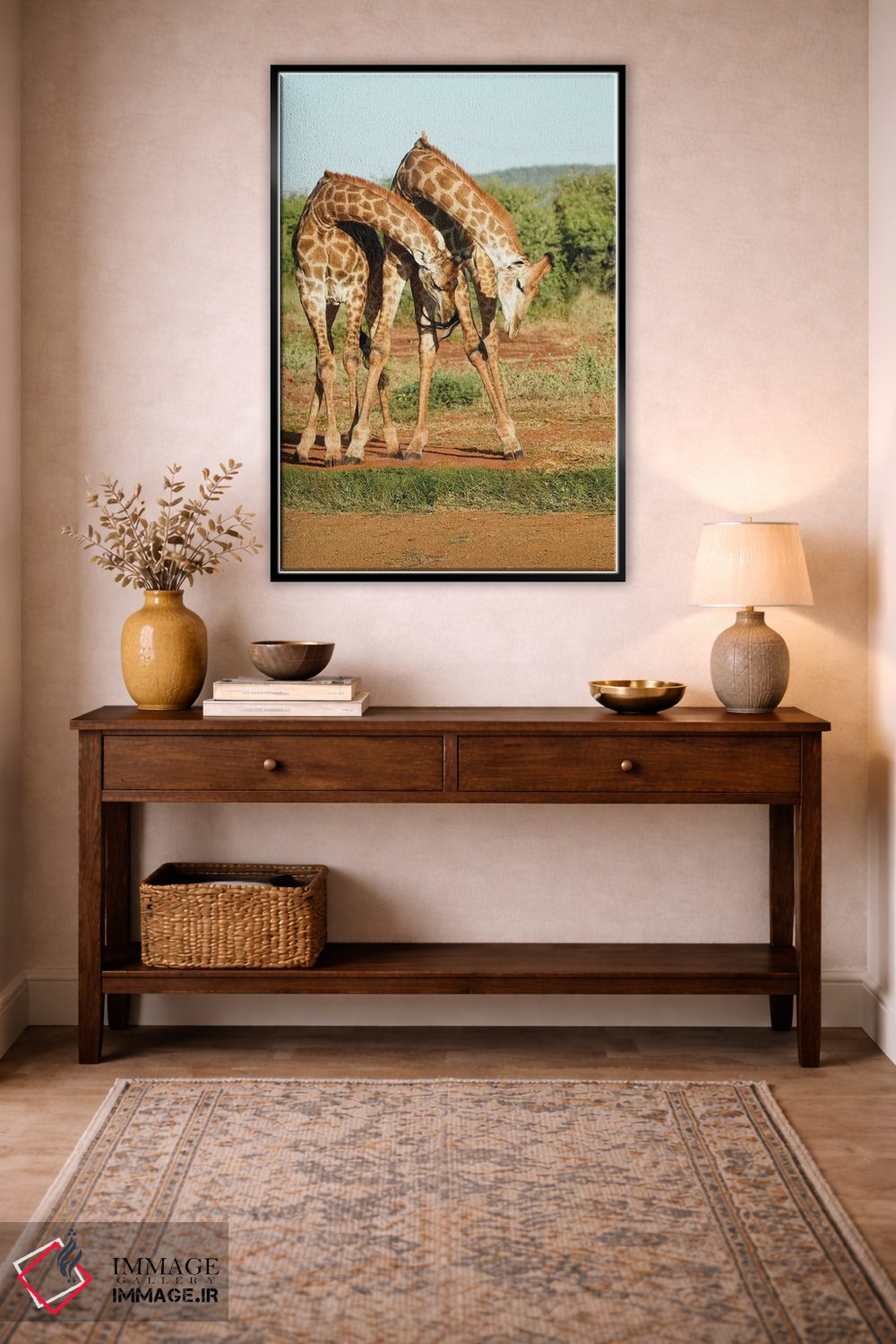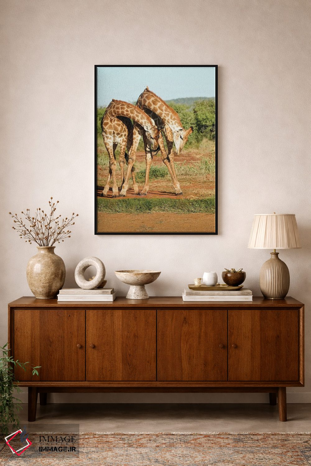تابلو دکوراتیو زرافه های رقصان آفریقایی اثر رندا تامپسون - نمای روبه‌رو روی دیوار