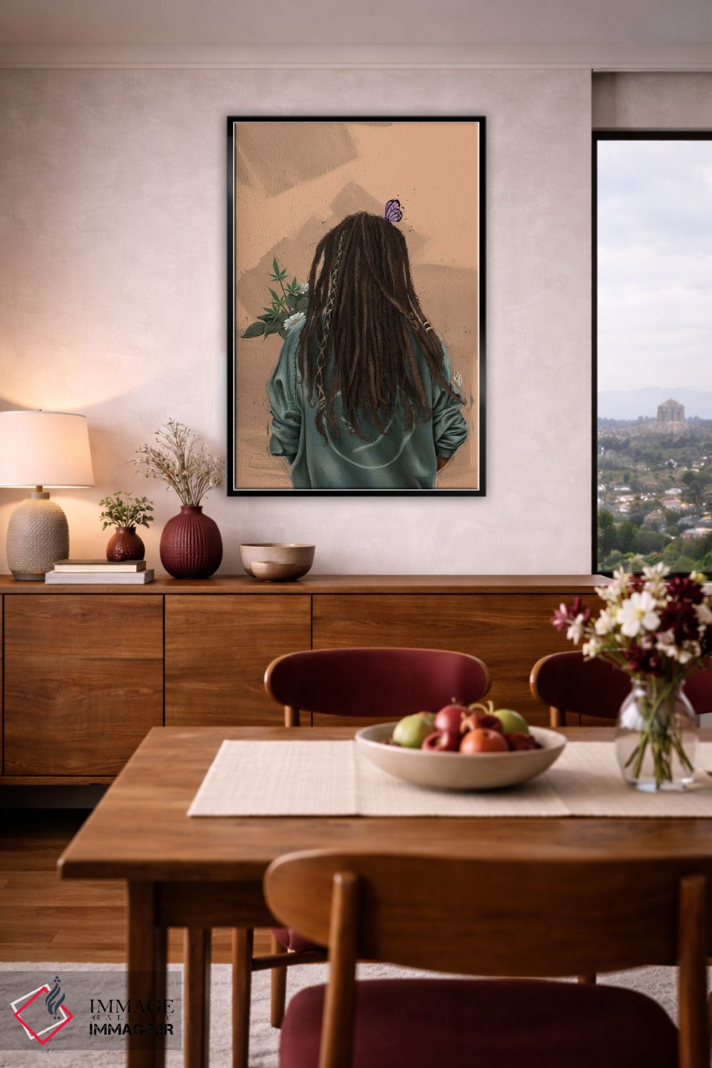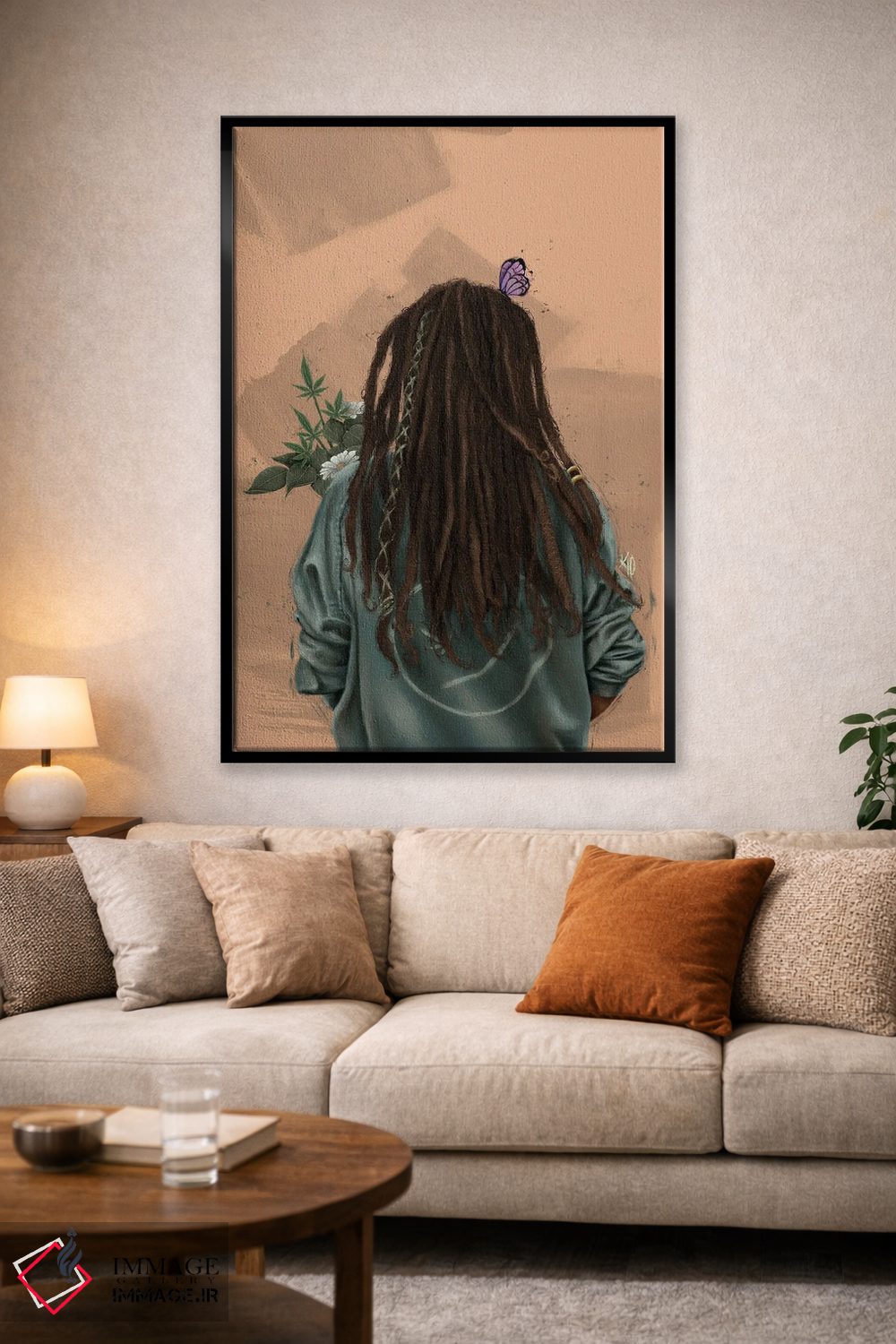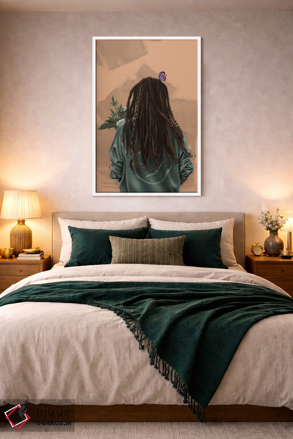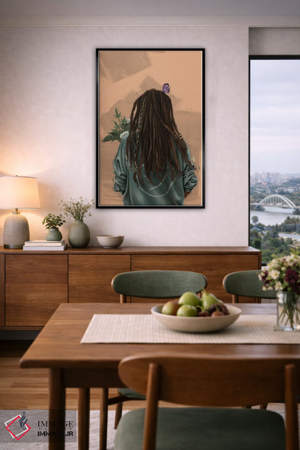 براساس پالت گرم اثر، قاب بلوط روشن (چوبی) پیشنهاد اول است و استخوانی ملایم مکمل. برای سفارشهای پروژهای با ابعاد و قابهای اختصاصی با ایماژ در تماس باشید.