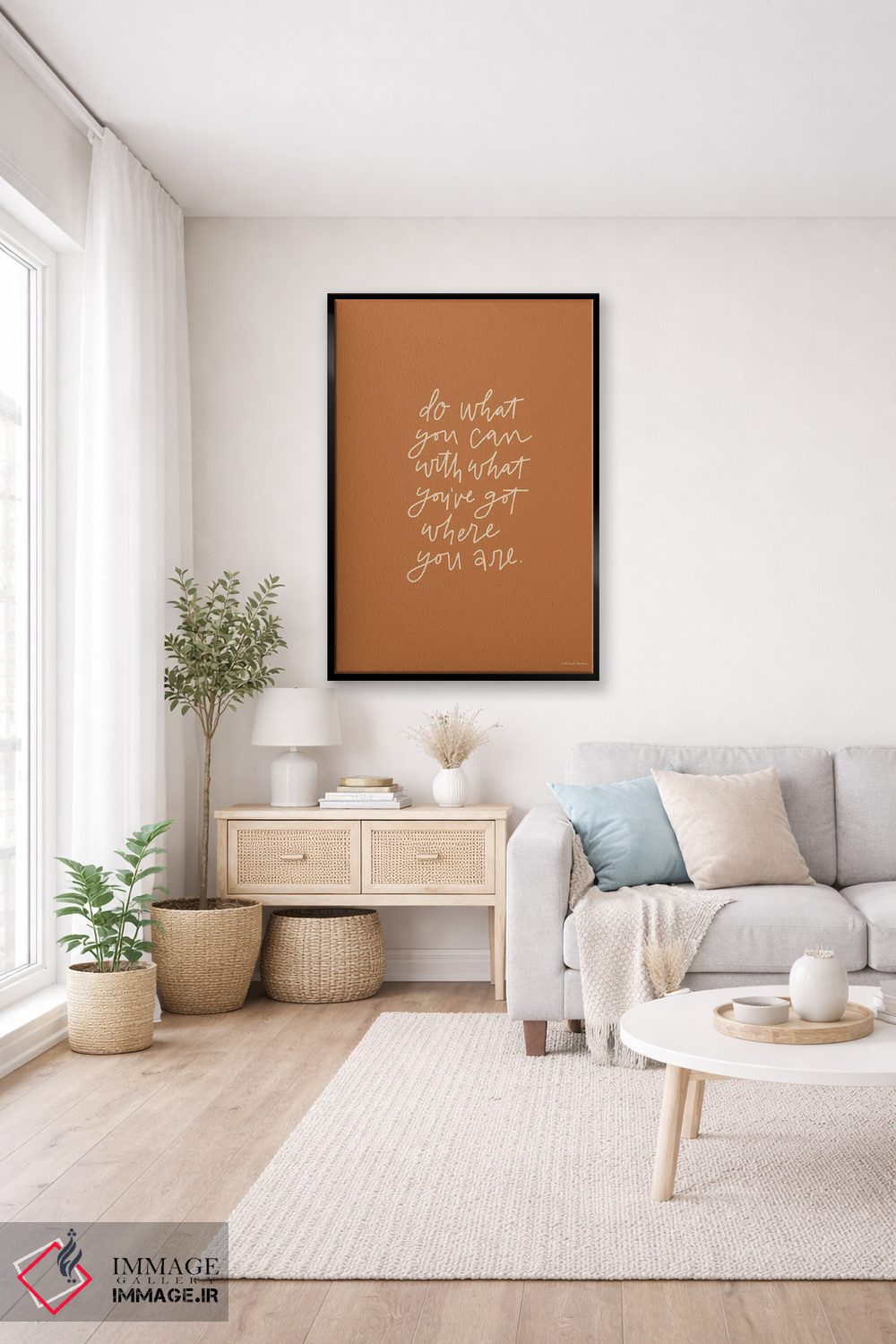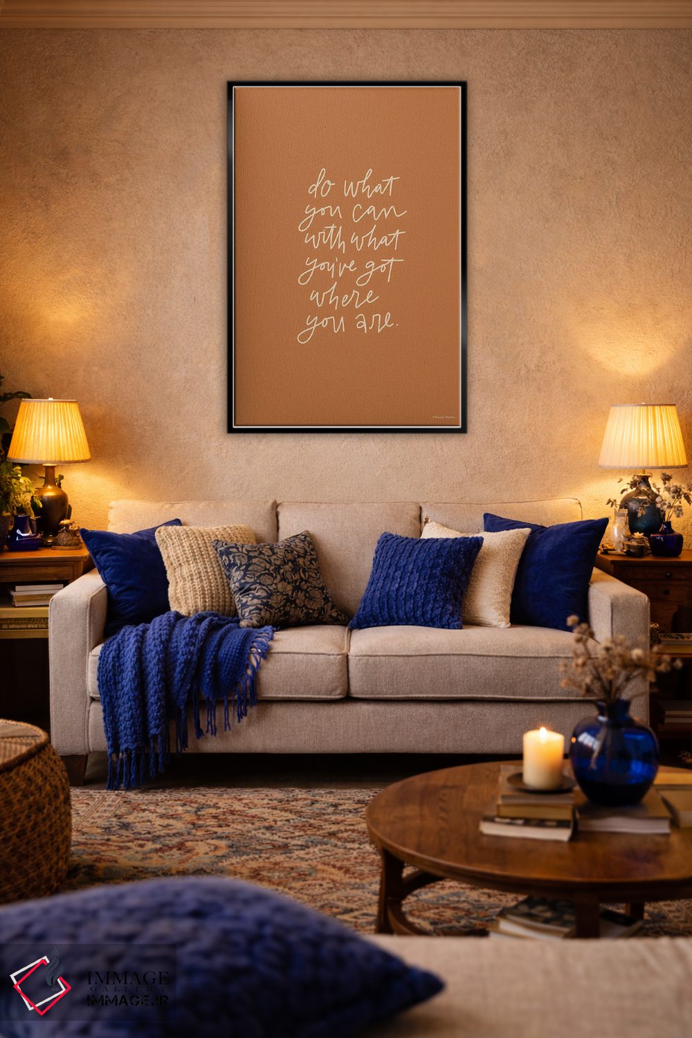 براساس پالت گرم اثر، قاب بلوط روشن (چوبی) پیشنهاد اول است و استخوانی ملایم مکمل. برای سفارشهای پروژهای با ابعاد و قابهای اختصاصی با ایماژ در تماس باشید.