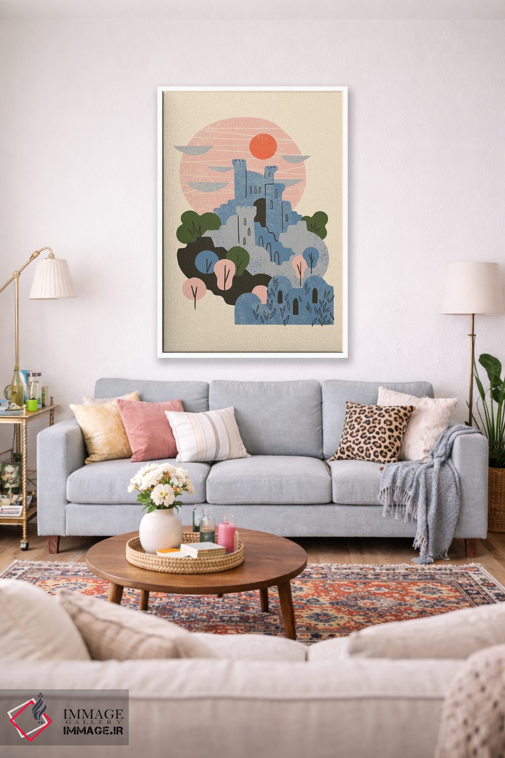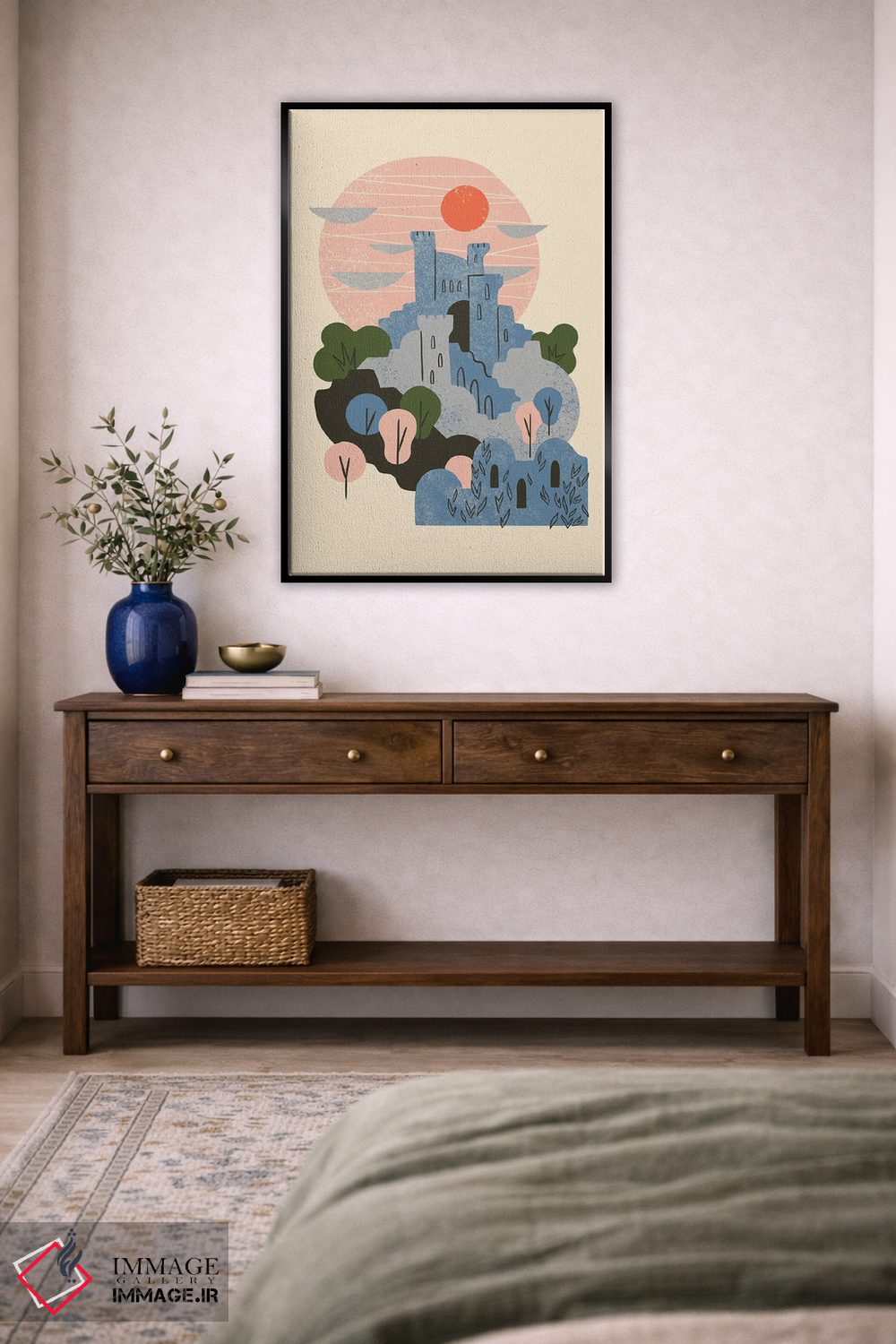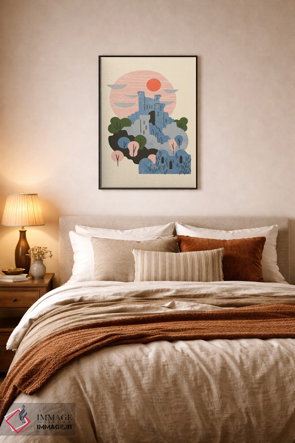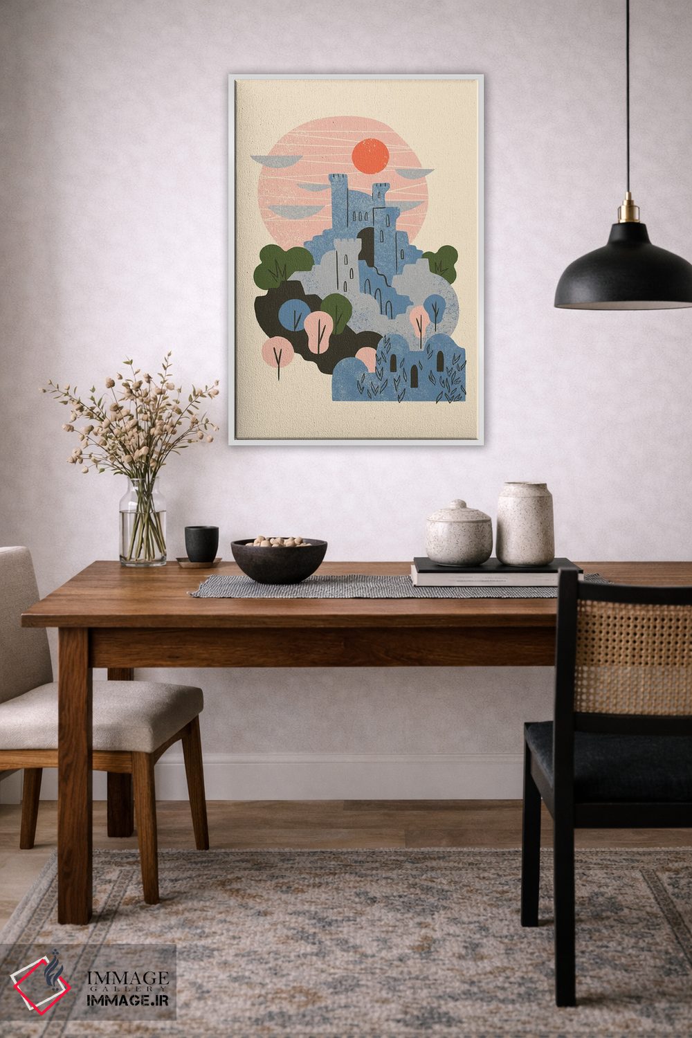 اگر به معماری و جزئیات سازه علاقه دارید، «قلعه آبی» اثرِ «رنیا ال. تول» اتاق را مرتبتر و منسجمتر نشان دهد، برای نشیمنهای مینیمال گزینهٔ مناسبیست. با نورپردازی خطی، خطوط اثر خواناتر هم میشود.