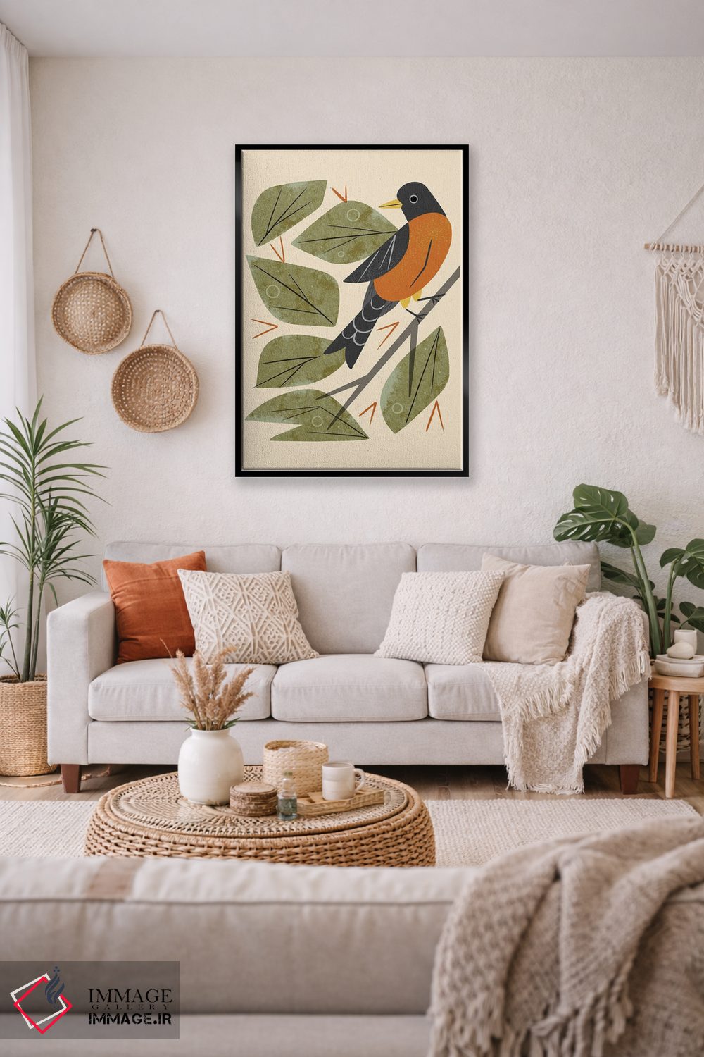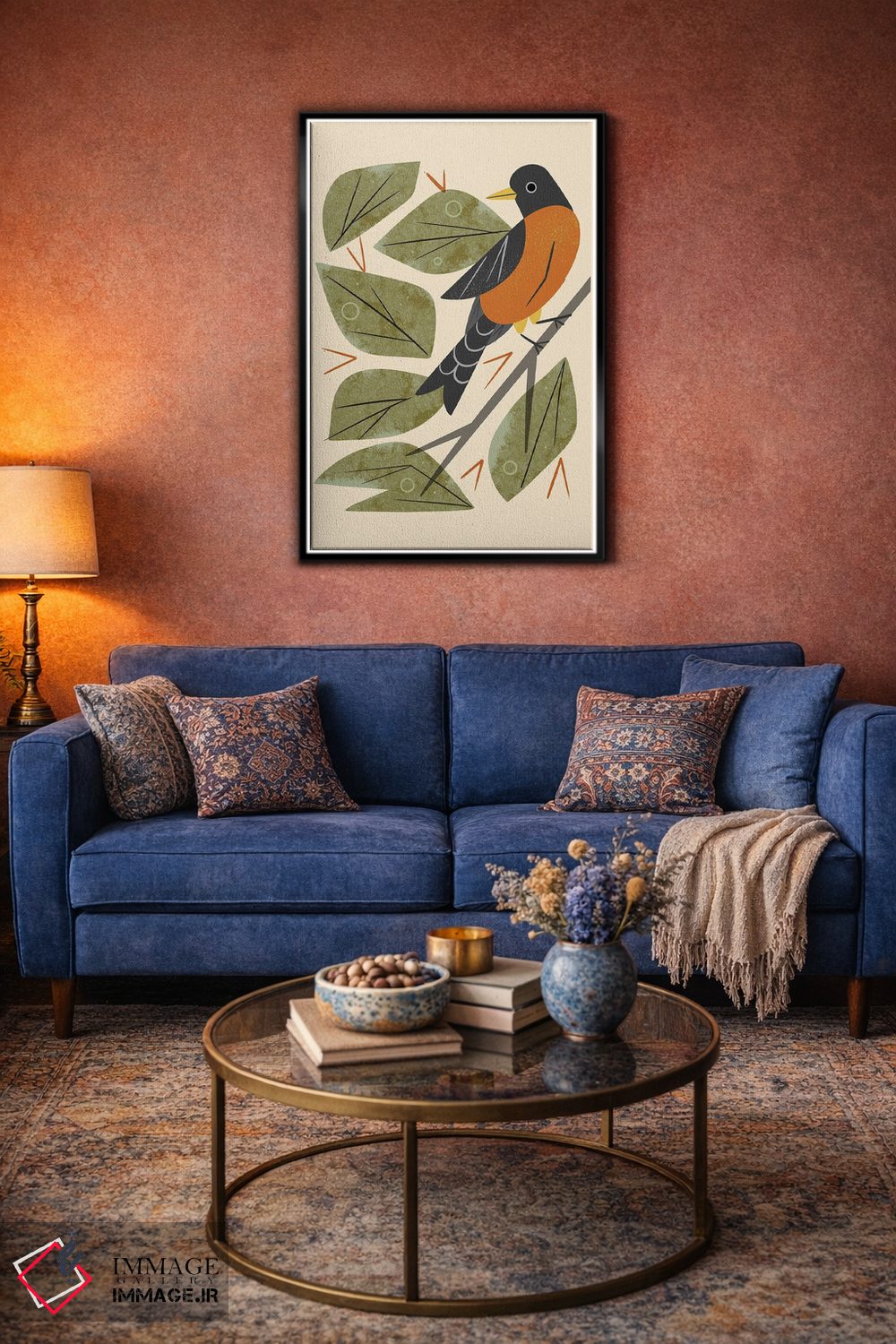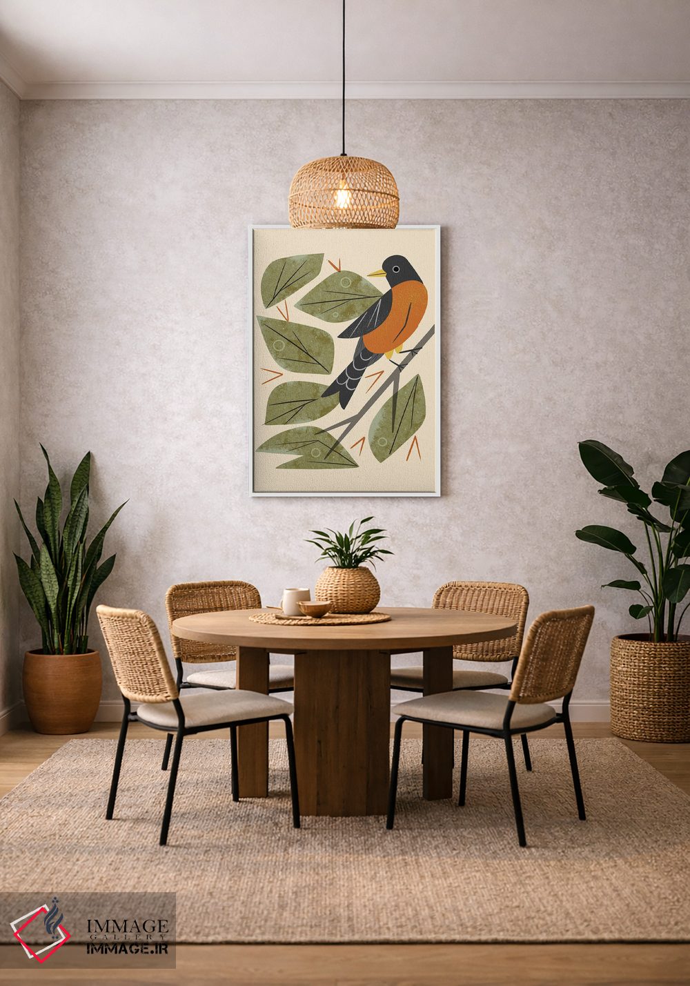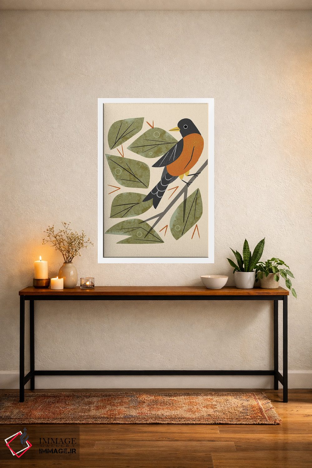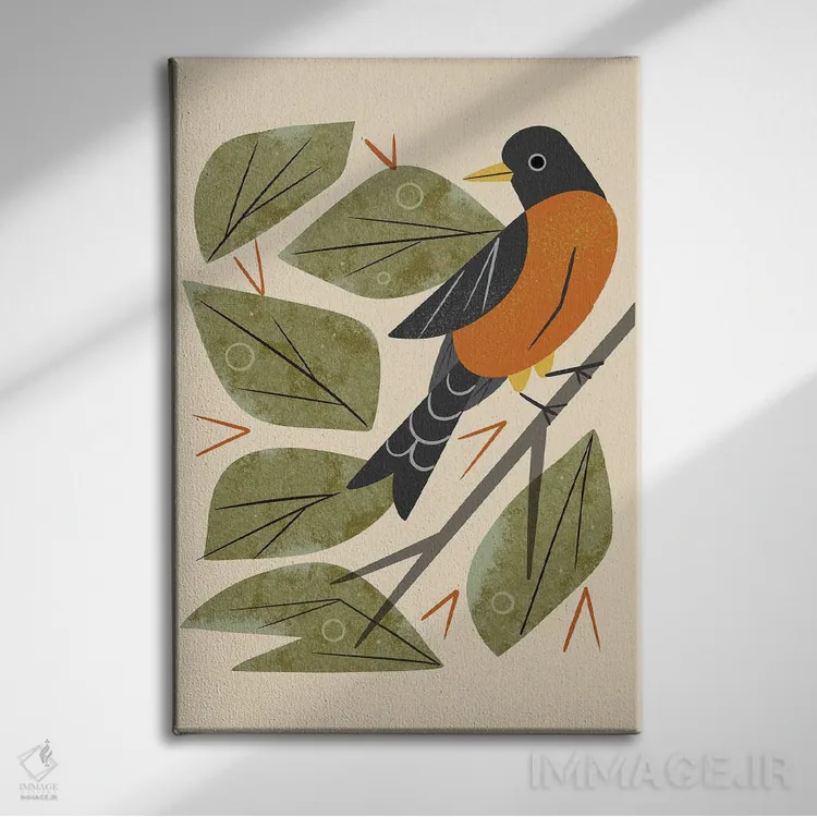 در «سینهسرخ نشسته» اثرِ «رنیا ال. تول»، حضور حیوانات به فضا، گرمیِ ملایم اضافه میکند؛ برای دیوار کنار میز کار انتخابی خوشسلیقه است. هم فضا را گرم میکند، هم شلوغش نمیکند.