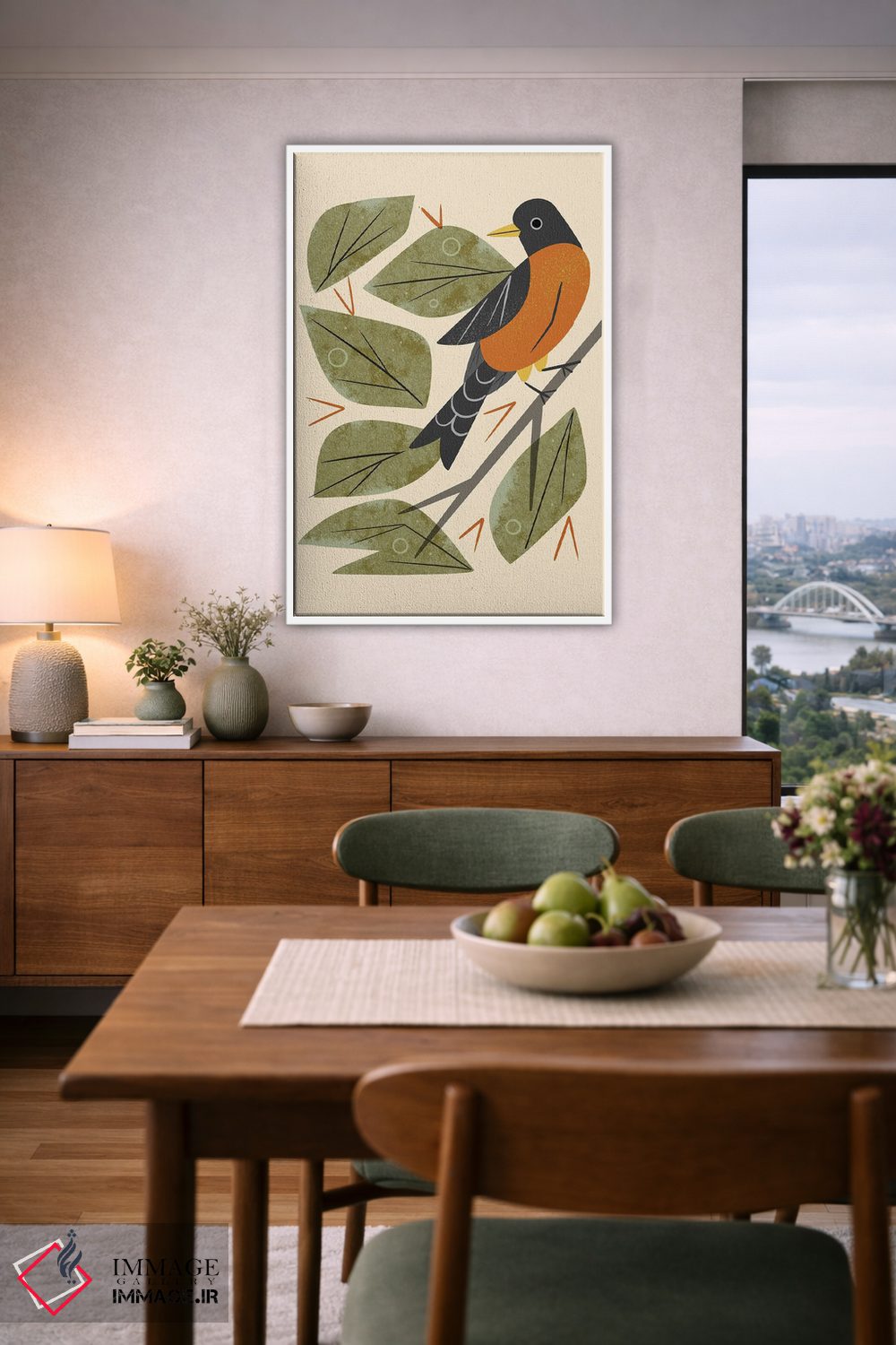 براساس پالت ترکیبی اثر، قاب بلوط روشن (چوبی) پیشنهاد اول است و استخوانی ملایم مکمل. برای سفارشهای پروژهای با ابعاد و قابهای اختصاصی با ایماژ در تماس باشید.