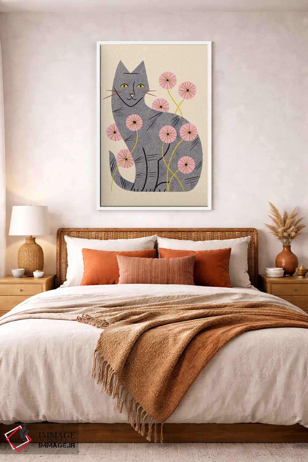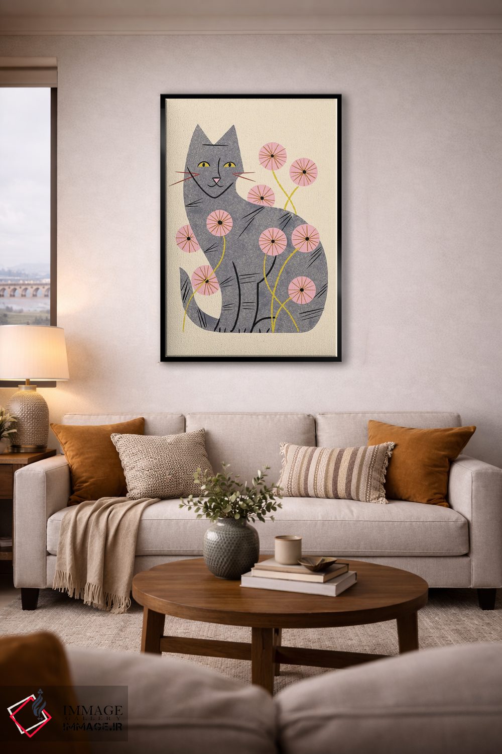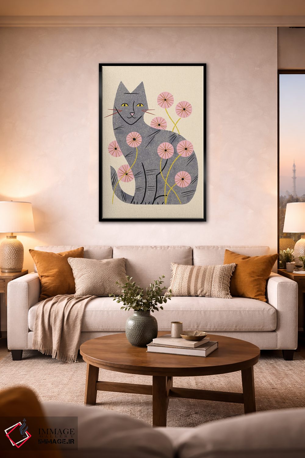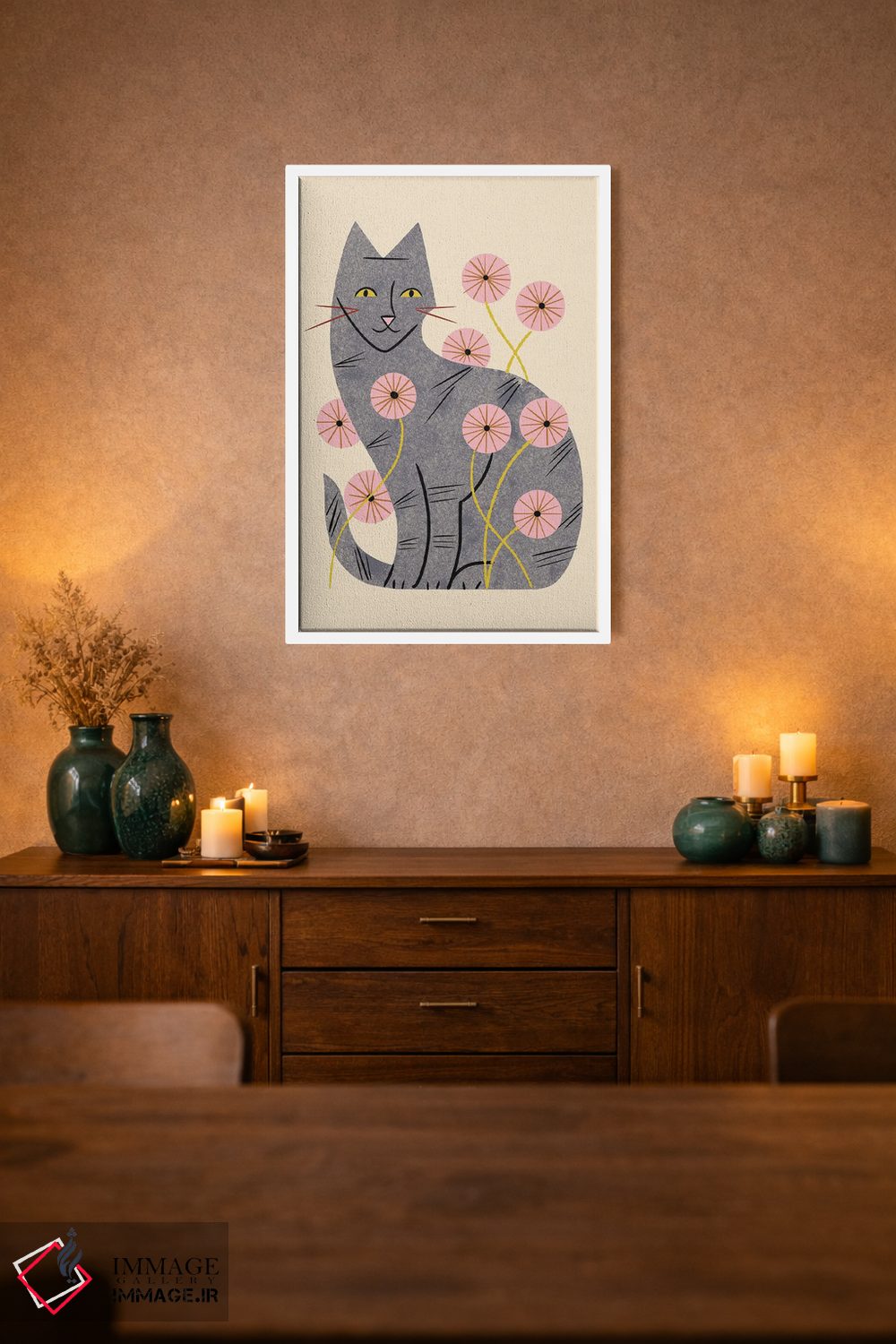 اگر به آثار حیوانات علاقه دارید، «گربه راهراه و گلهای وحشی» اثرِ «رنیا ال. تول» به فضا، گرمیِ ملایم اضافه میکند، برای فضاهای روستیک یا بوهو گزینهٔ مناسبیست. حسش صمیمی است، اما کیفیتش جدی و خوشپرداخت.